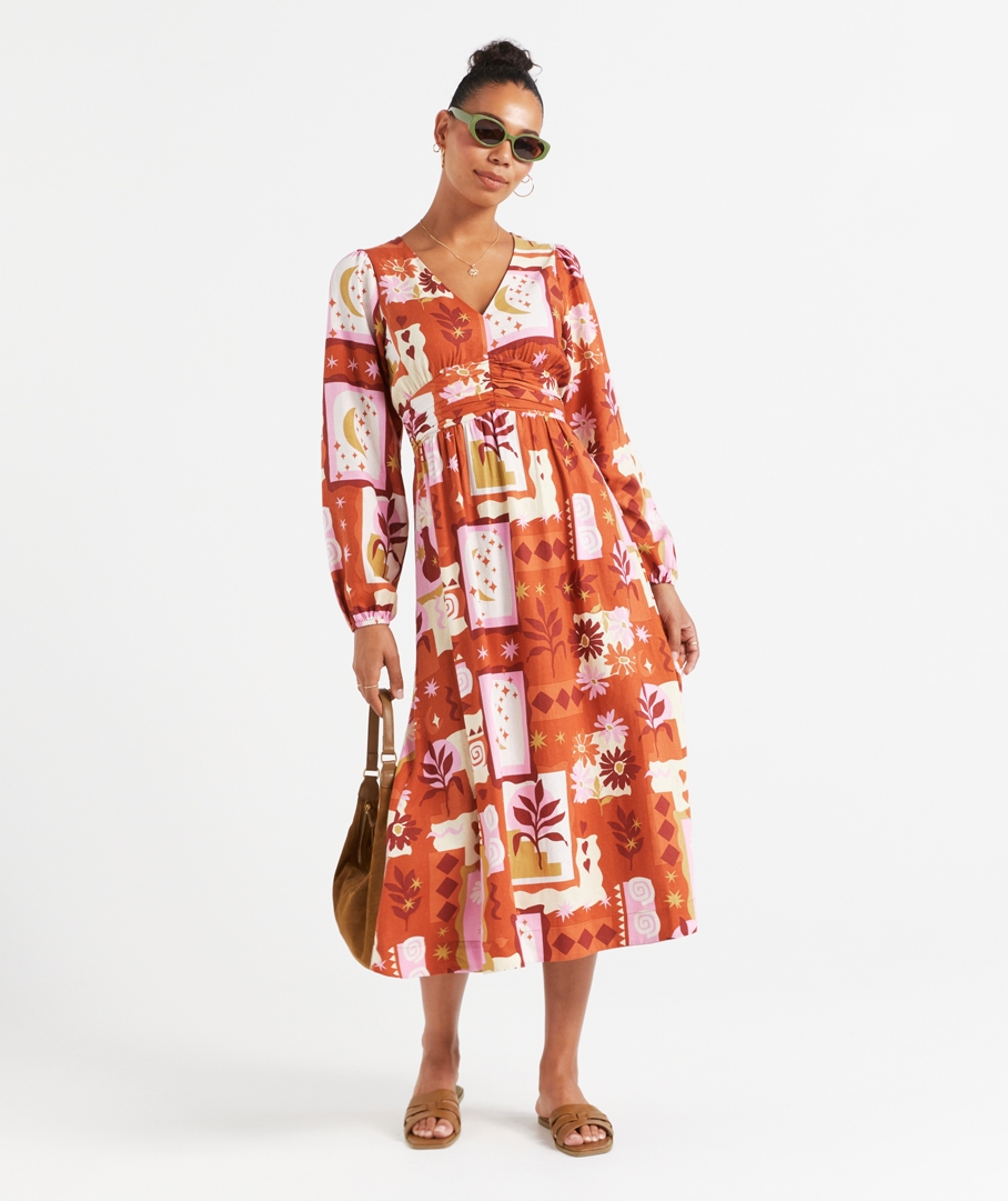 CHRISTINA RUCHED PRINTED MIDI DRESS