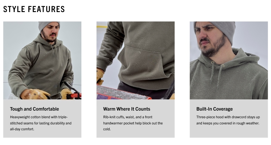 - COVERAGE YOU CAN COUNT ON: Hit the jobsite in a three-piece hood featuring an adjustable drawcord that stays put through rough weather, whether you wear it alone or under a men’s winter jacket.
