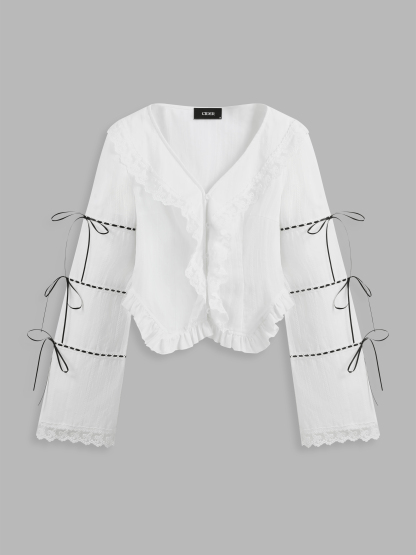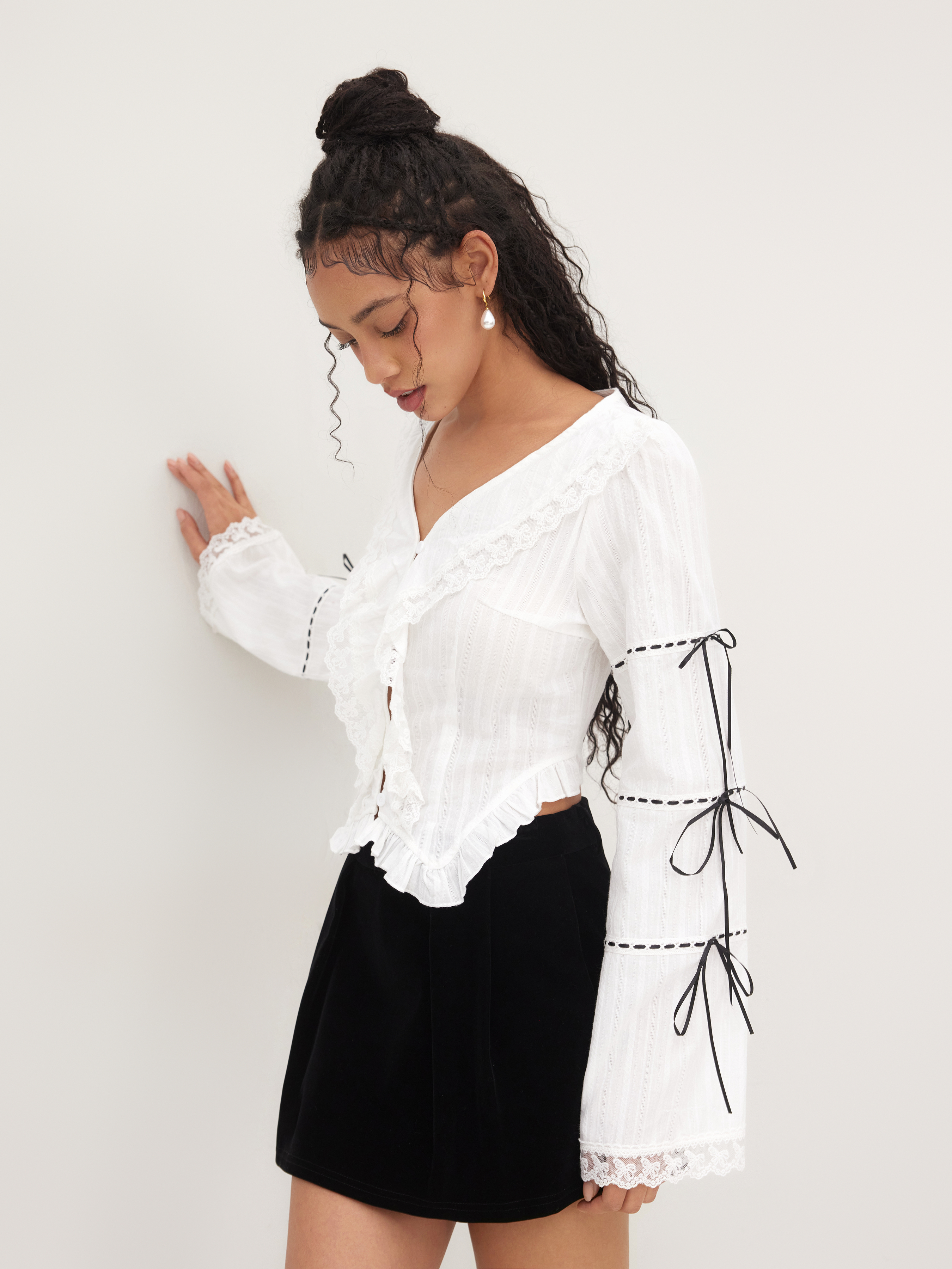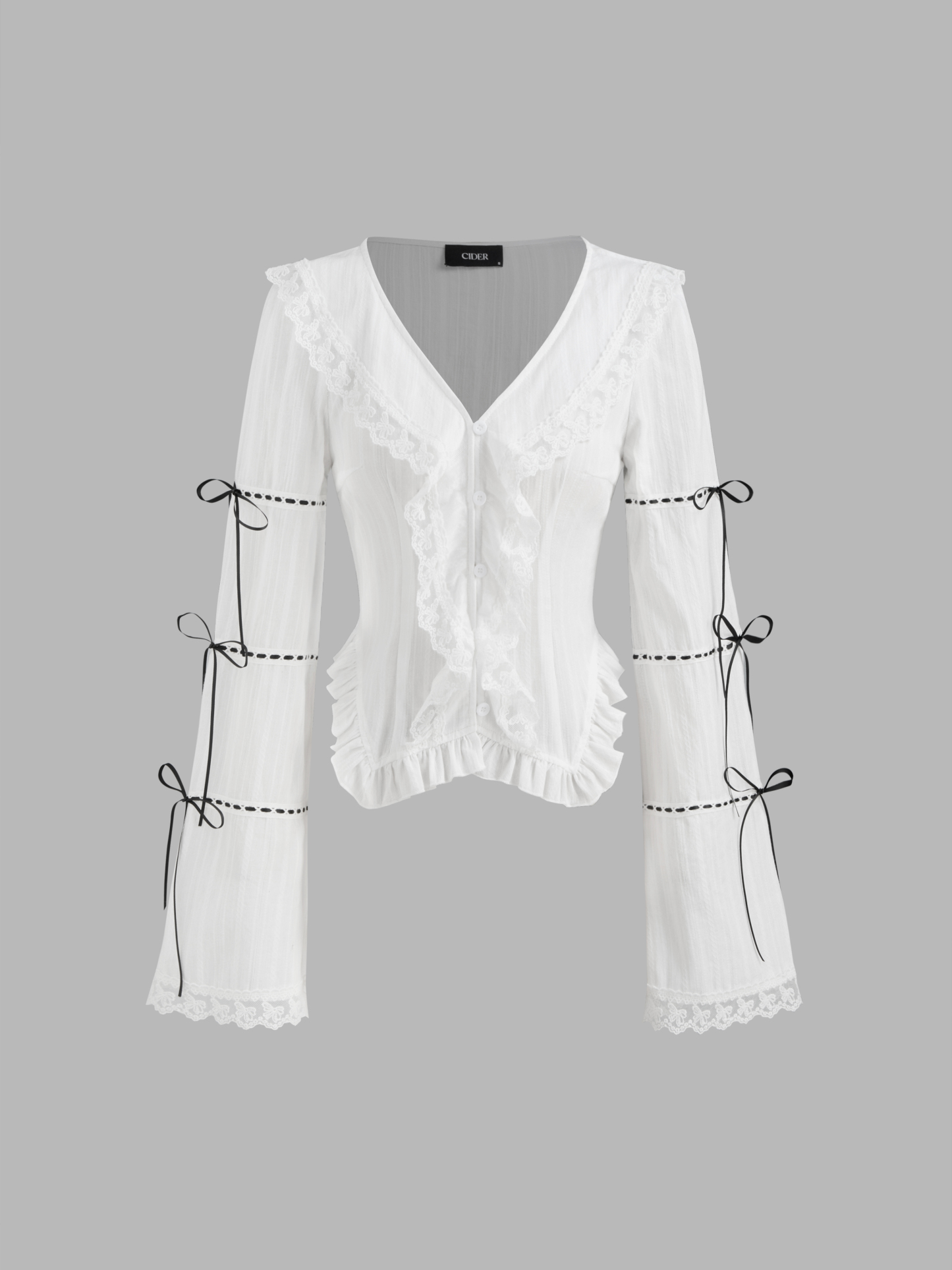 100% COTTON V-NECK LACE TRIM BOWKNOT BLOUSE