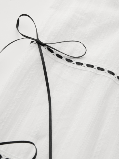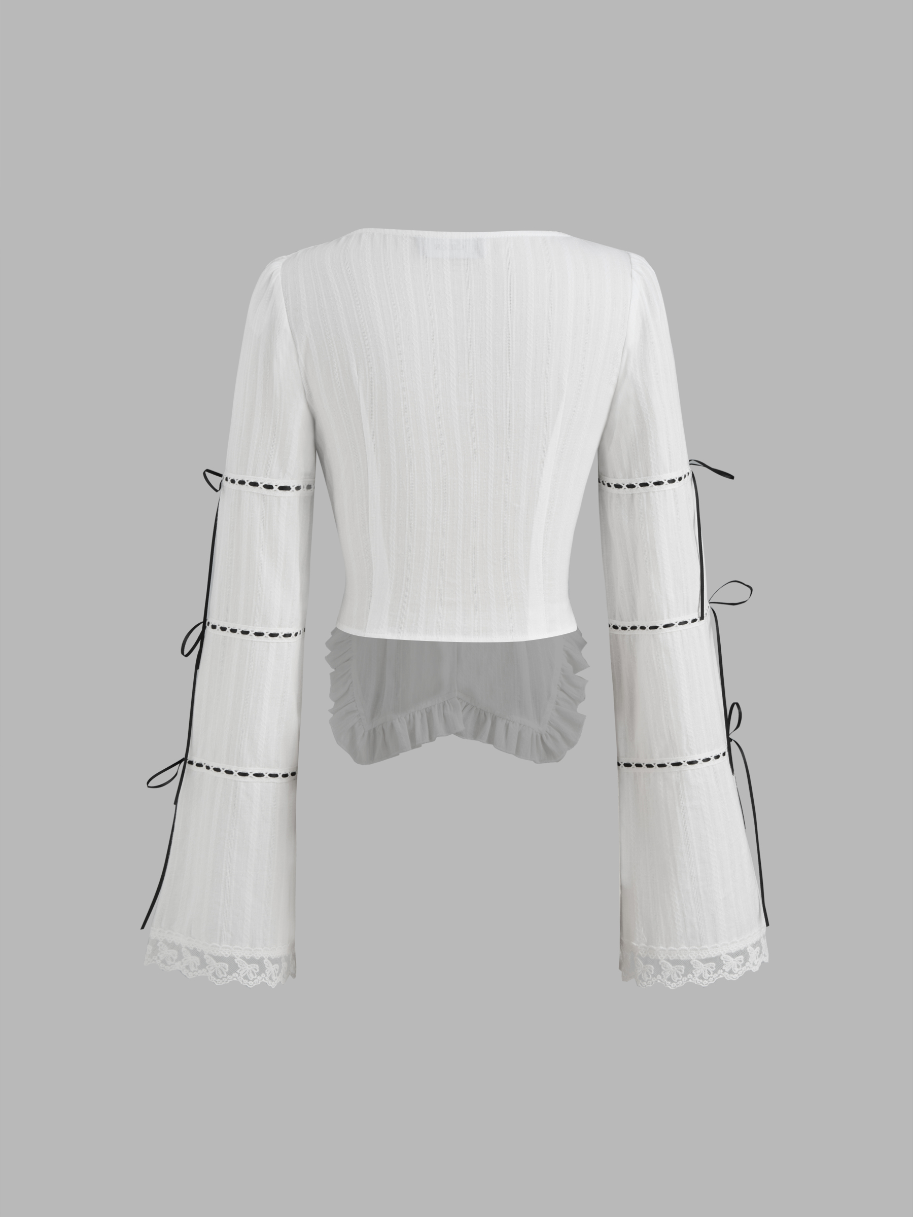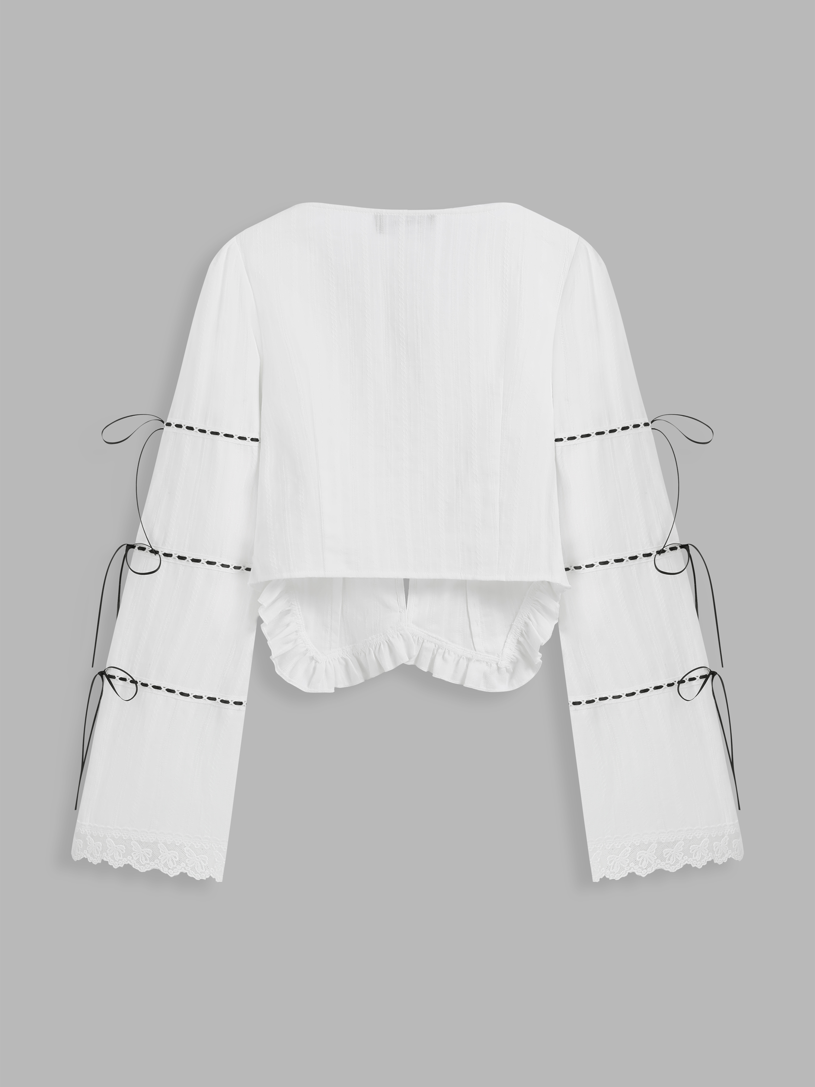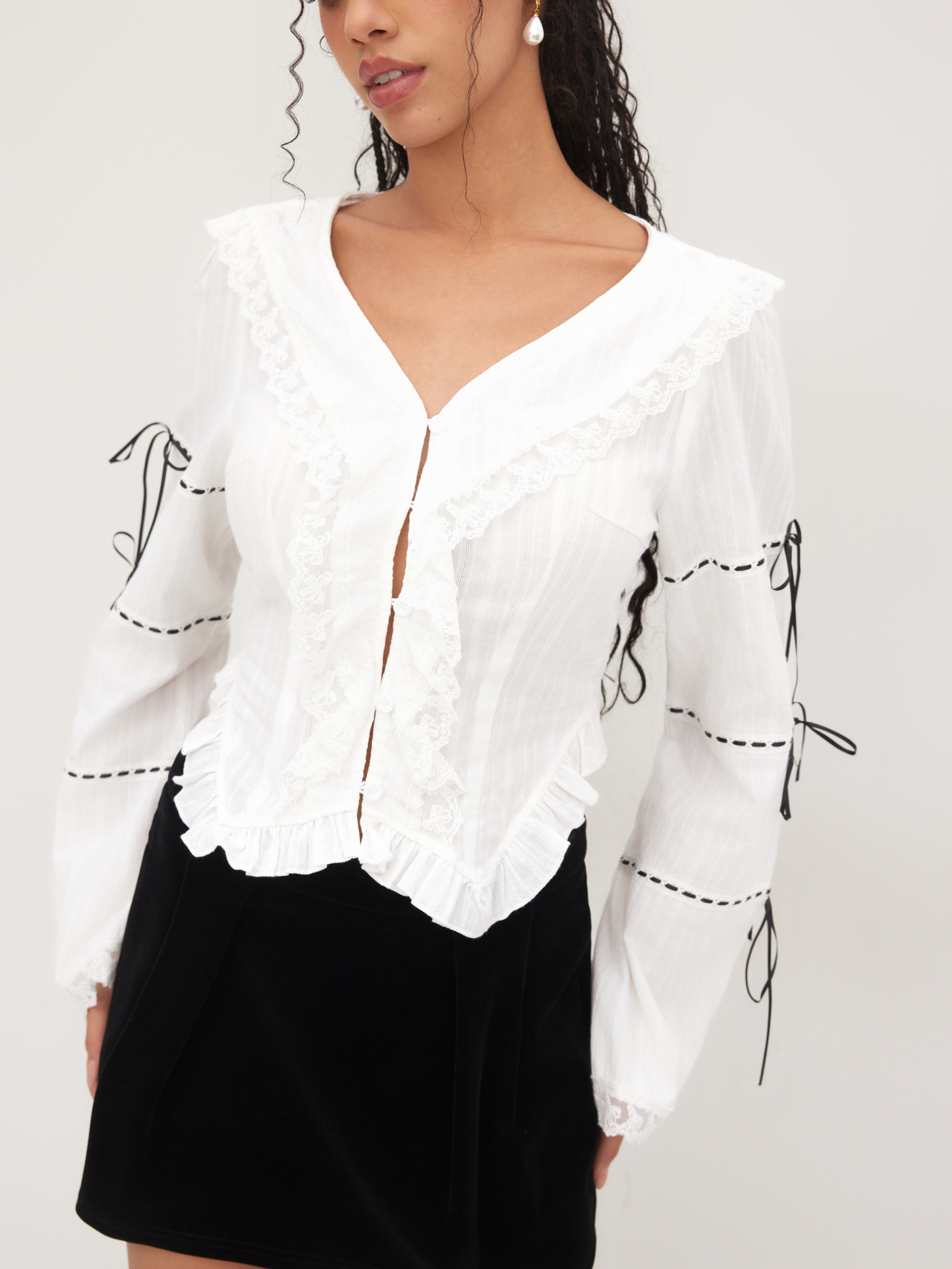 100% COTTON V-NECK LACE TRIM BOWKNOT BLOUSE