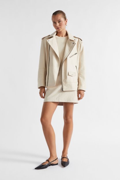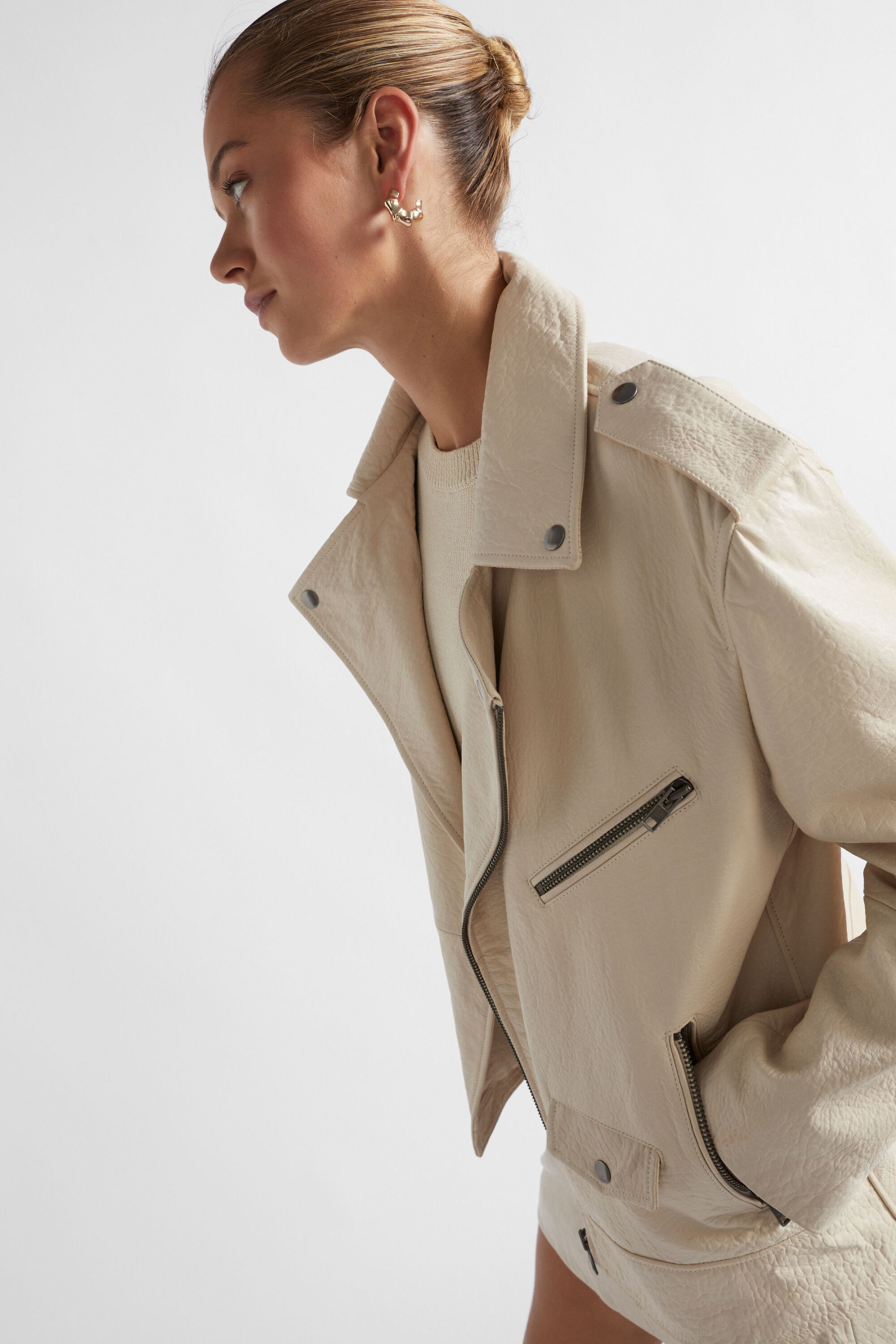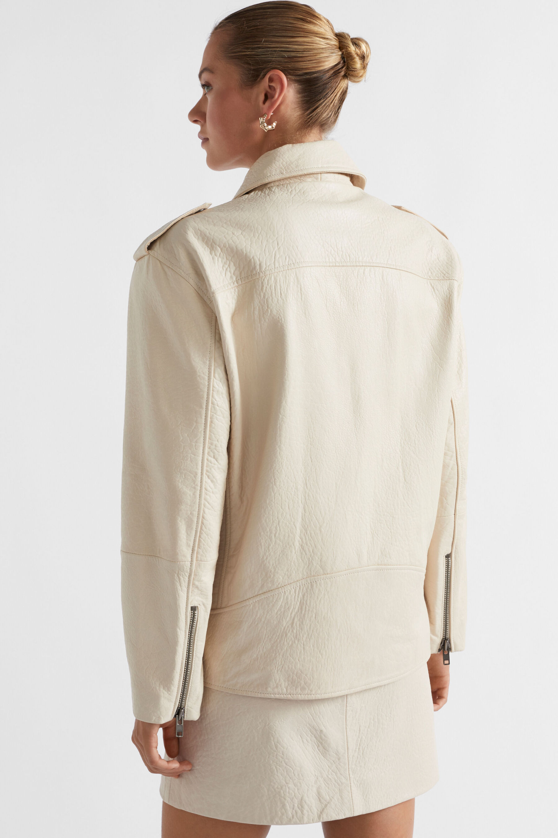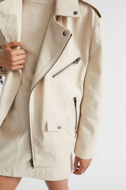 Your next go-to jacket, this biker is an ideal addition to any wardrobe. It features a collar with snaps, an exaggerated lapel, an angled zip closure and additional zip details. Fully lined with front pockets, it is crafted from textured pebbled leather. This product is made responsibly from Leather Working Group certified leather.