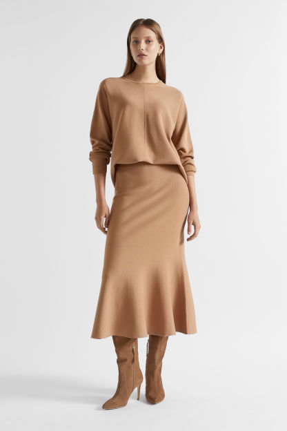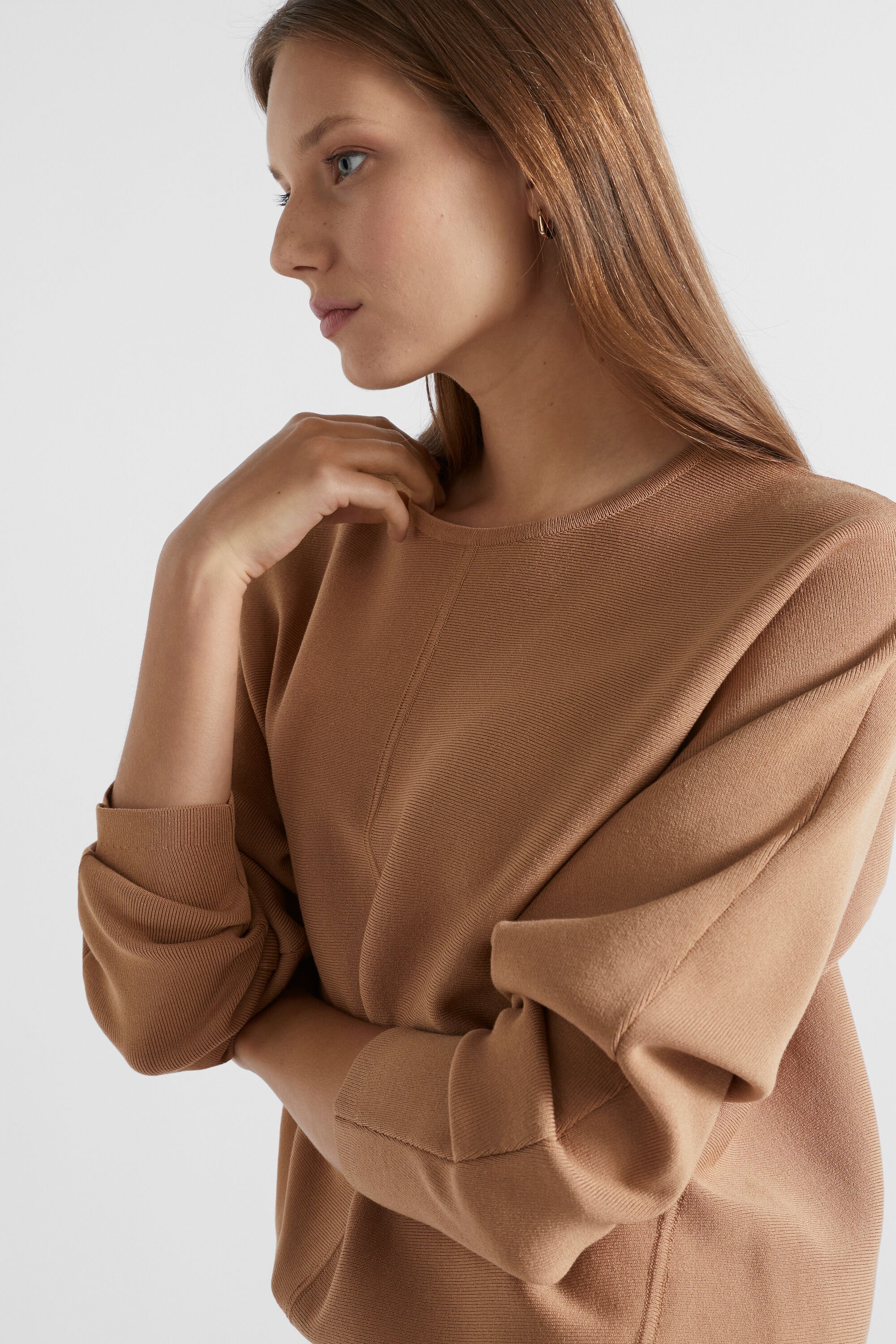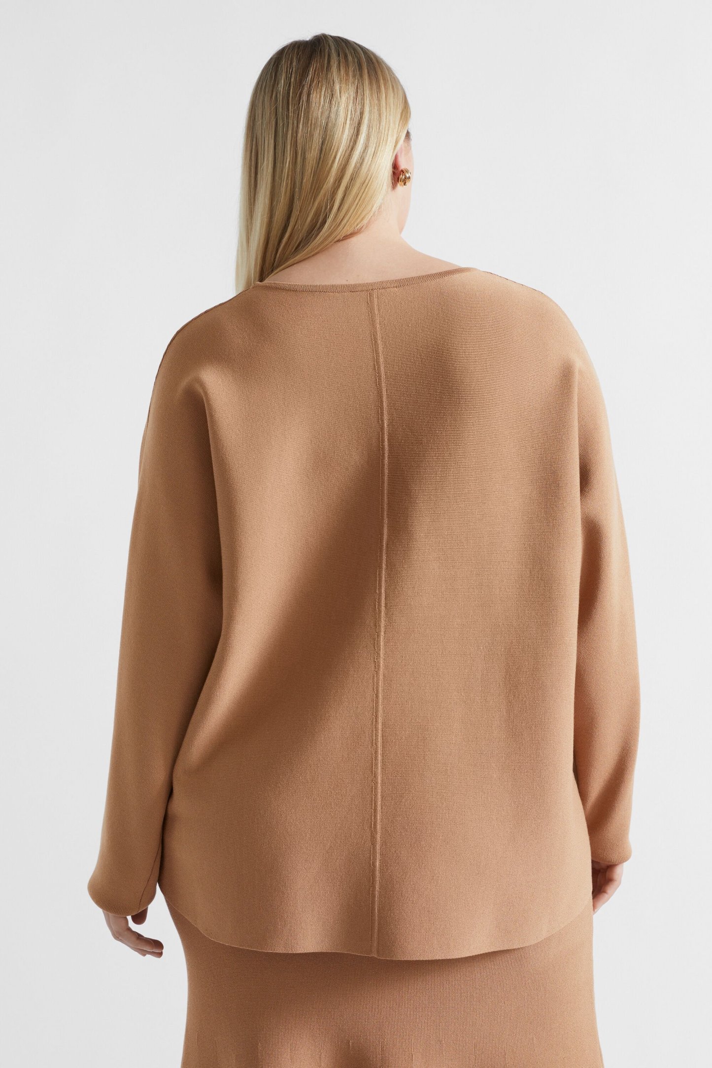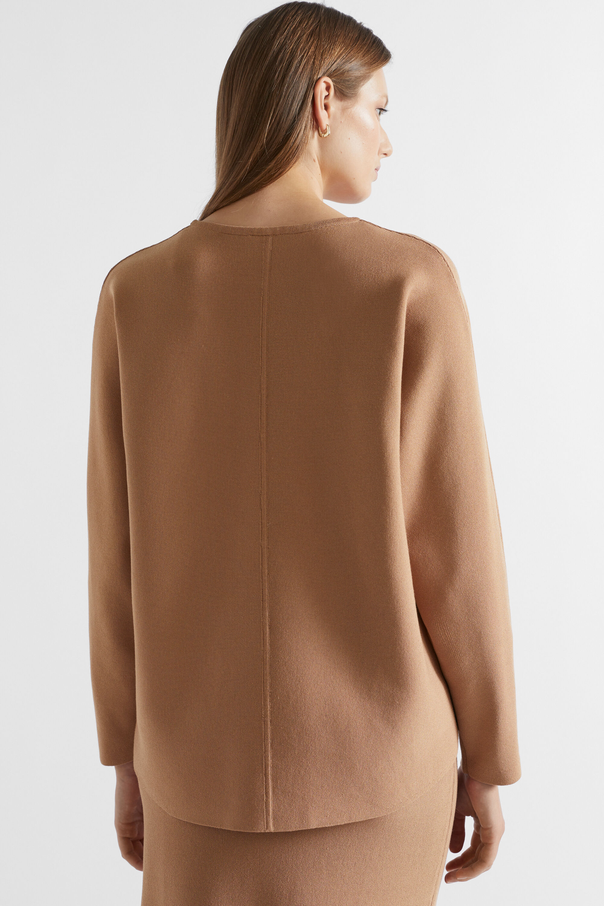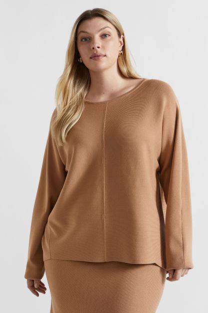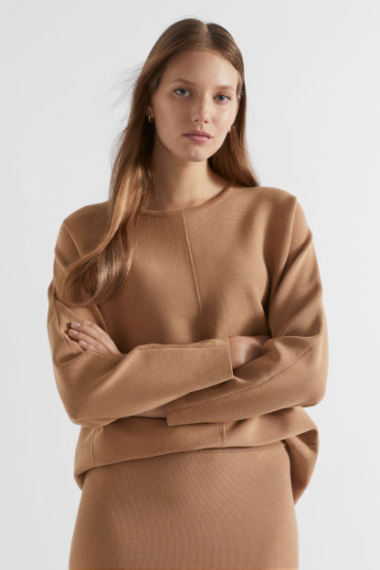 In a modern cocoon shape, this heavier-weight knit is sure to be your go-to on those colder days. It features a round neck, long sleeves, seam details, and a high-low hem.