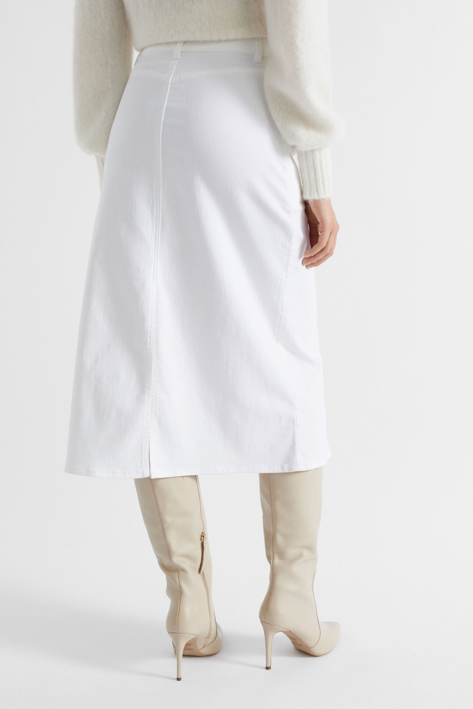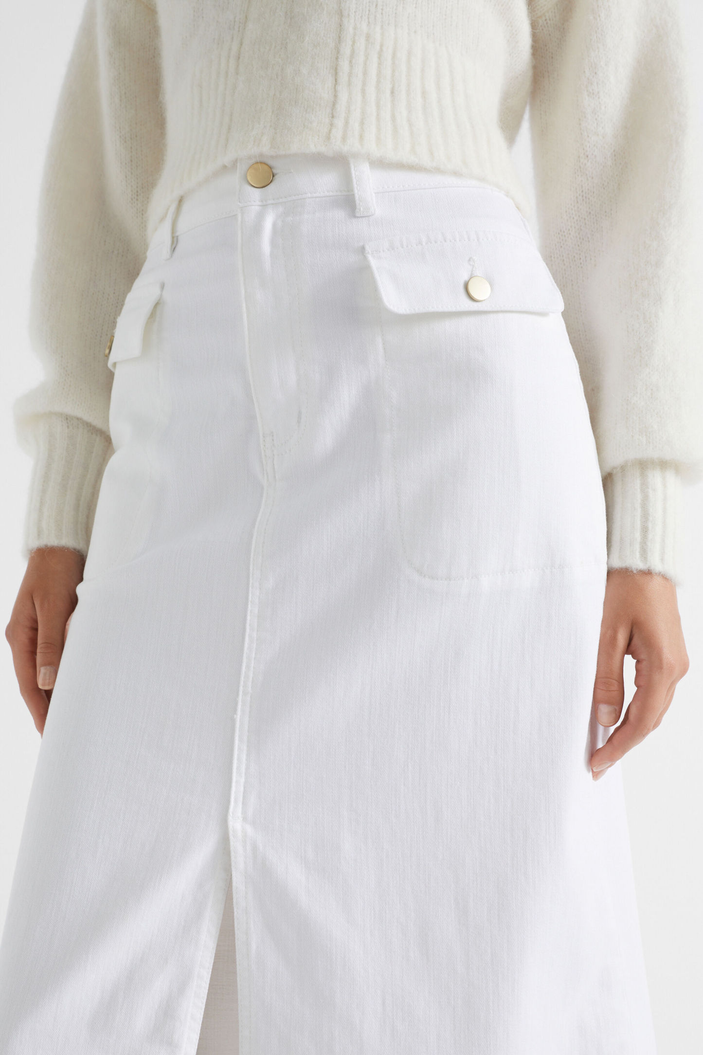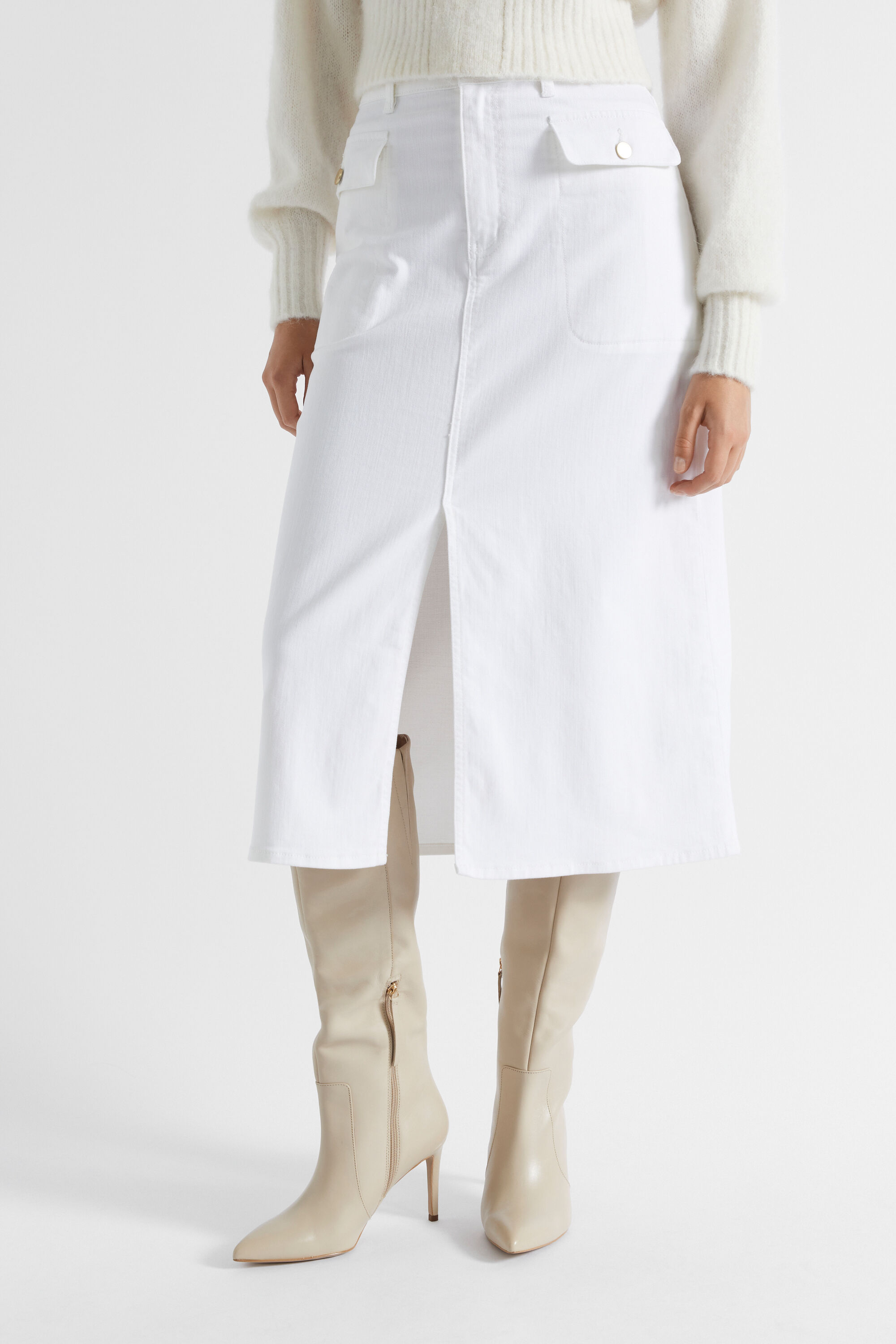 Midi length with metallic details, this skirt will easily slot into your weekend wardrobe. It features a fixed waistband with belt loops, a button and zip fly closure, front pockets with buttons, and a split at the back and front for movement. Crafted from a denim blend with a hint of stretch.