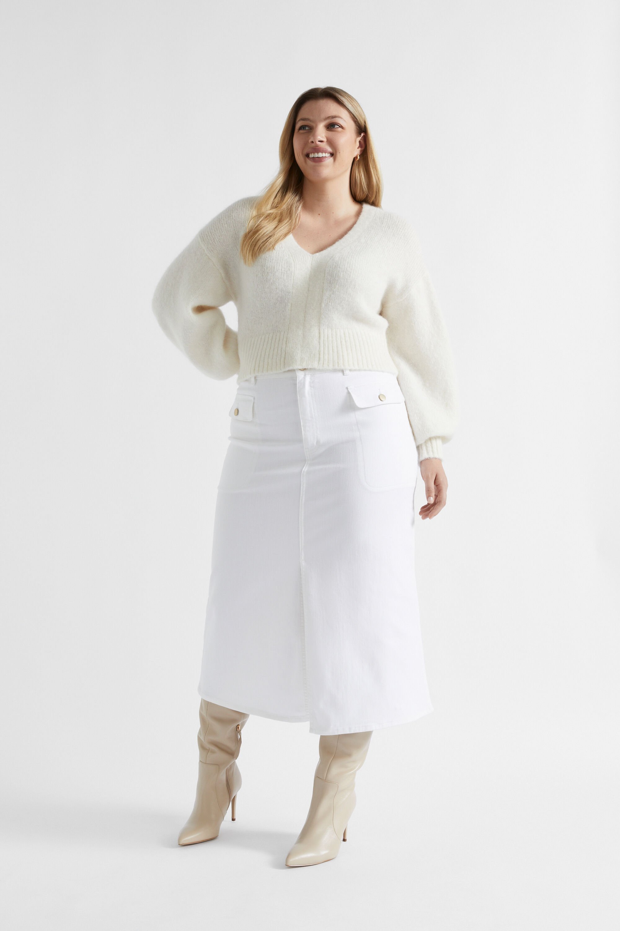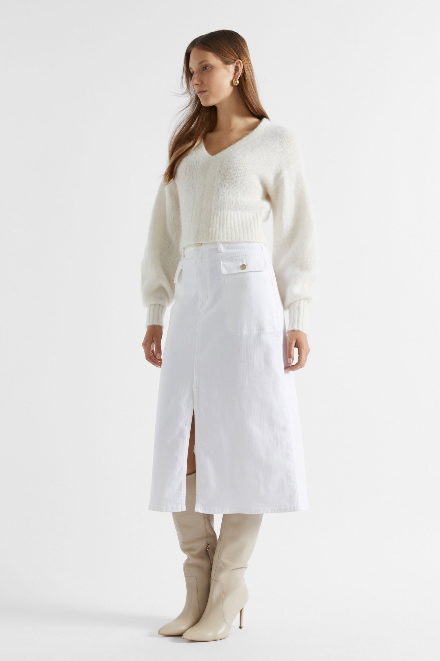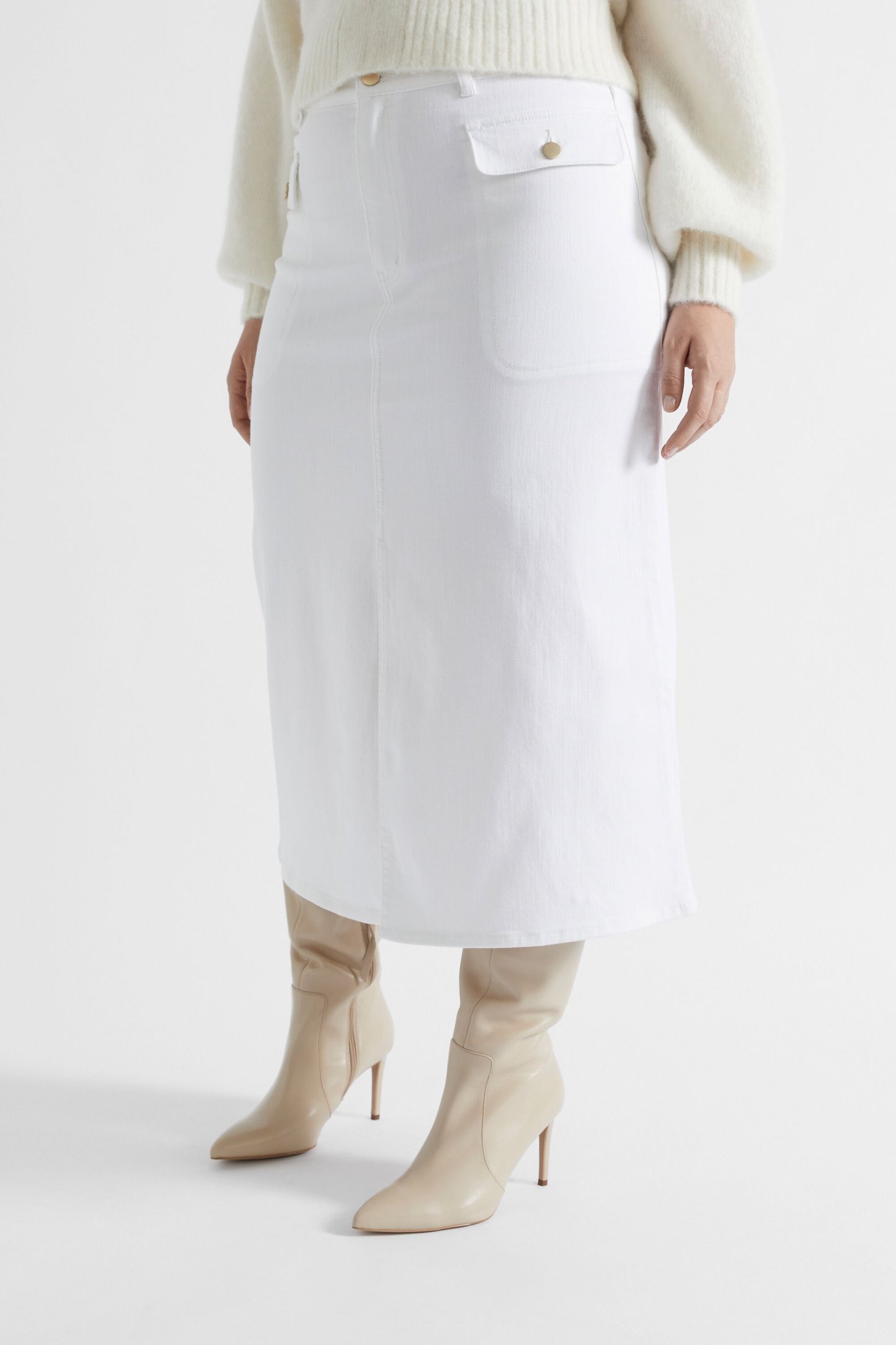 Midi length with metallic details, this skirt will easily slot into your weekend wardrobe. It features a fixed waistband with belt loops, a button and zip fly closure, front pockets with buttons, and a split at the back and front for movement. Crafted from a denim blend with a hint of stretch.