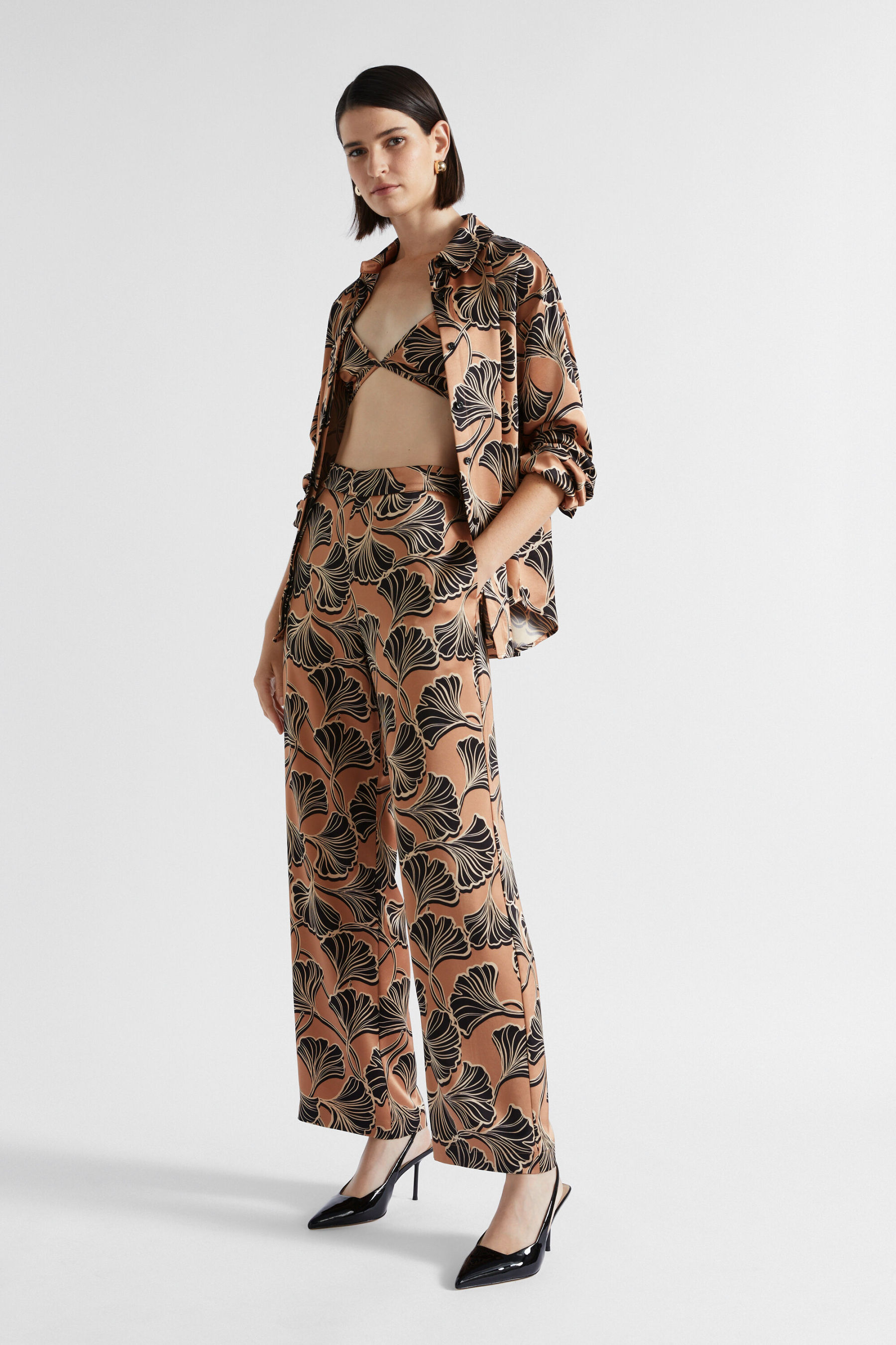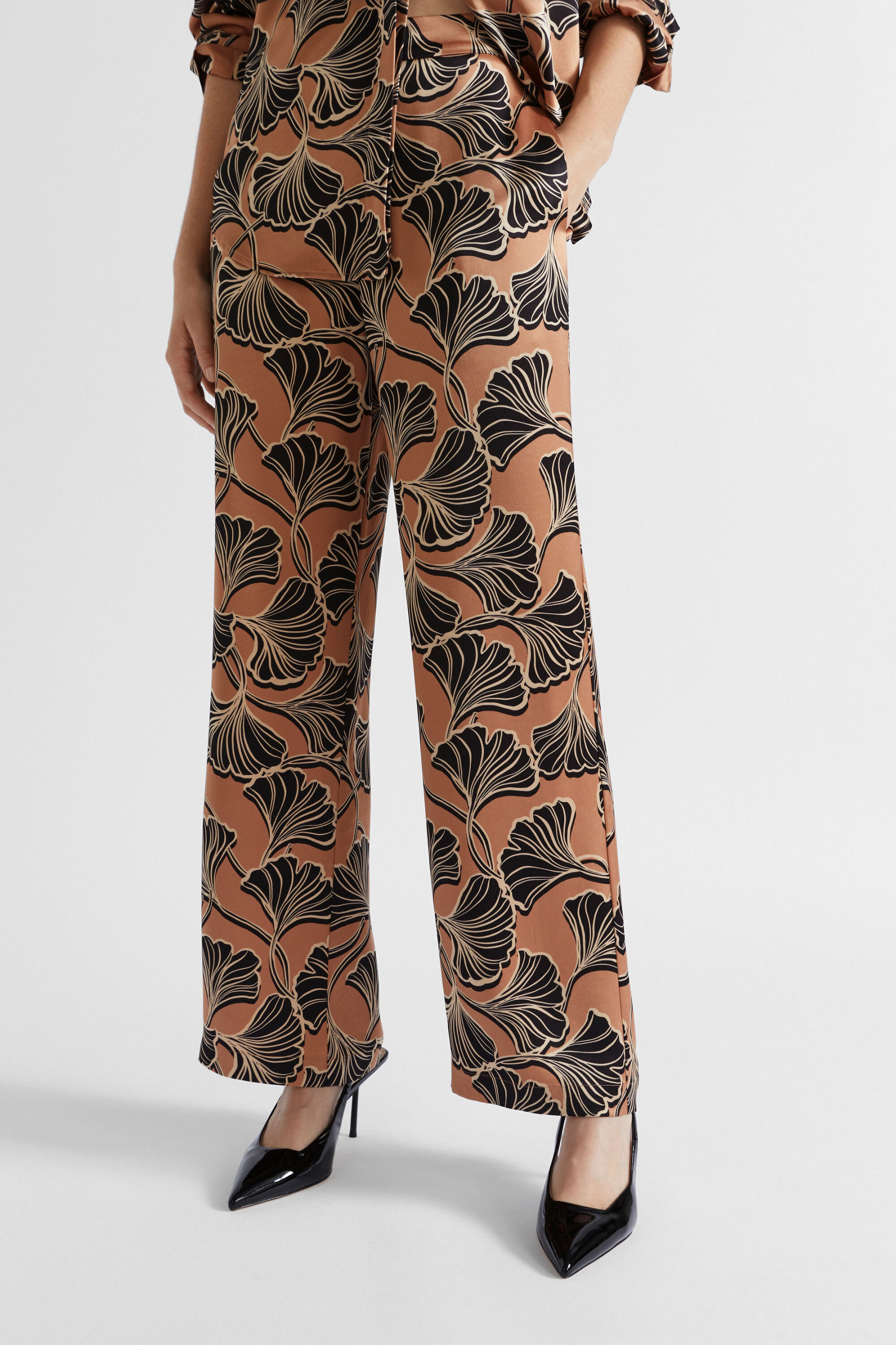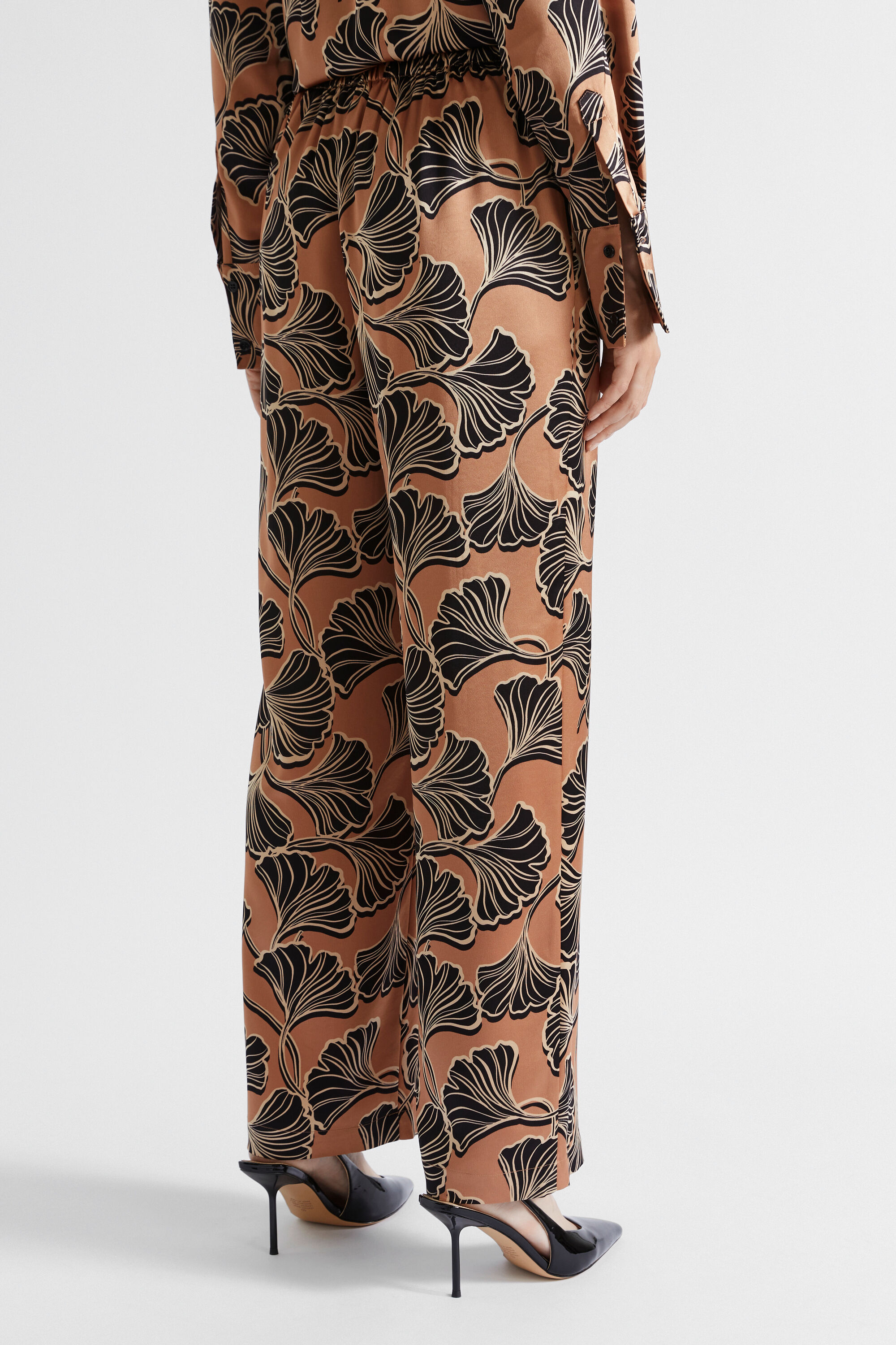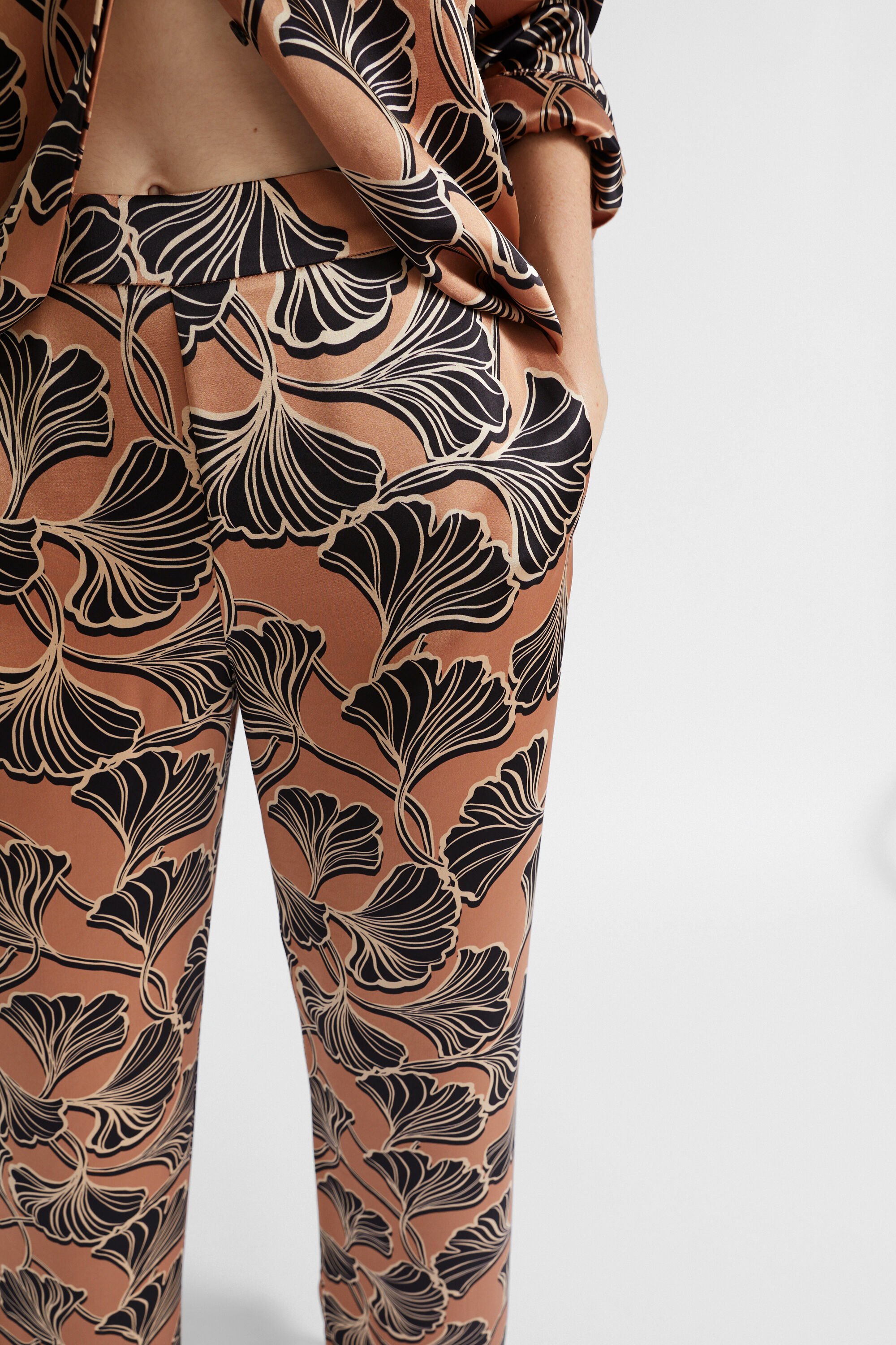 In a tonal floral pattern, these pants are your next go-to statement piece. They feature a flat-front waistband with an elasticated back, and side seam pockets. Falling to a relaxed-fit leg, they are crafted from a satin blend. Wear them with the matching bralette or shirt to create a coordinated set.