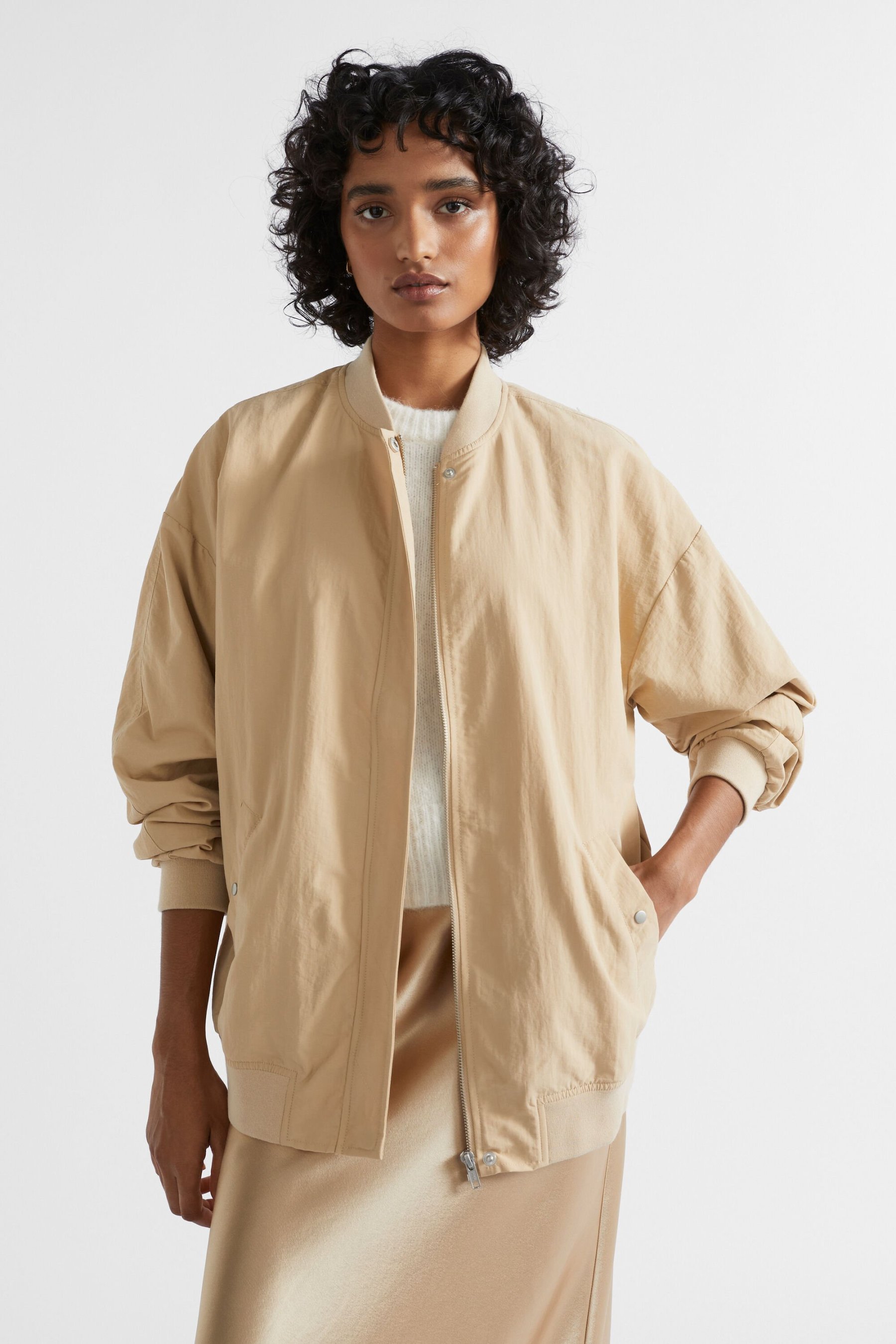 Ideal to throw on and elevate your outfit, this mid-length bomber jacket features ribbed trims, a concealed zip placket with quilted detailing, a dropped shoulder and angled front pockets with button closures.