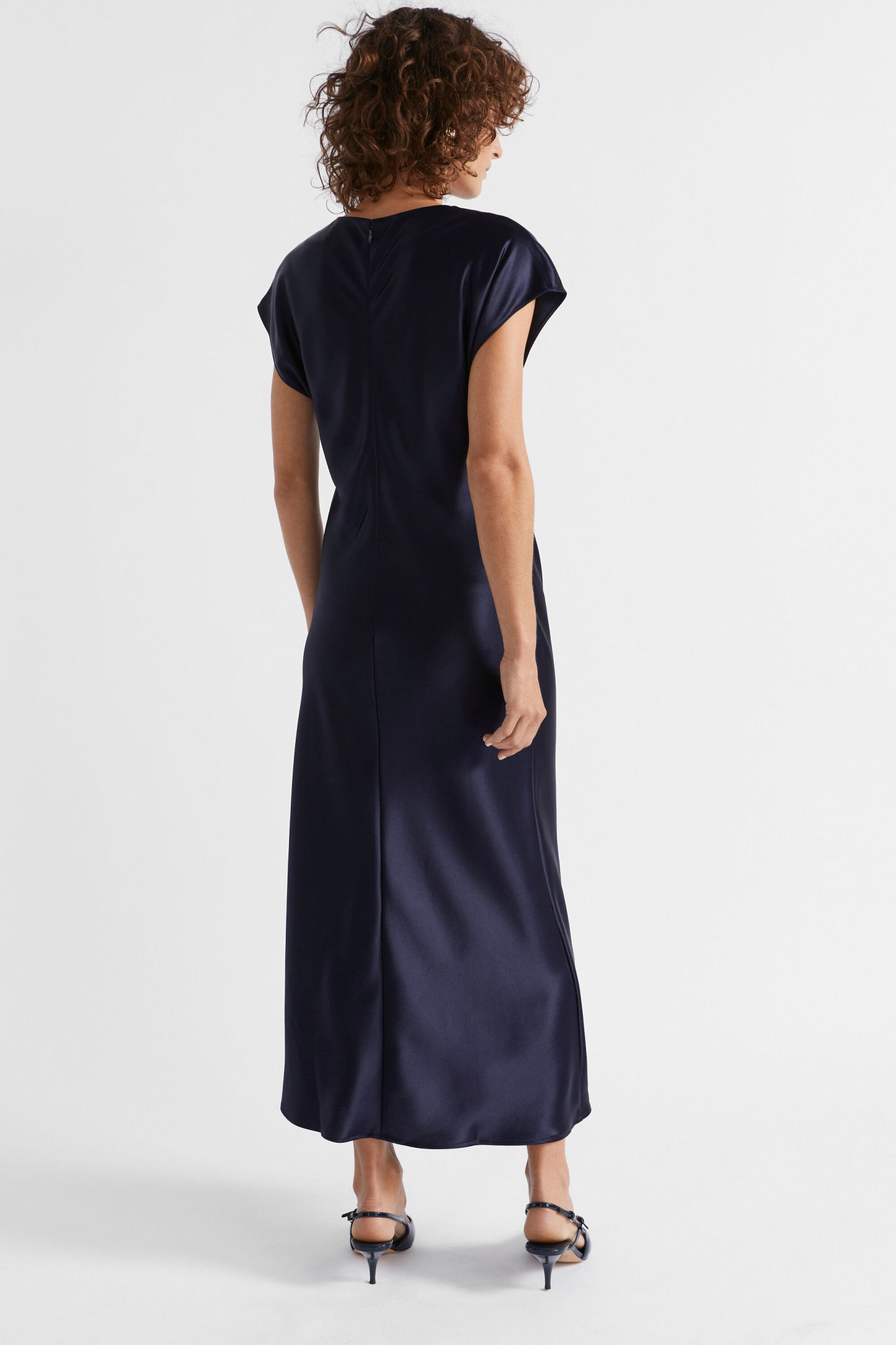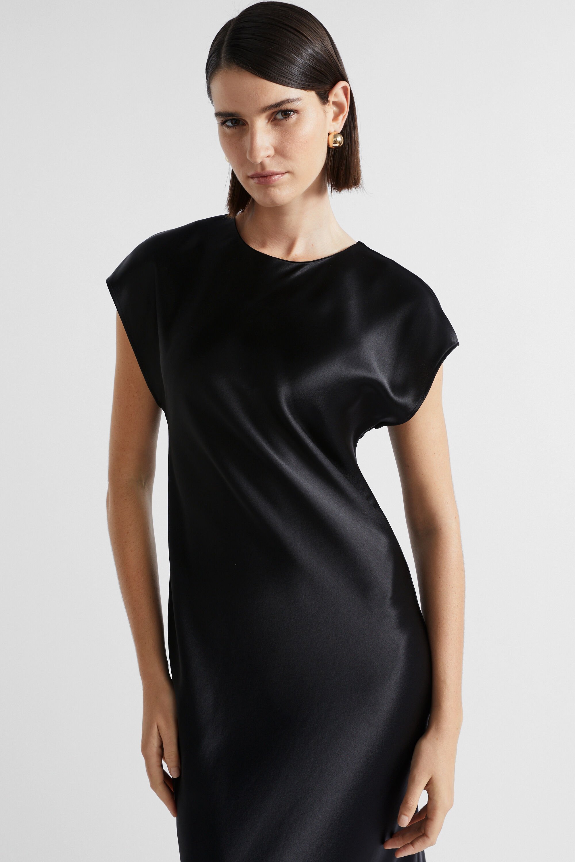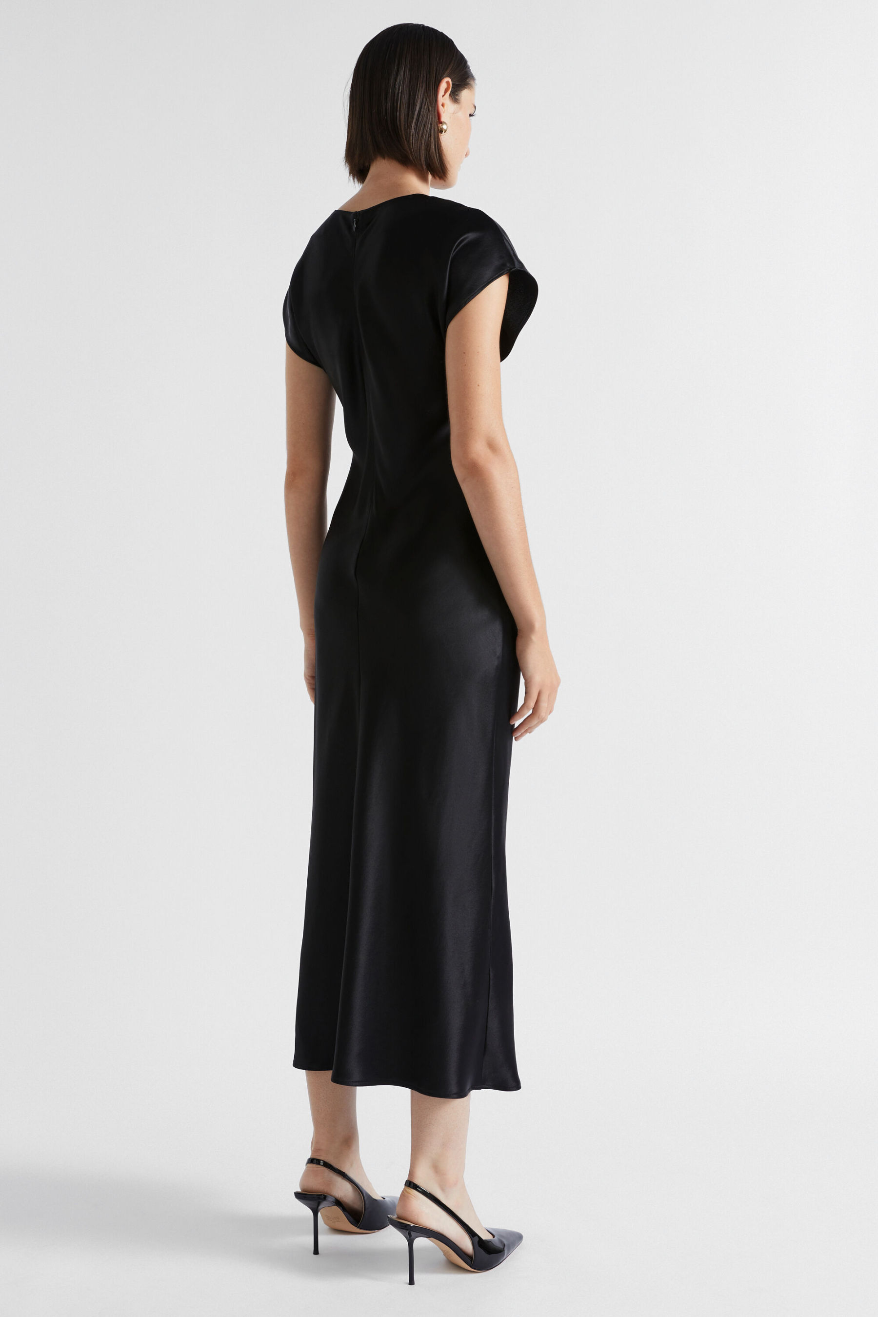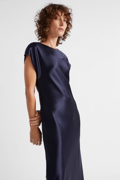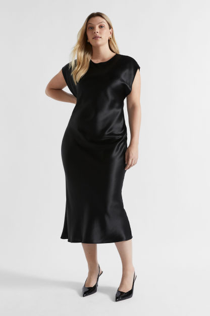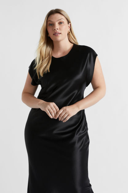 Ideal for work or event wear, this dress features a round neck, short cap sleeves and an invisible zip down the back. With movement and drape through the upper body coming into a more fitted waist, it is crafted from a satin blend.