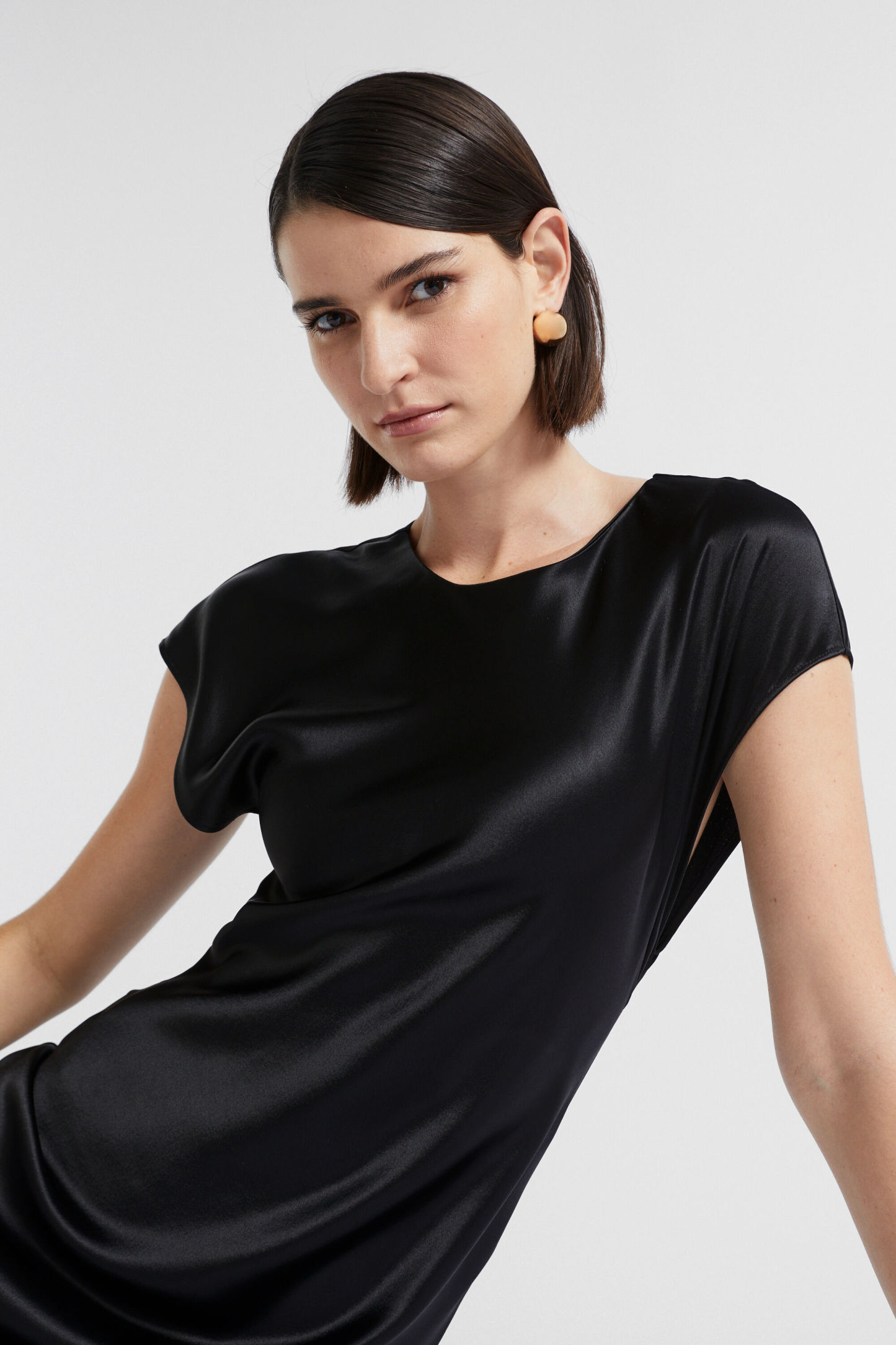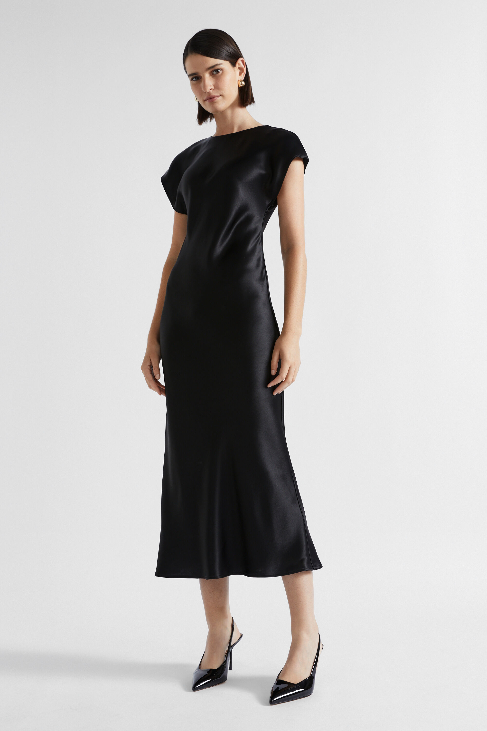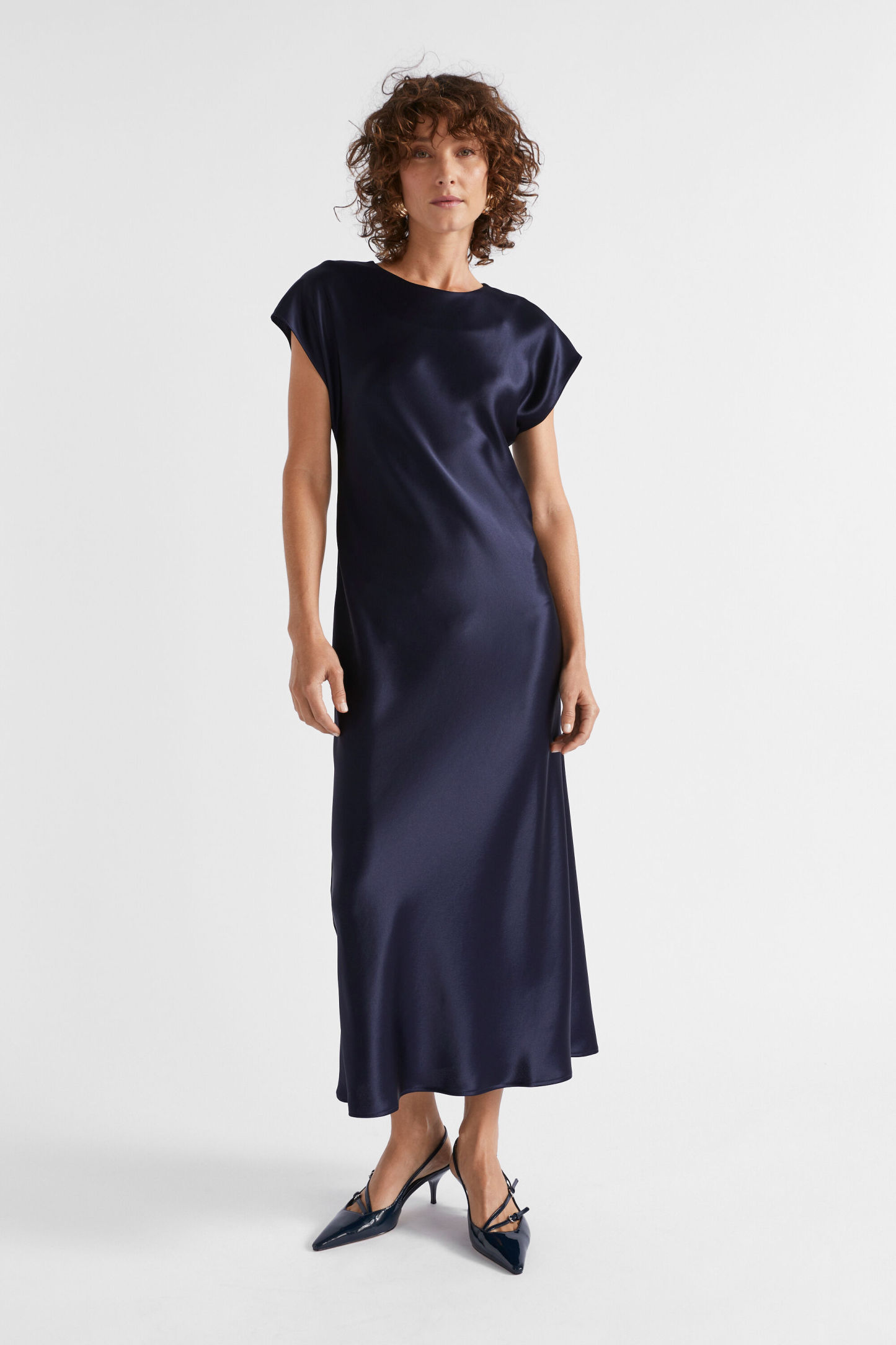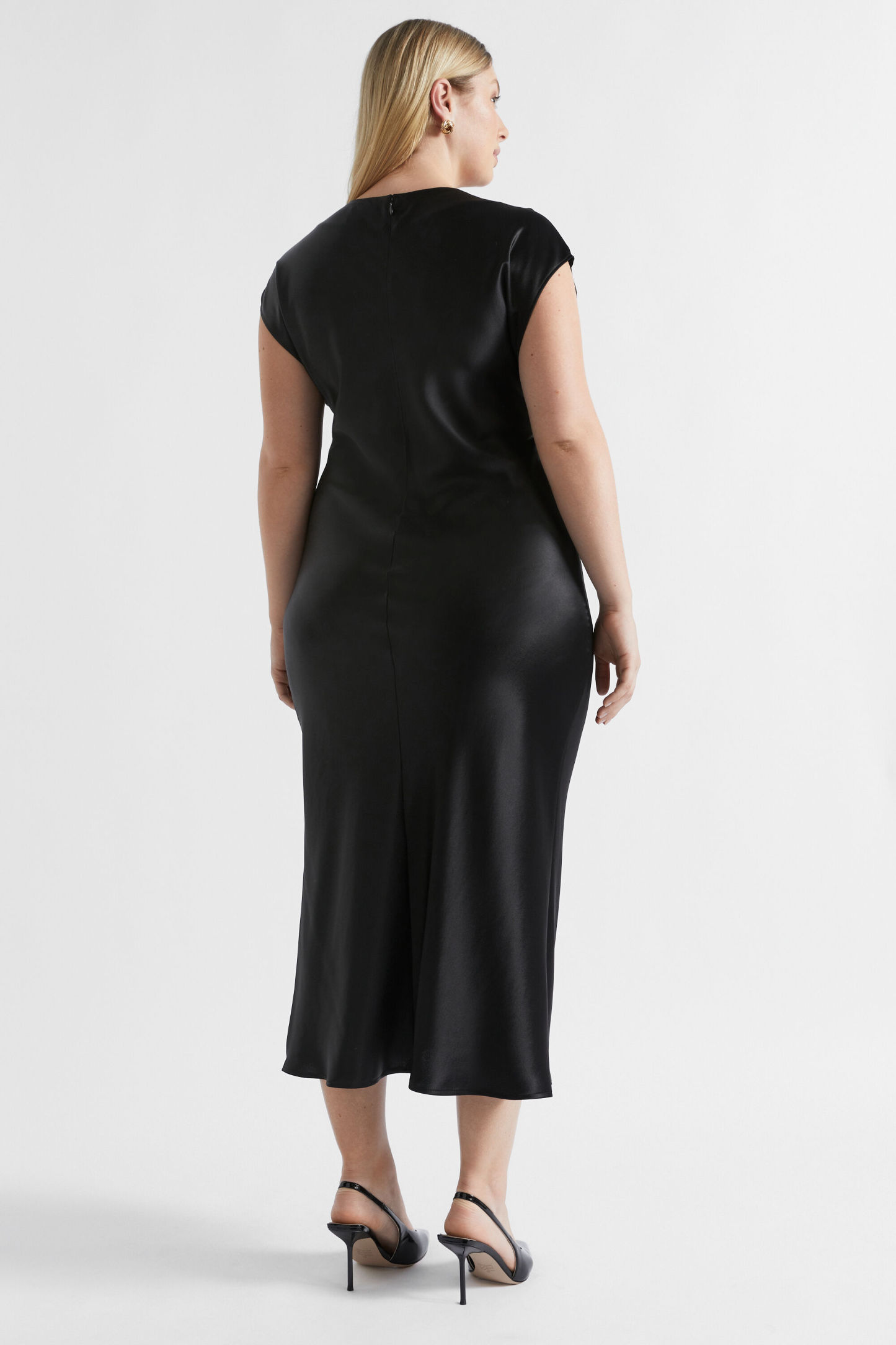 Ideal for work or event wear, this dress features a round neck, short cap sleeves and an invisible zip down the back. With movement and drape through the upper body coming into a more fitted waist, it is crafted from a satin blend.