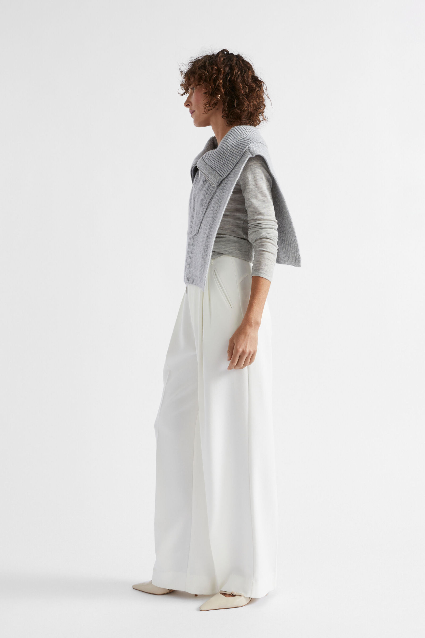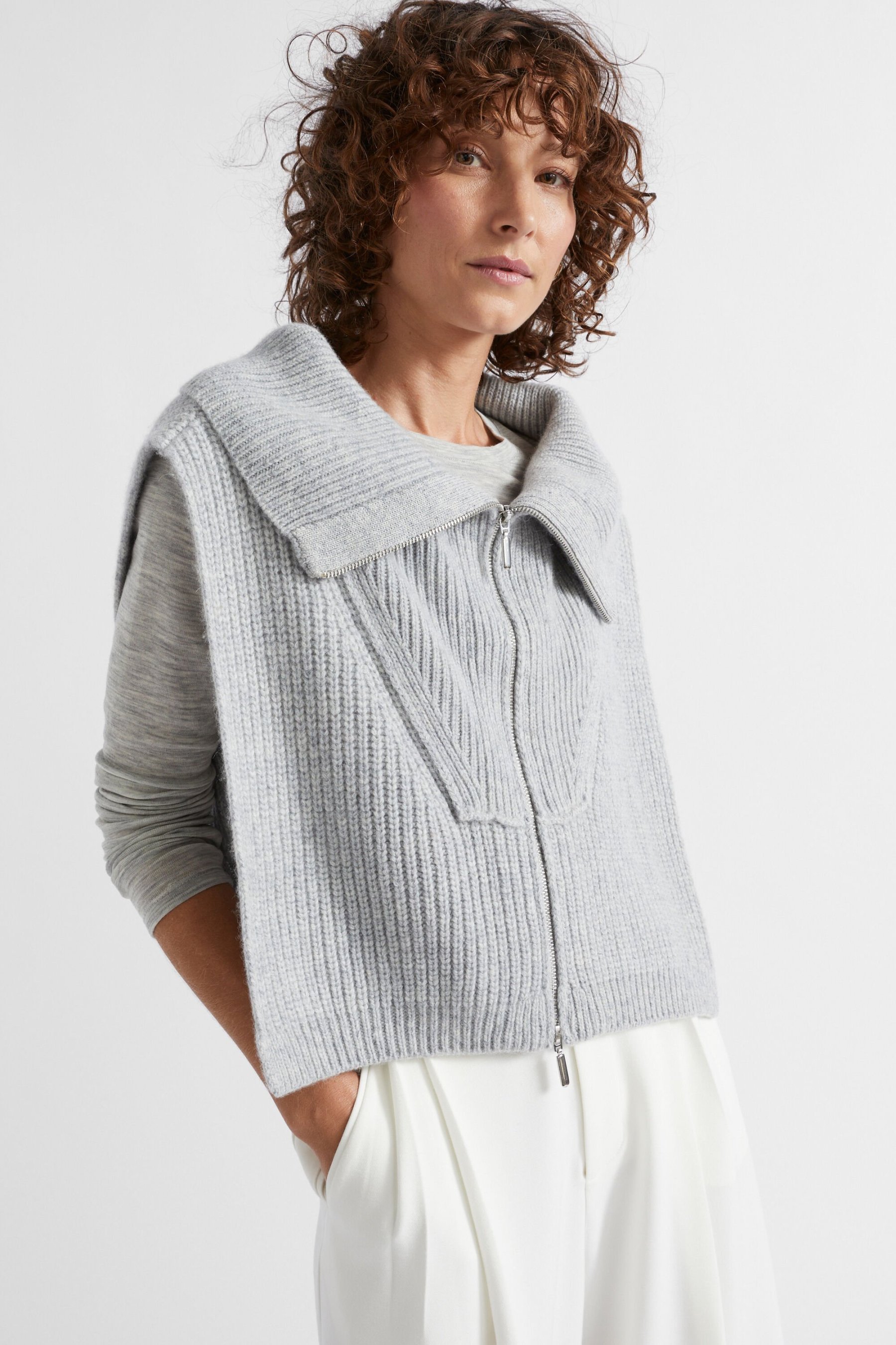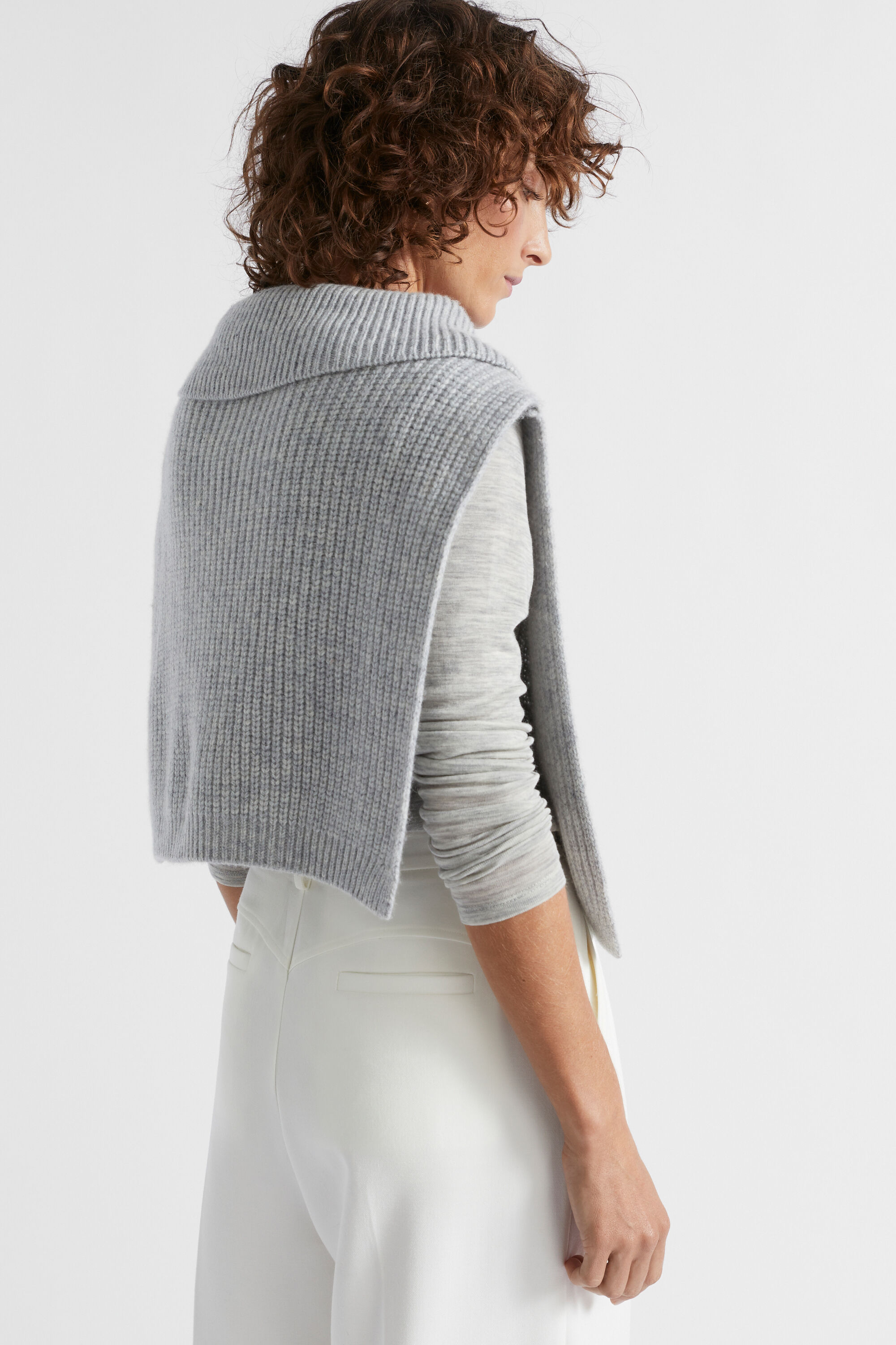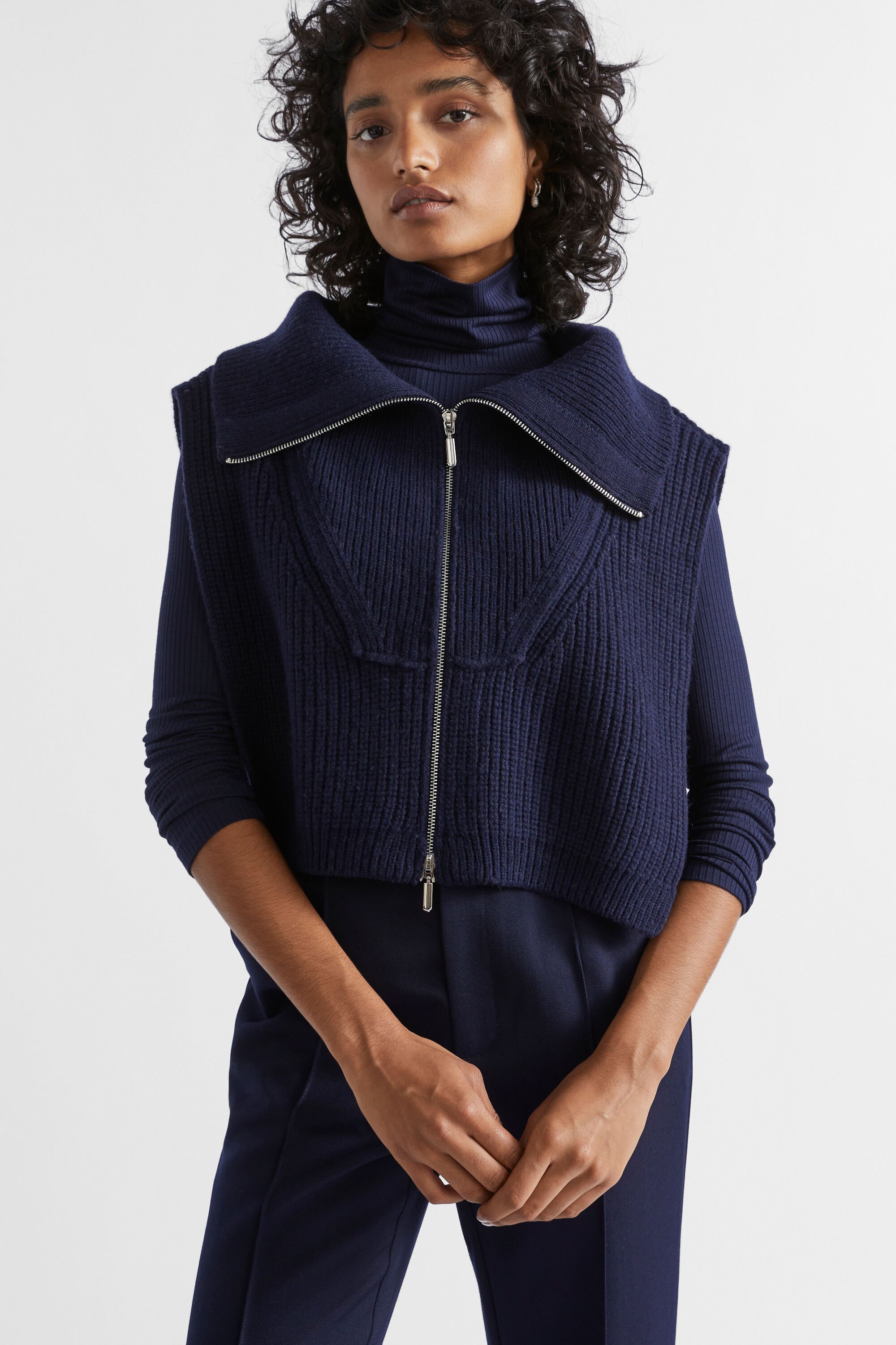 An ideal layering option, this sleeveless bib has a collar and a two-way half zip, all in a cropped length. Crafted from a wool blend.