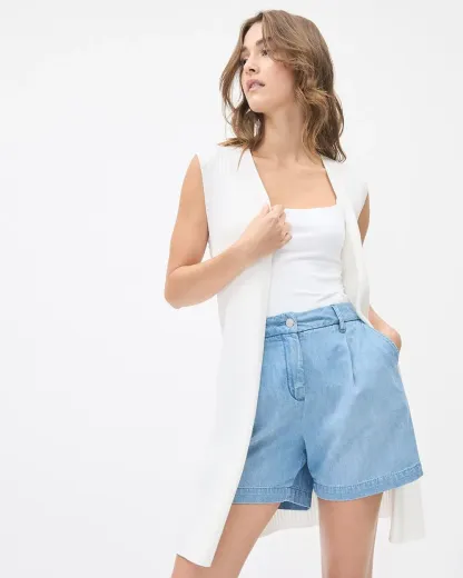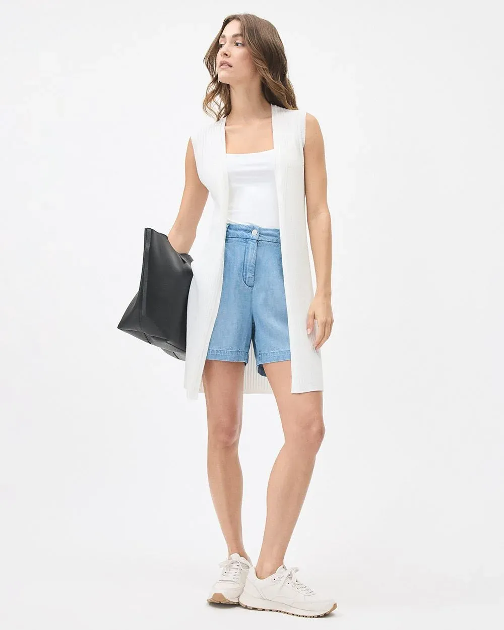 Super trendy, you need one of these sleeveless cardigan this summer. Made in a stretch ribbed knit for ultimate comfort and style.