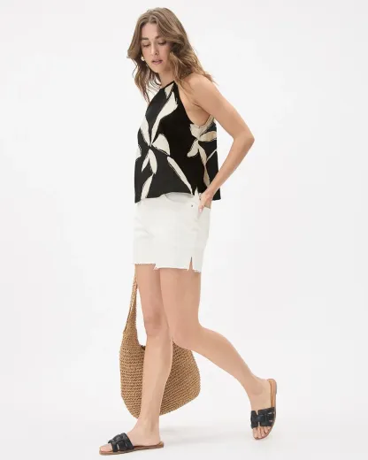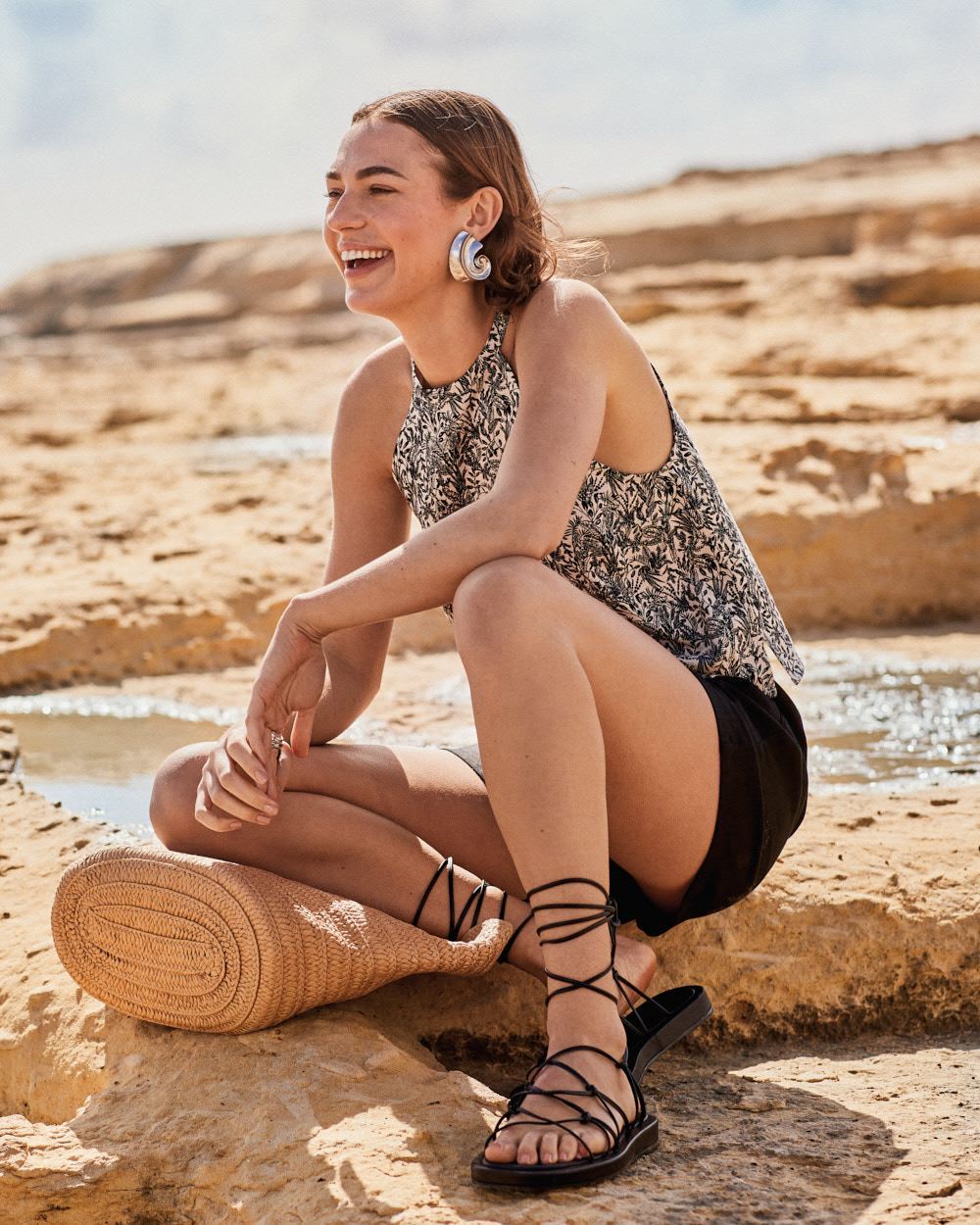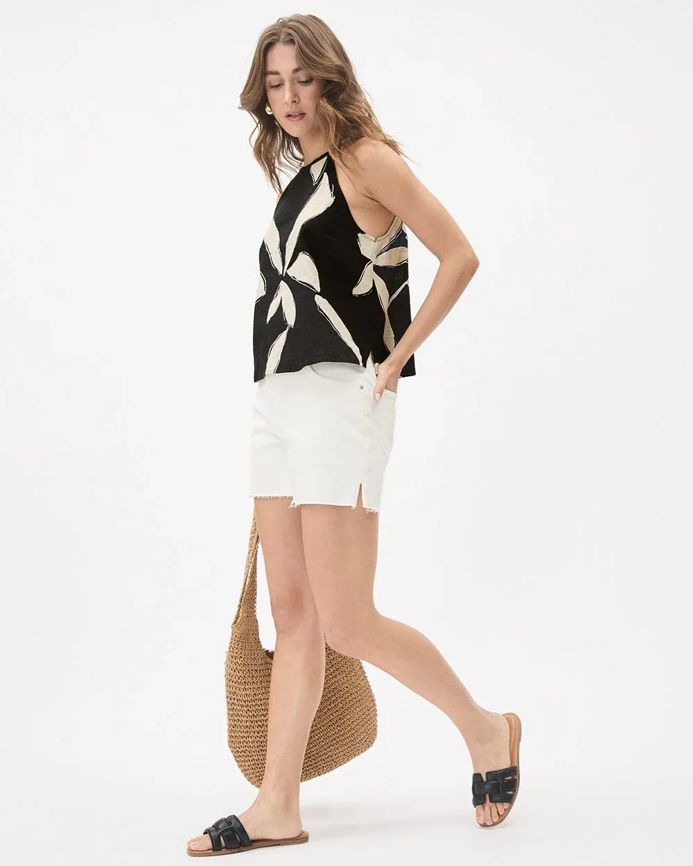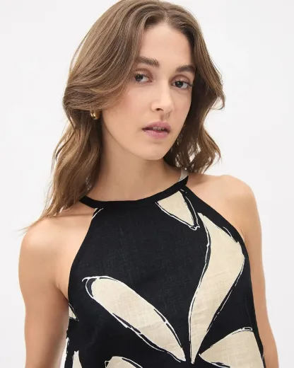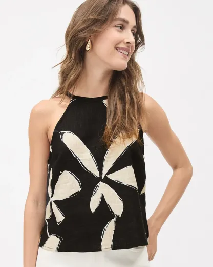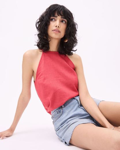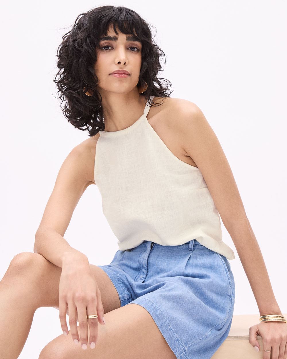 Step into summer mode in style with this stunning sleeveless blouse featuring a halter neckline and made in a perfectly cool linen blend fabric.