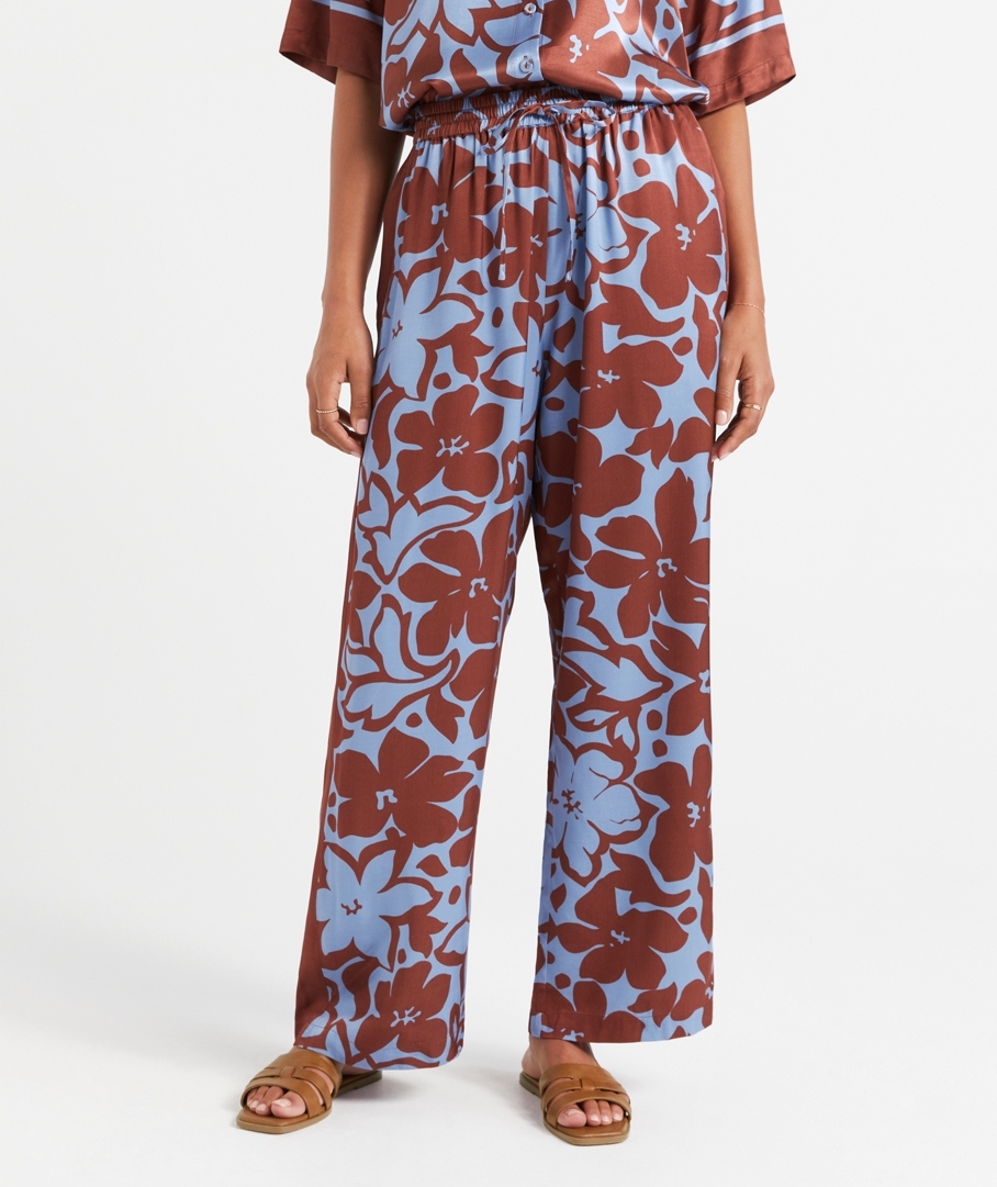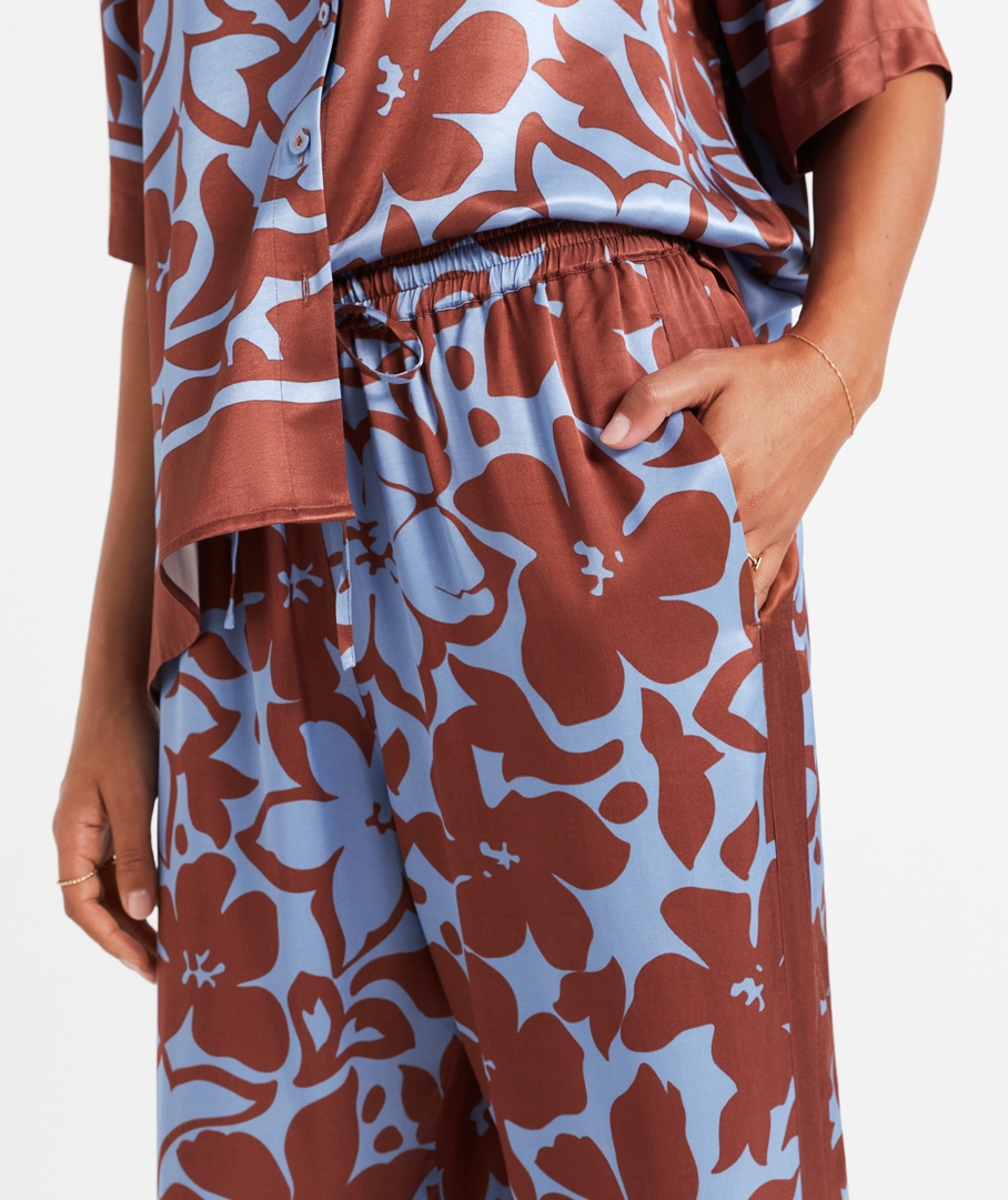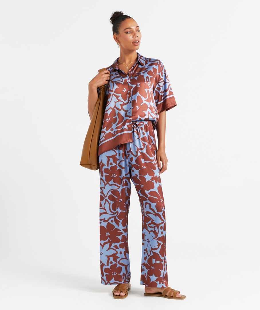 The Abby Satin Printed Pant is a must have for the season! With an eye-catching print, full length, wide leg fit, elastic waist band with a tie, and high waisted. Elevate your look for the evening with a pair of heels, or sandals for a casual day out. Pair with the matching shirt for a complete set.