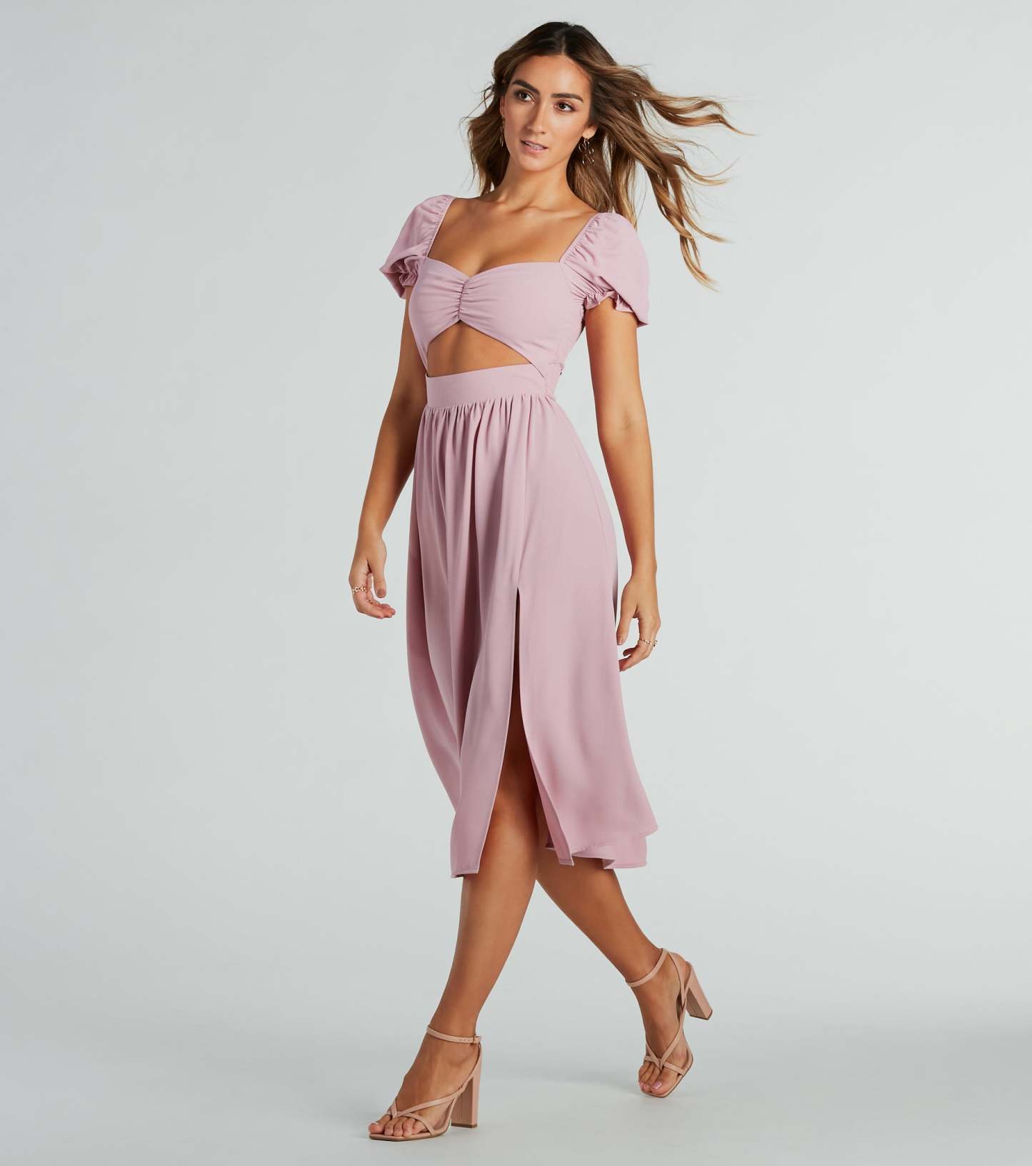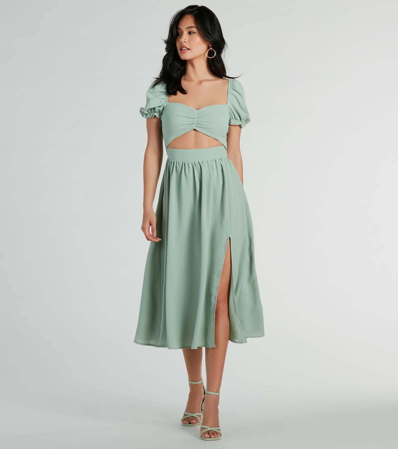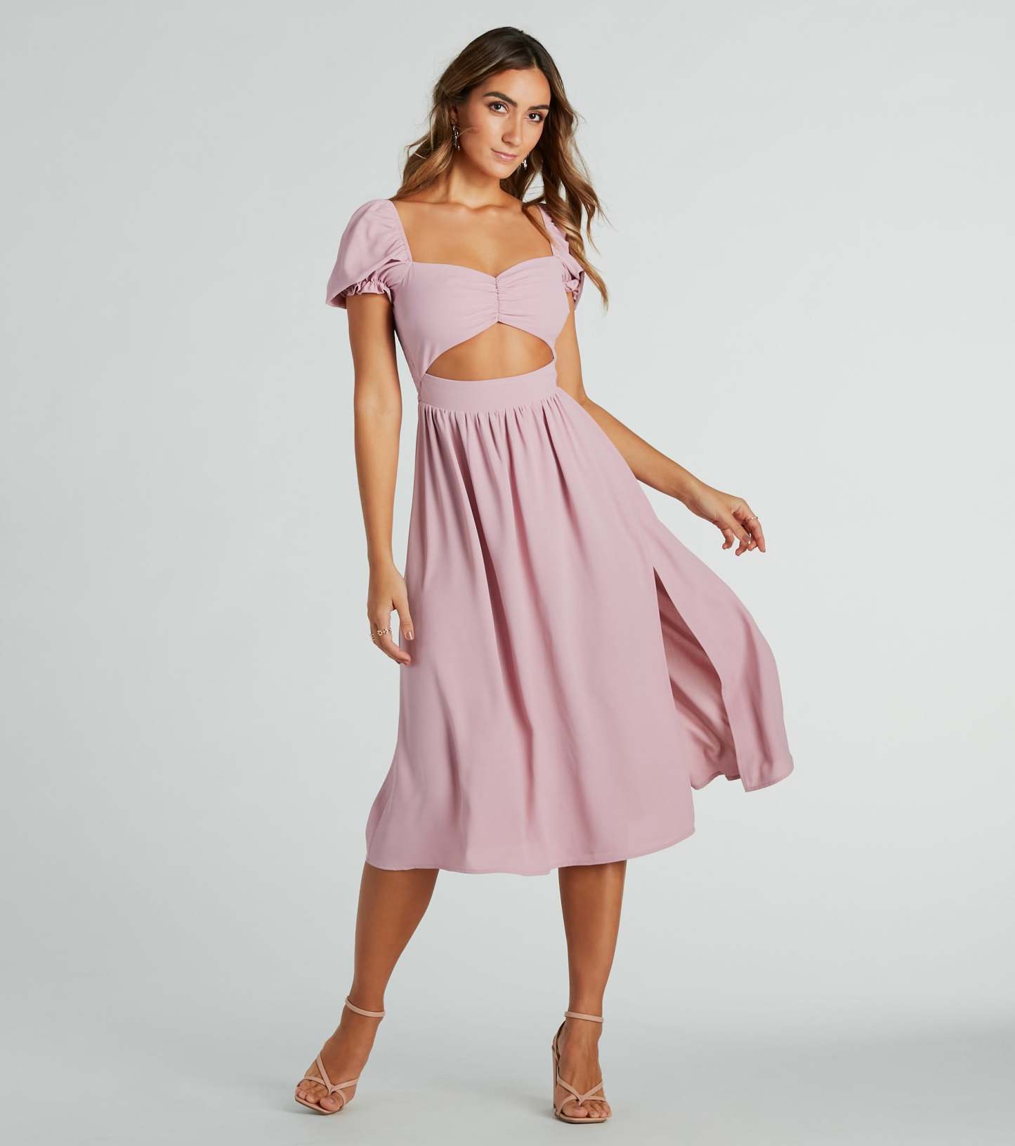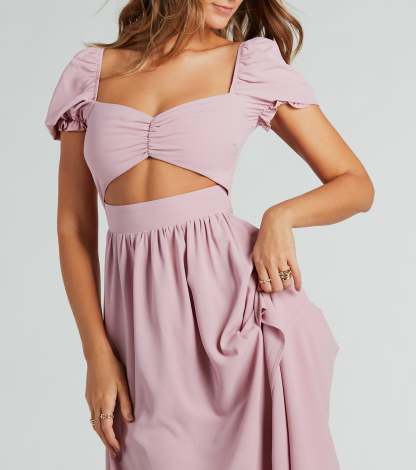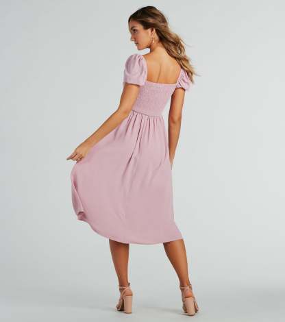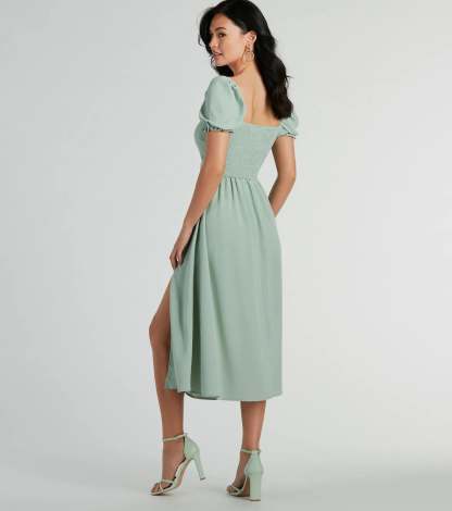 Raise the bar looking adorable in this chiffon midi dress perfect for upcoming dressy occasions! The midi-length dress features short puff sleeves, a sweetheart neckline, a ruched bust, and a flirty cutout waist to show some skin. The flattering A-line silhouette boasts a playful front slit and a flowy midi hem. Complete the look with cute and jewelry!