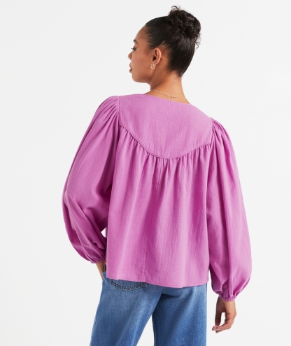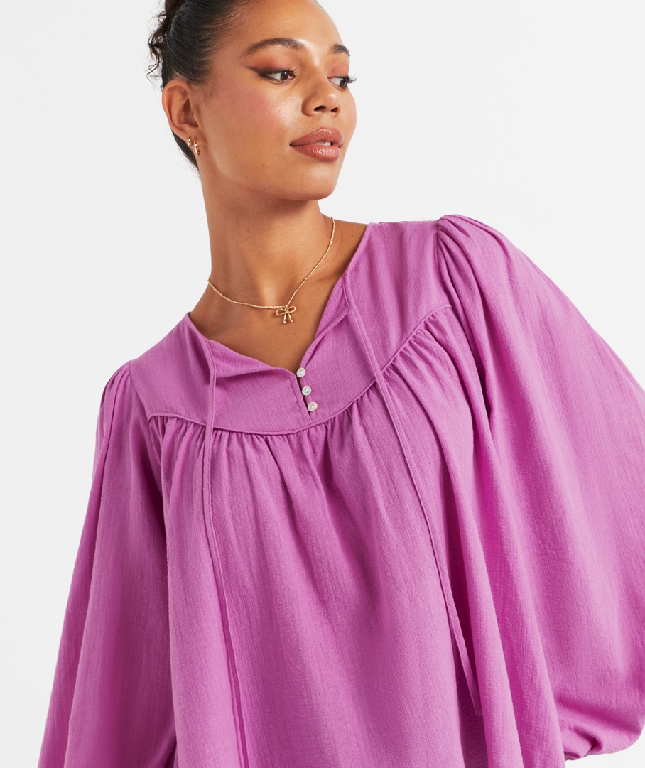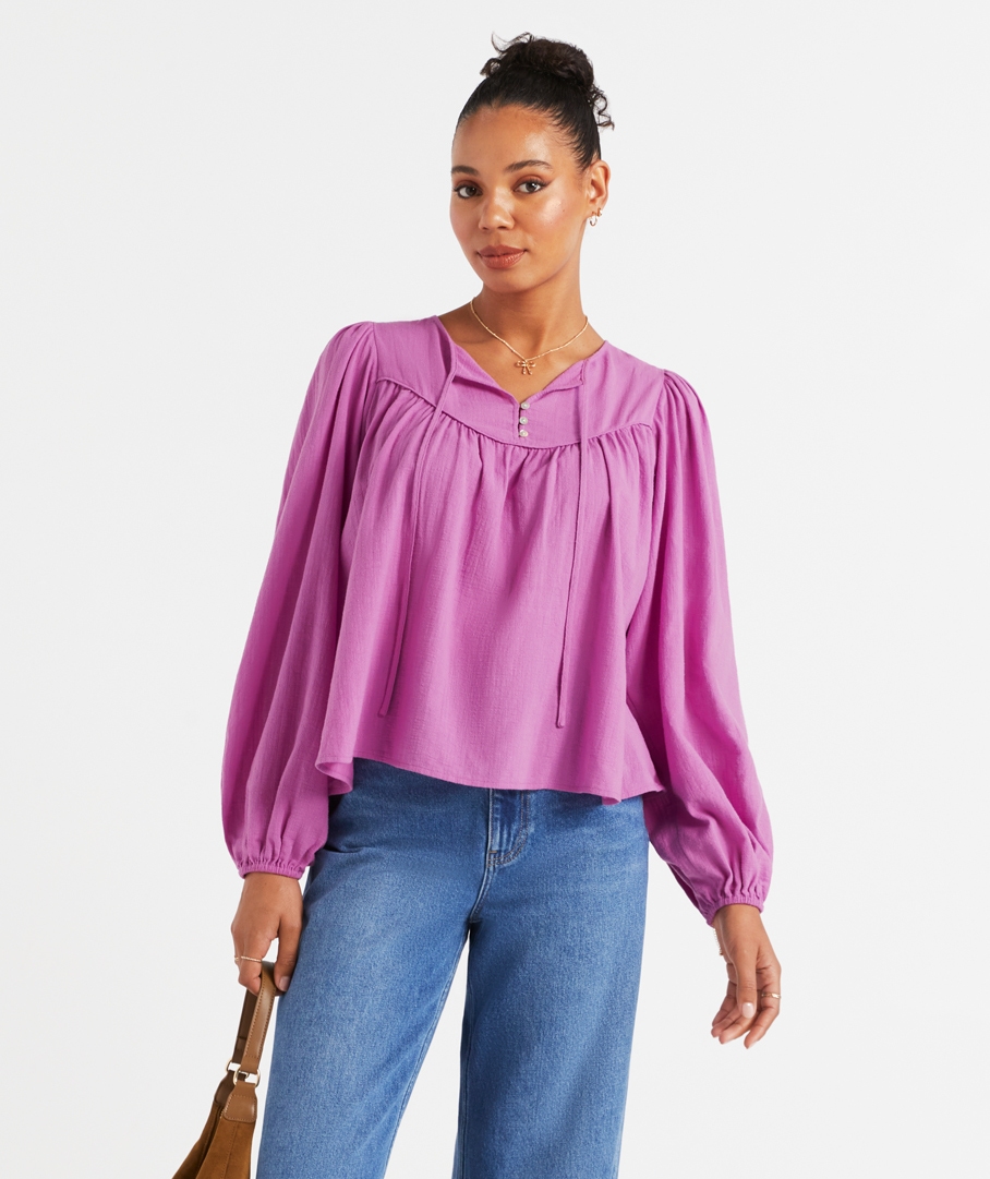 Step out in style with the Briar Jacquard Blouse this season! Designed in a flowing fit, tie detailing on the front, and long sleeves with elastic around the wrists. It's the perfect top for any occasion. For a night event, elevate your look with tailored pants or a skirt, and statement jewellery. For a casual day out, pair with jeans and hat.