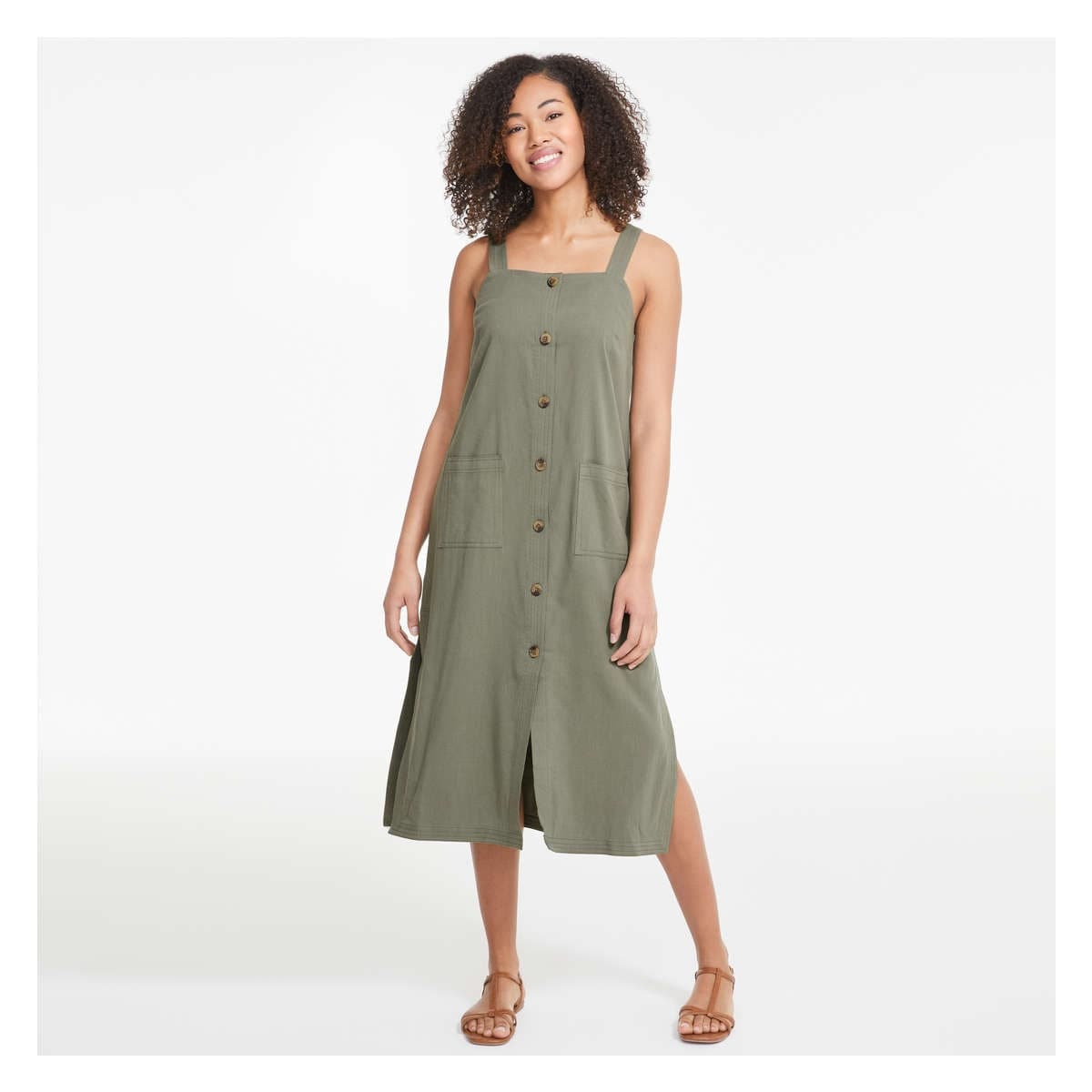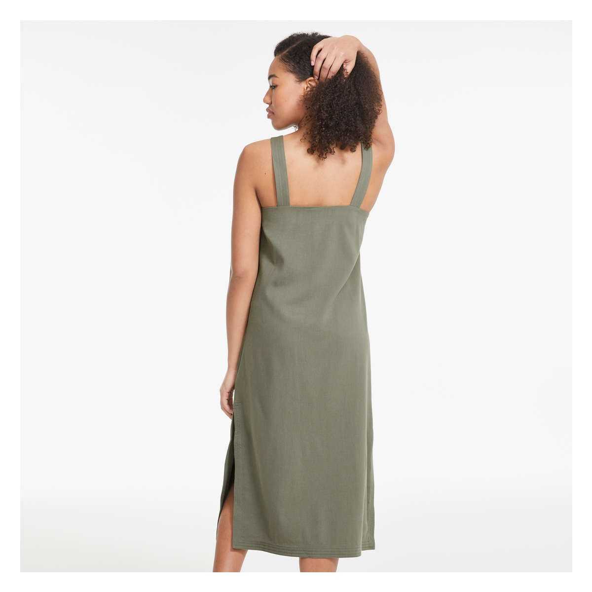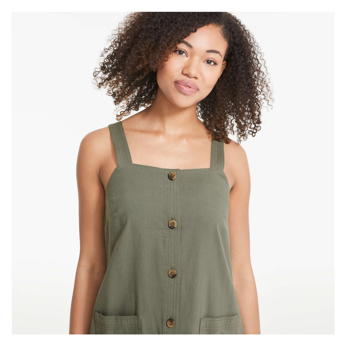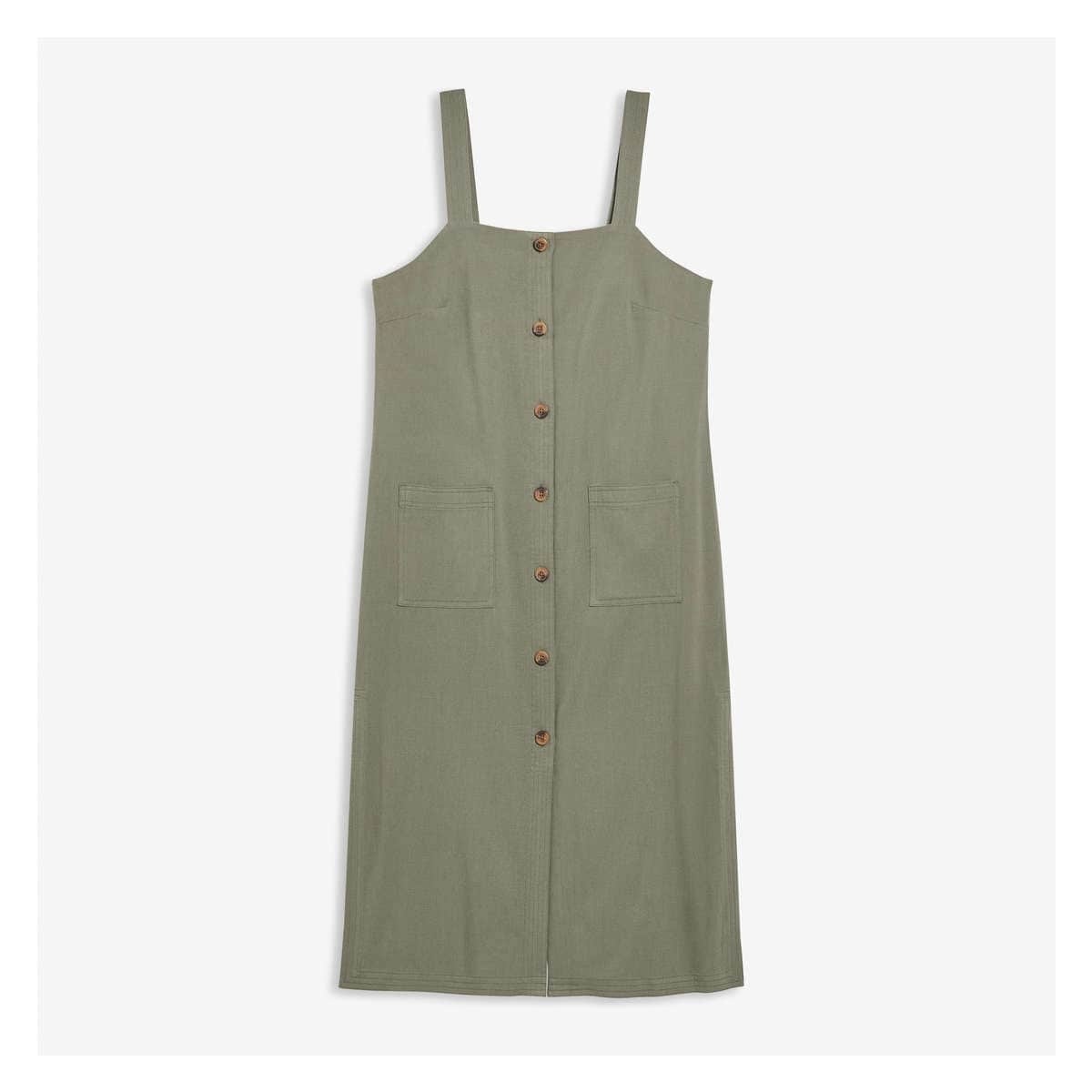Twill dress with square neck, sleeveless, full-button closure, and two patch pockets.
