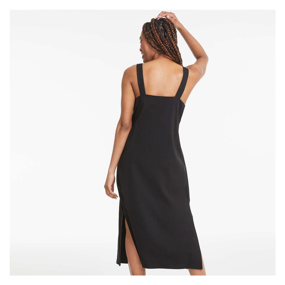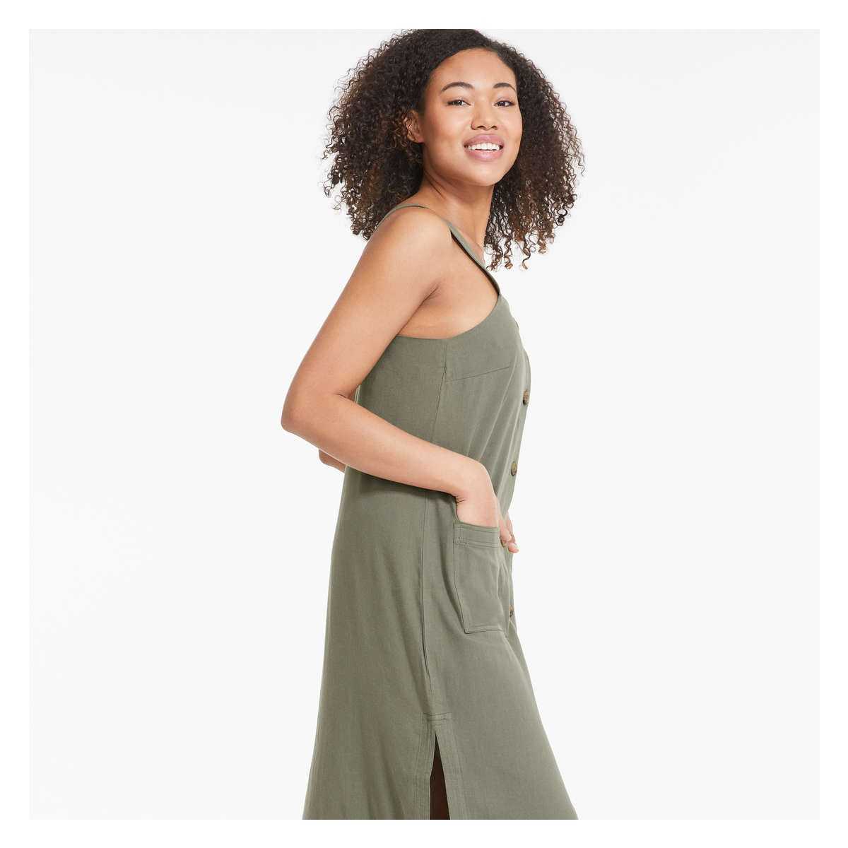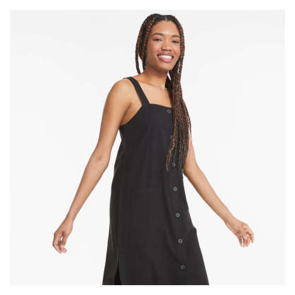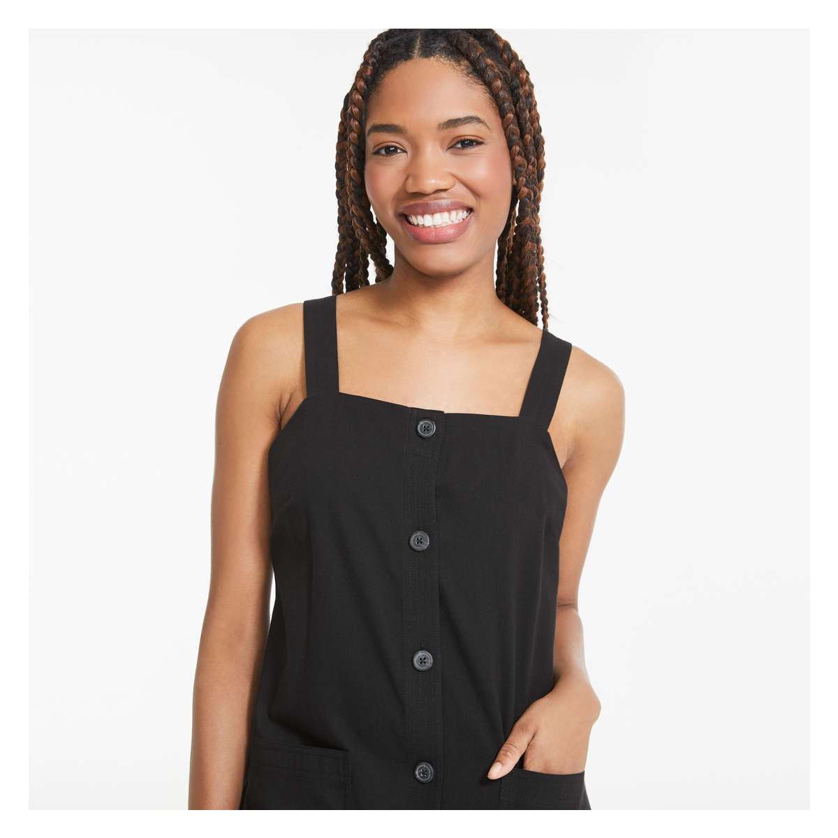 Twill dress with square neck, sleeveless, full-button closure, and two patch pockets.