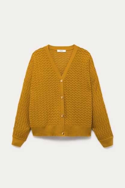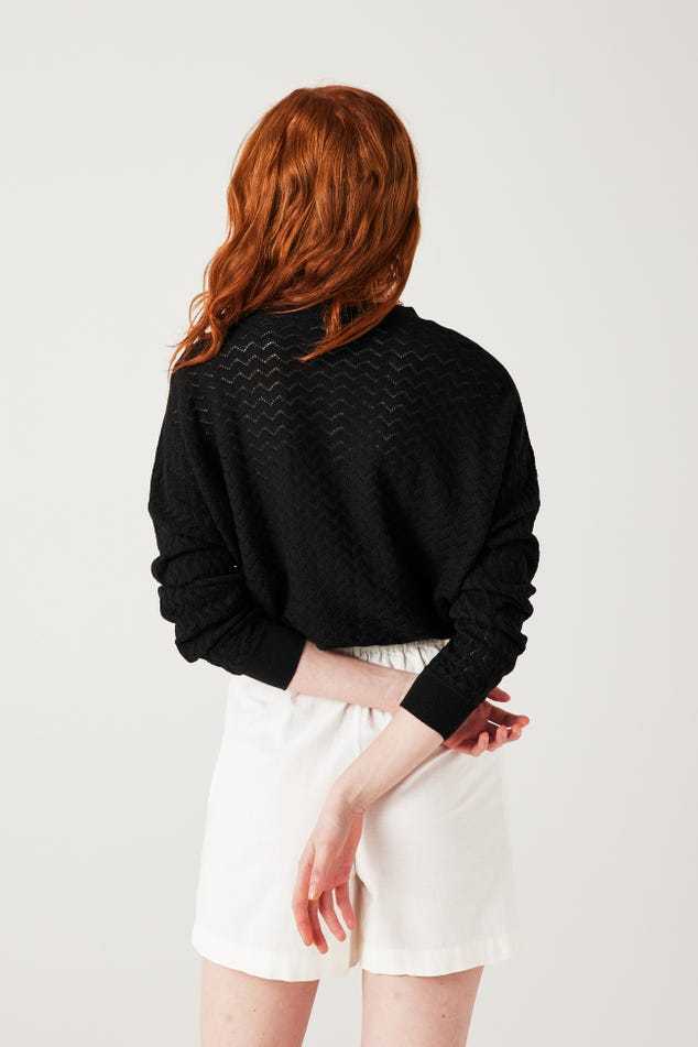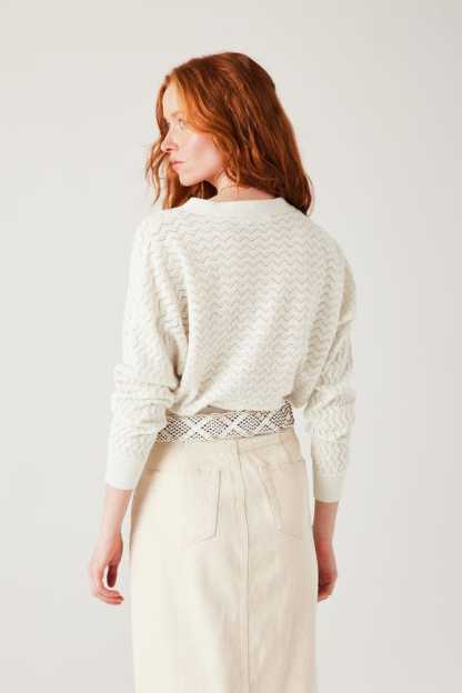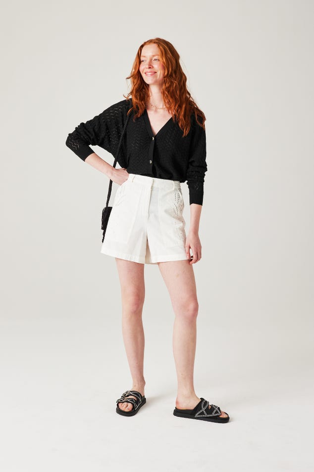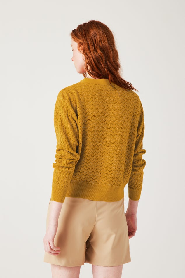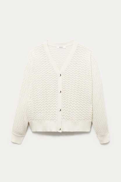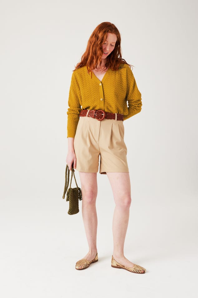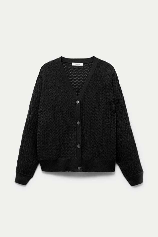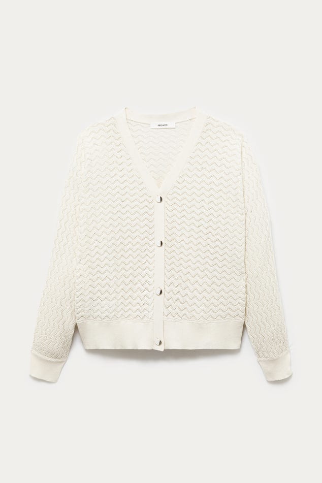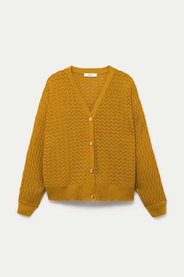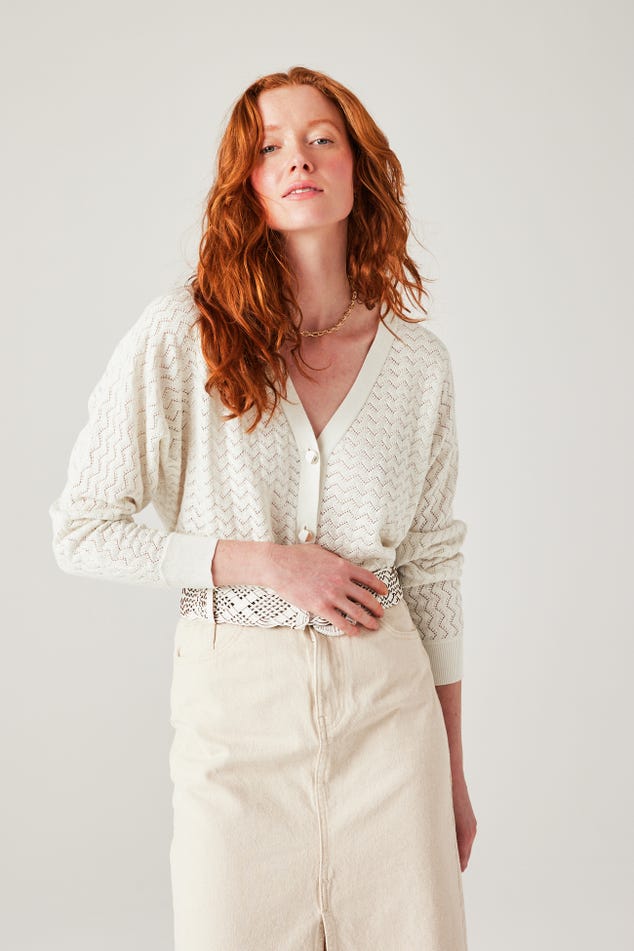 La maille copie la dentelle et joue avec des ajours discrets. La coupe oversize apporte beaucoup de modernité à ce gilet col V. Et les boutons bicolores haussent le chic. On adore, avec un simple jean, une jupe droite ou un pantalon de tailleur. Coupe ample resserrée à la base. Emmanchures descendues. Manches longues. Base droite. Bords-côtes. Contient des fibres recyclées.