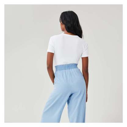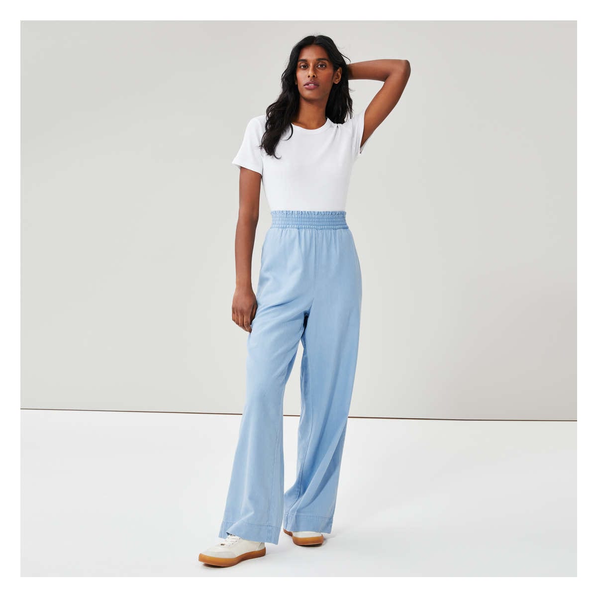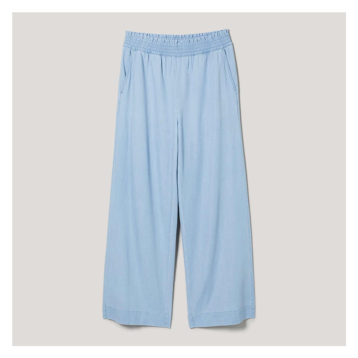 Chambray pants with elastic waist, two slash pockets, light wash, high rise, and wide legs.