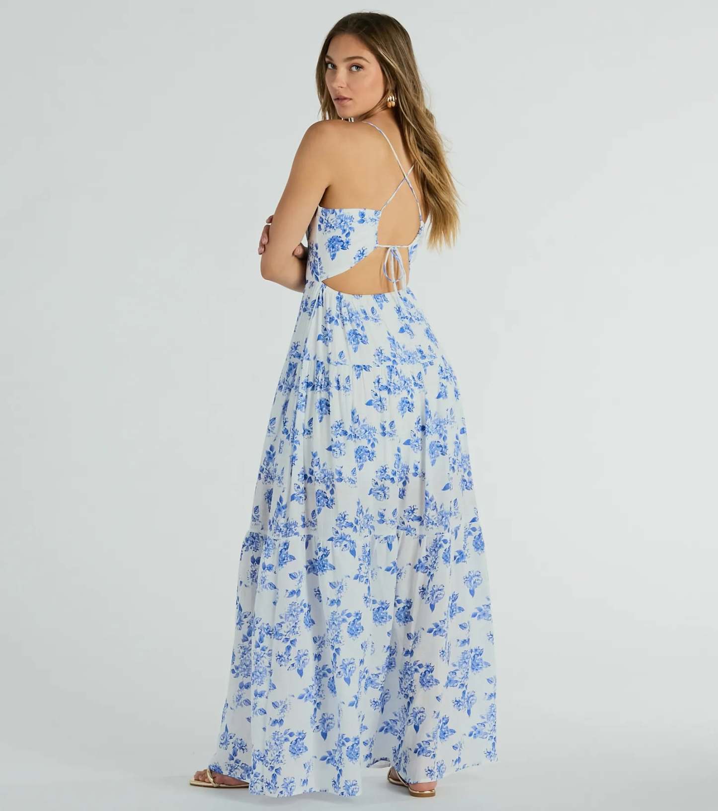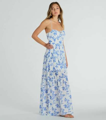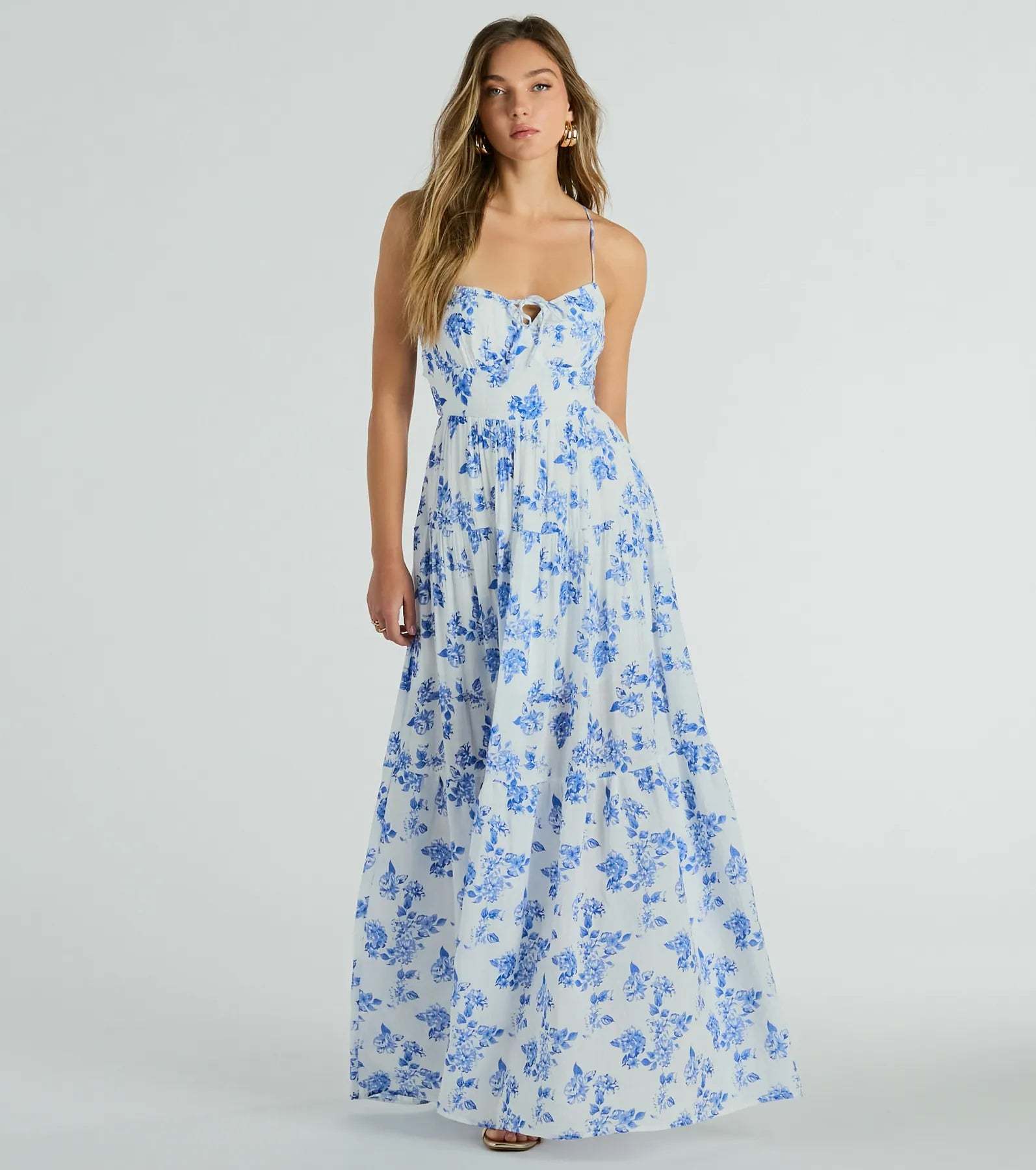 Give off a charming vibe at summer parties in this simply stunning floral woven maxi dress! The breezy lightweight woven fabric is detailed with a gorgeous floral print pattern and includes a mini-length lining for coverage. The sleeveless bodice is shaped with a sweetheart neckline, a dainty tie-front bust design for a cute detail, and spaghetti straps leading to an open back with a cross-back strappy design and a customized tie closure. The fitted high waist flows out to a maxi-length hem with an effortlessly chic A-line silhouette. Style with hoop earrings and .