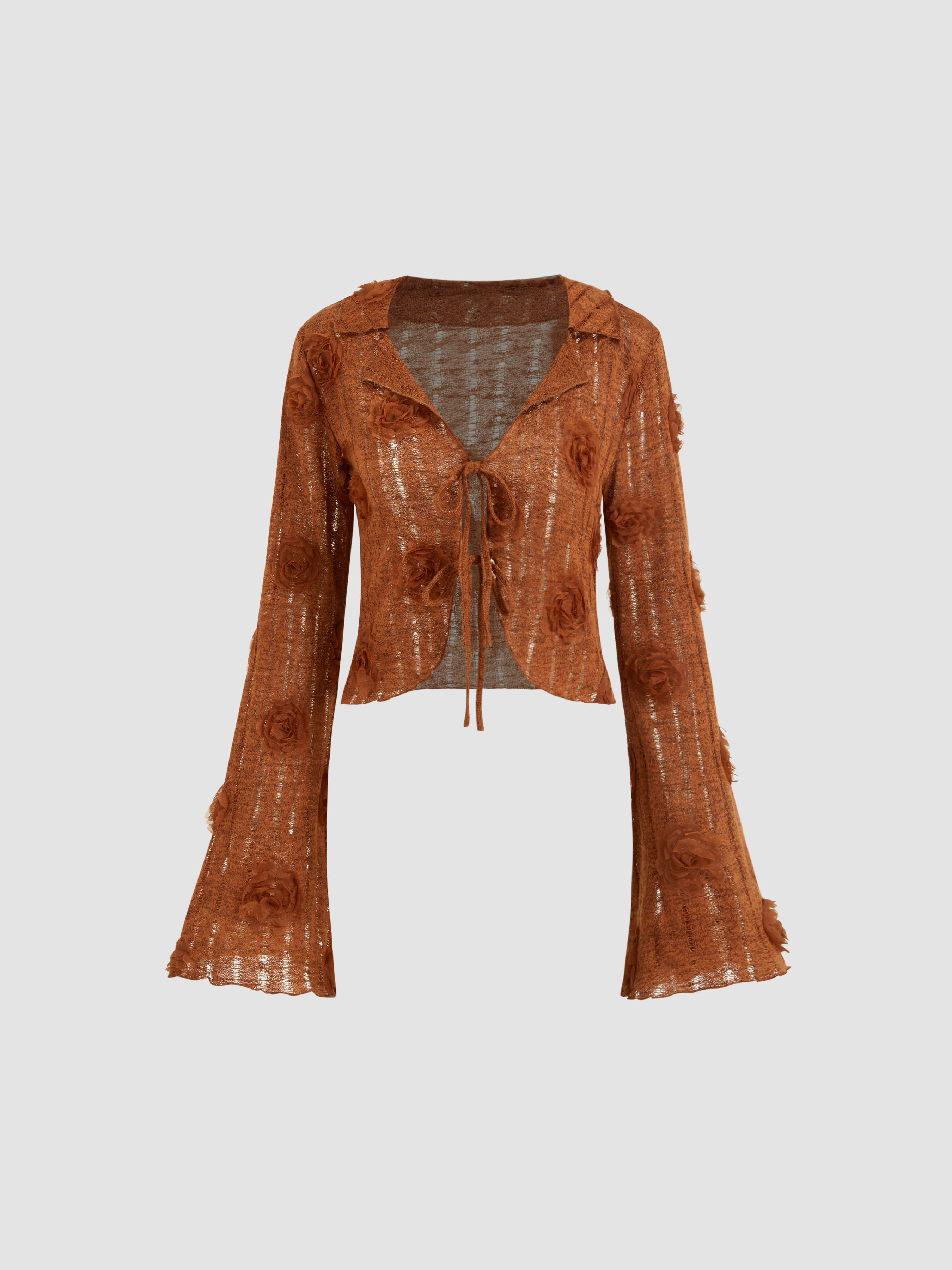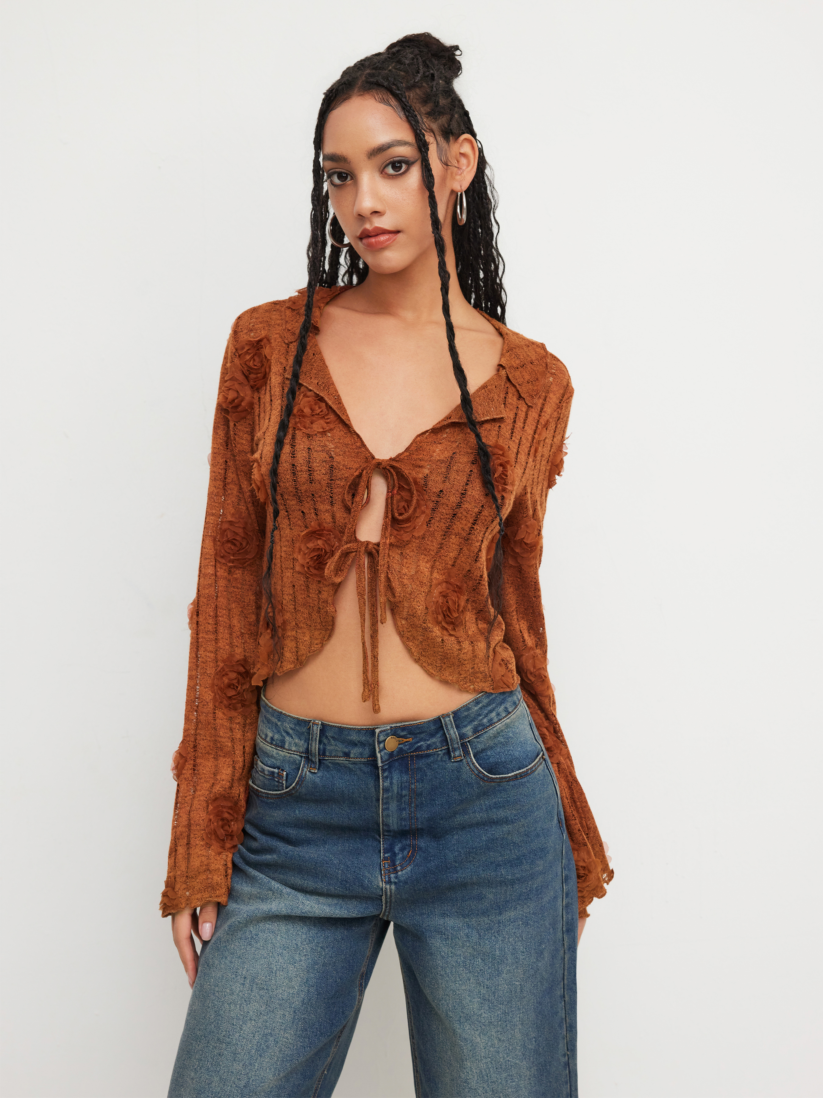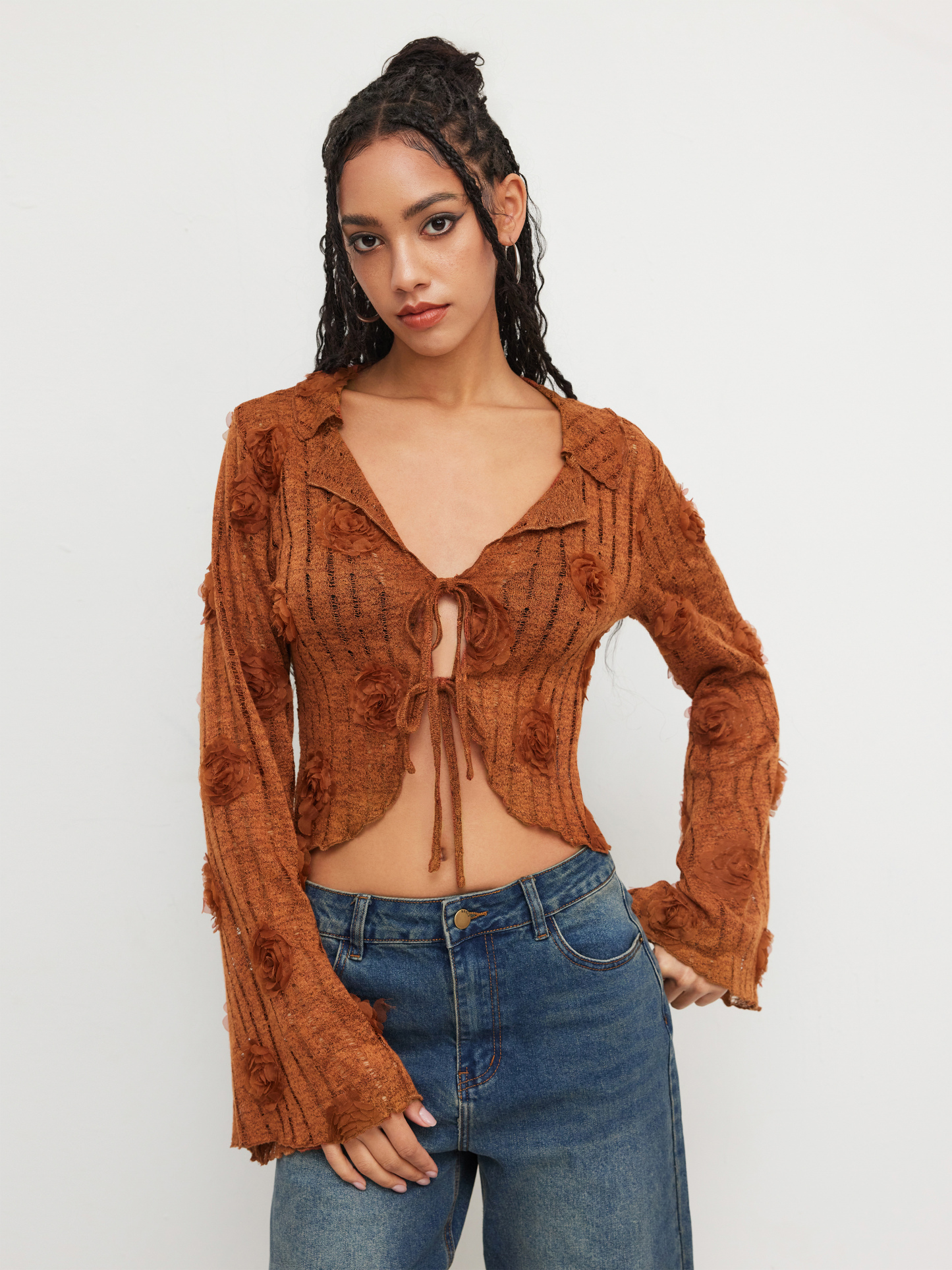 Composition: 100% Polyester Stretch: High Fit Type: Regular Fabric Thickness: Moderate Fabric Sheerness: Semi-transparent Occasion: Music Festival/Live House Pattern Type: Floral Lining: Unlined Length: Crop Material: Knit Fabric Neckline: Collar Pattern Detail: Floral Clothing Detail: Tie Front