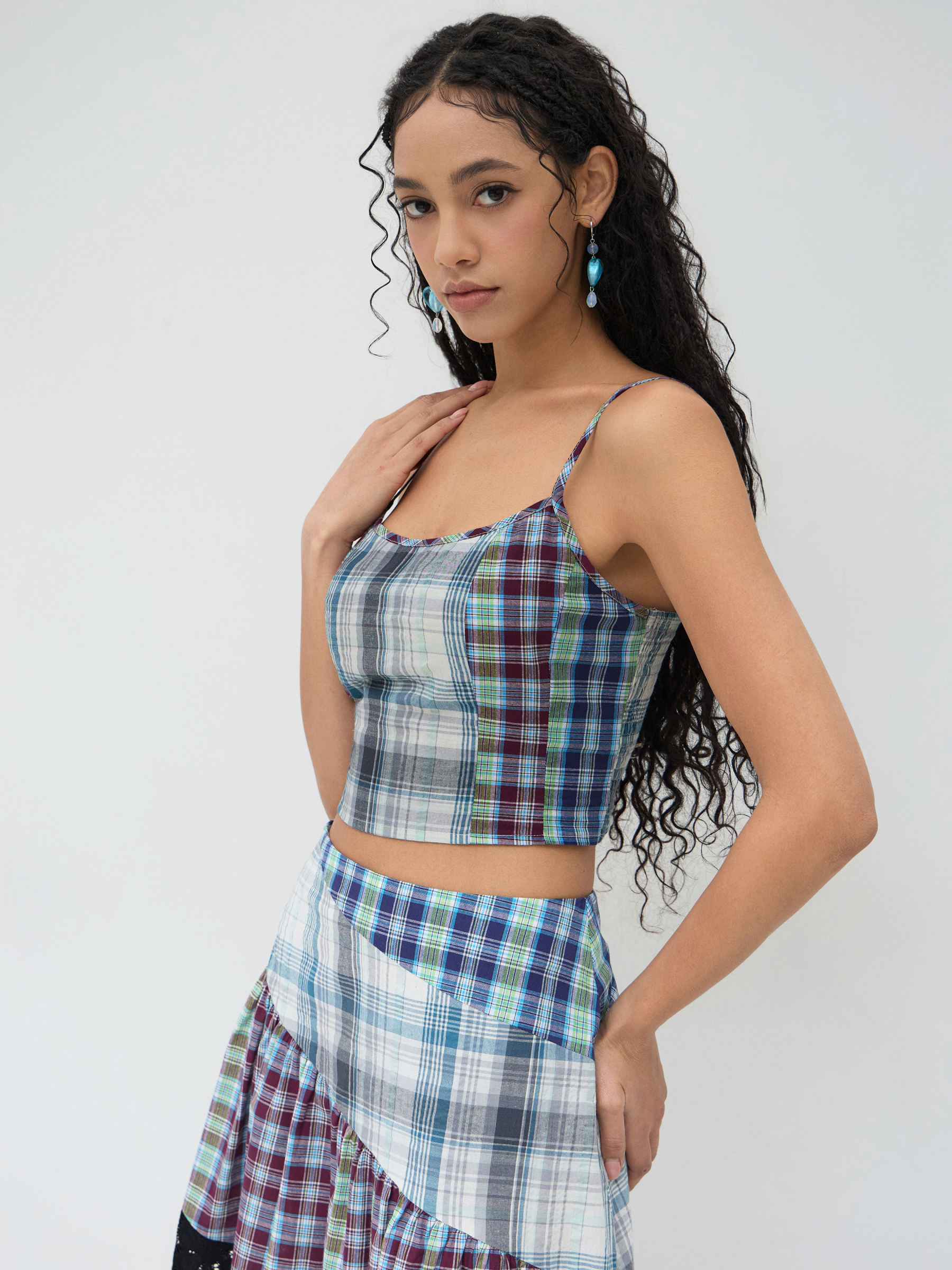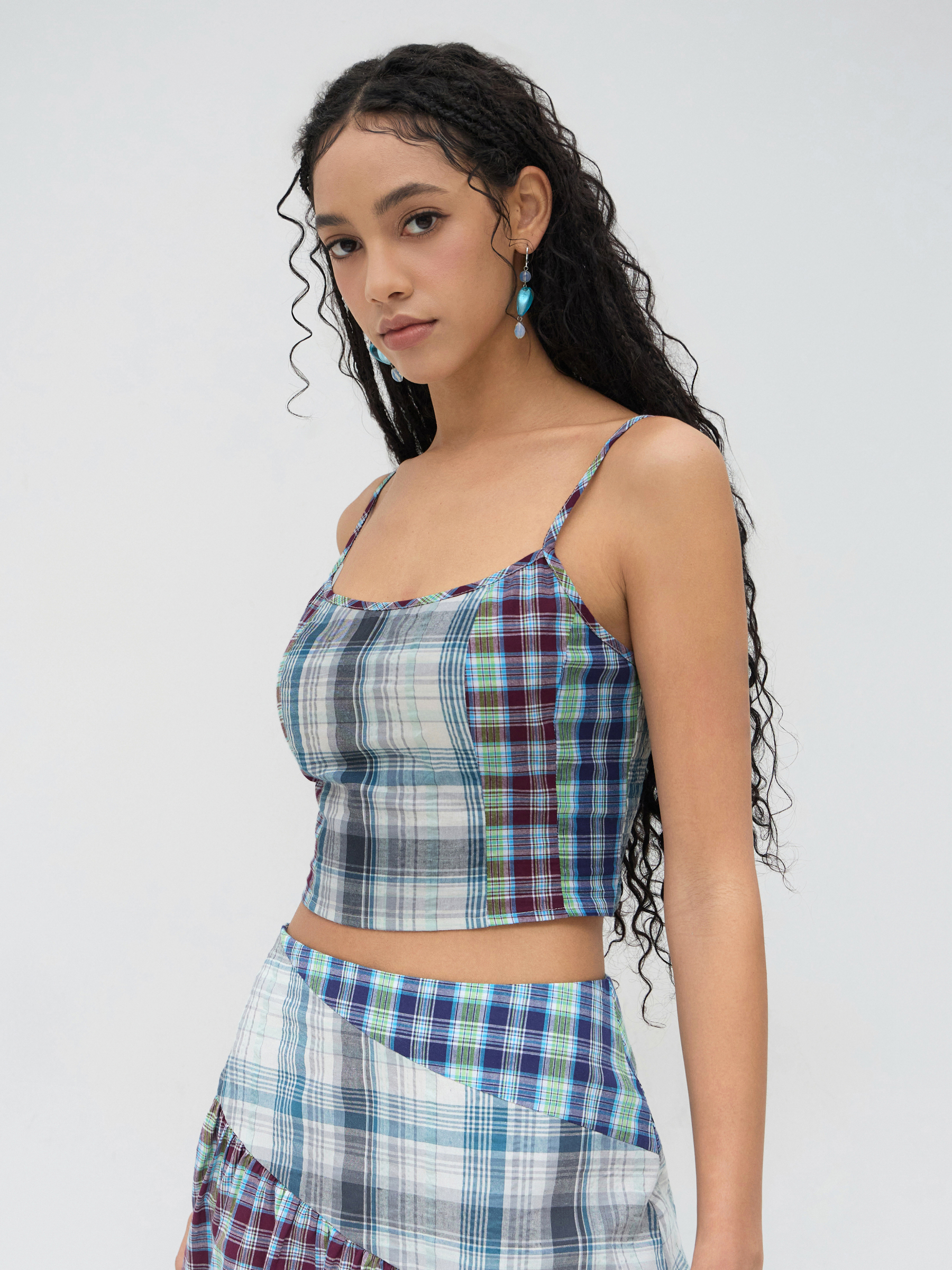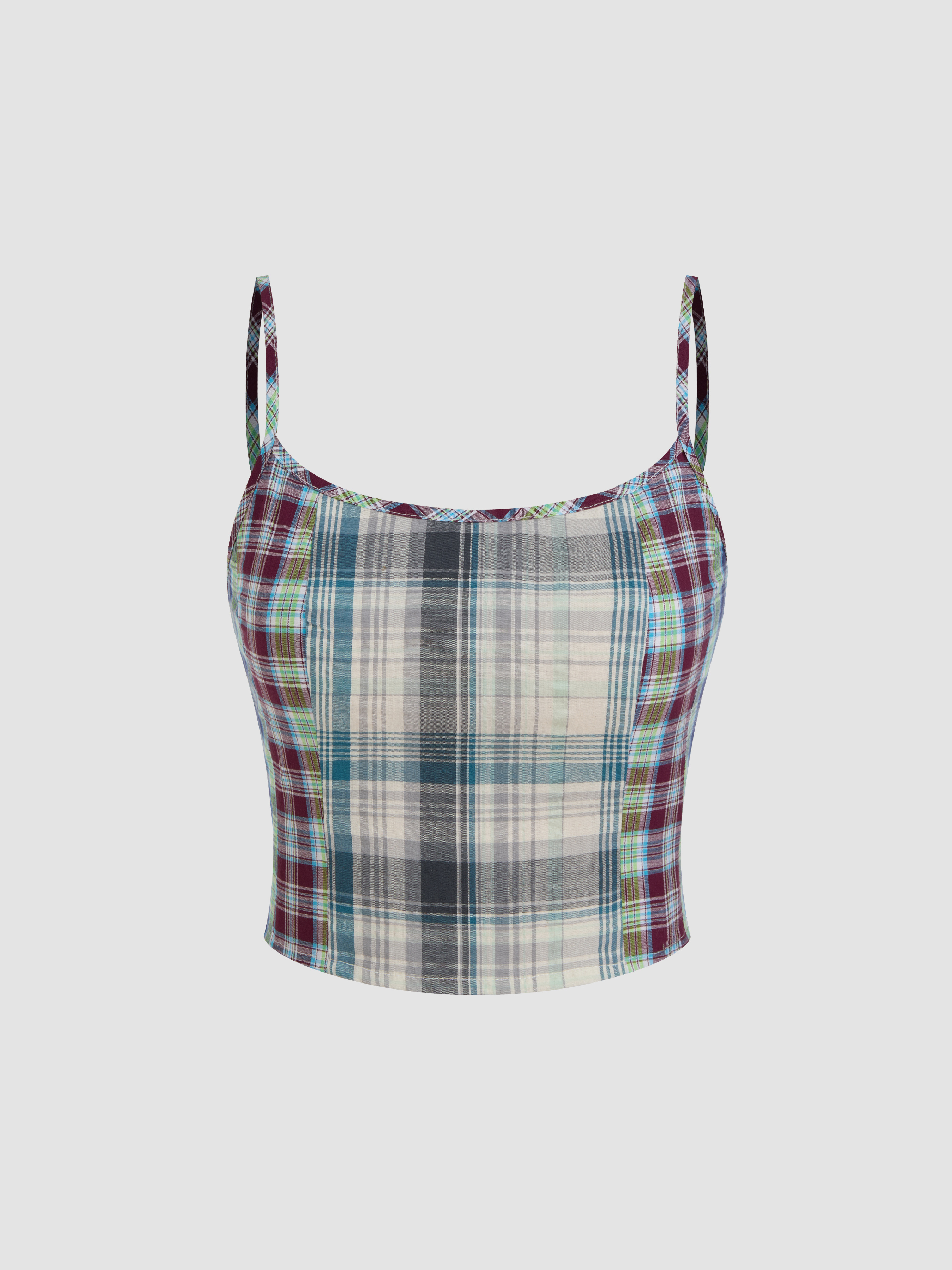 COTTON-BLEND U-NECKLINE PLAID PATCHED CROP CAMI TOP
