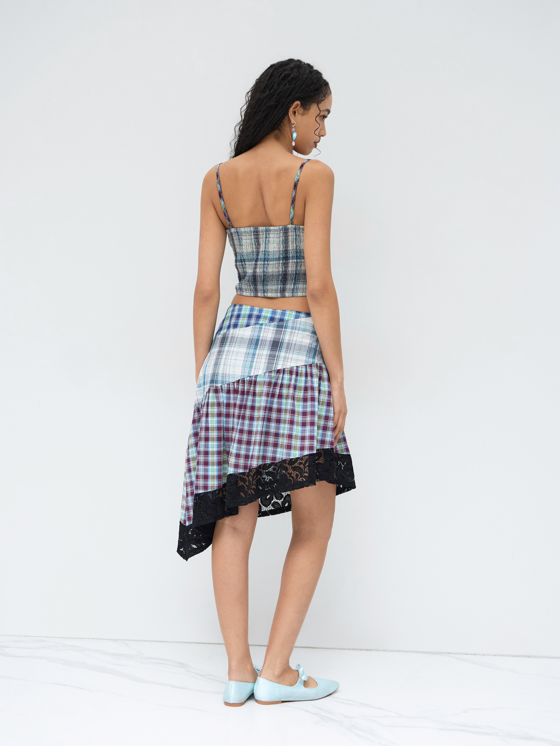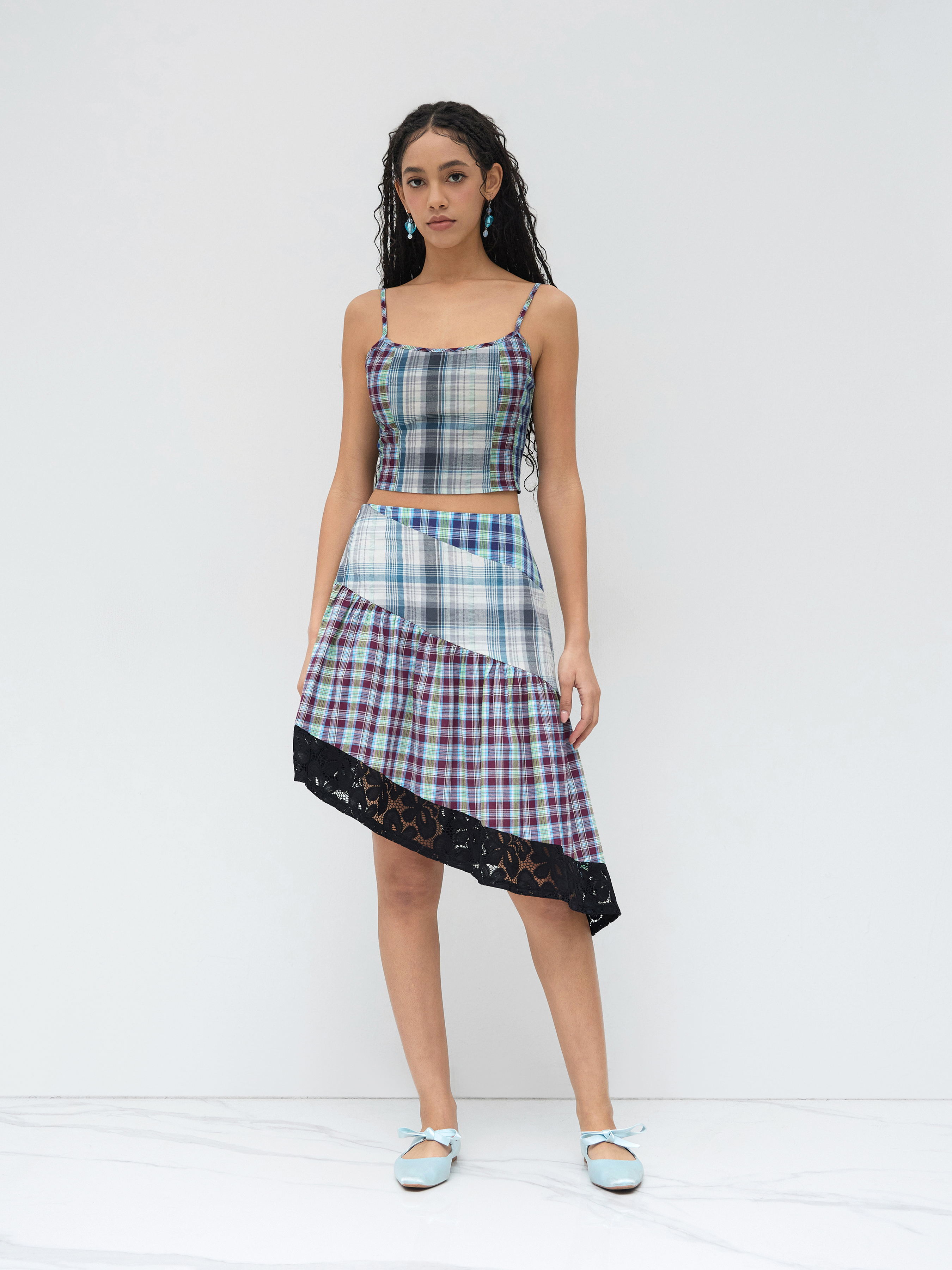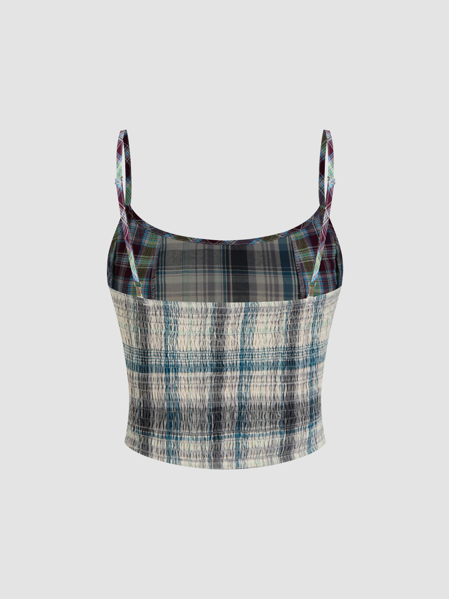 COTTON-BLEND U-NECKLINE PLAID PATCHED CROP CAMI TOP