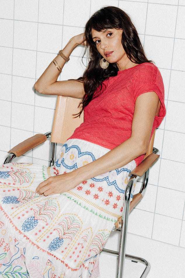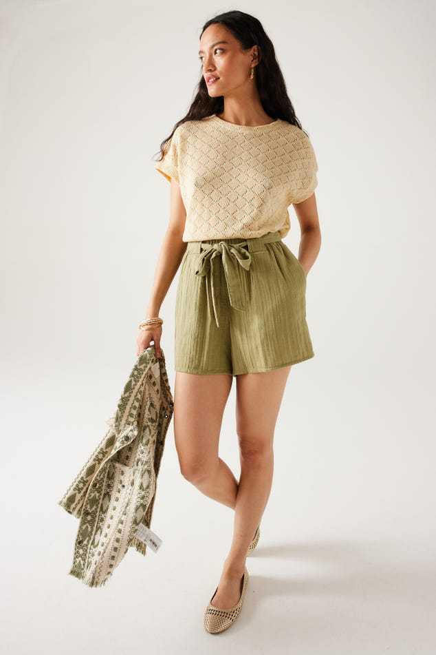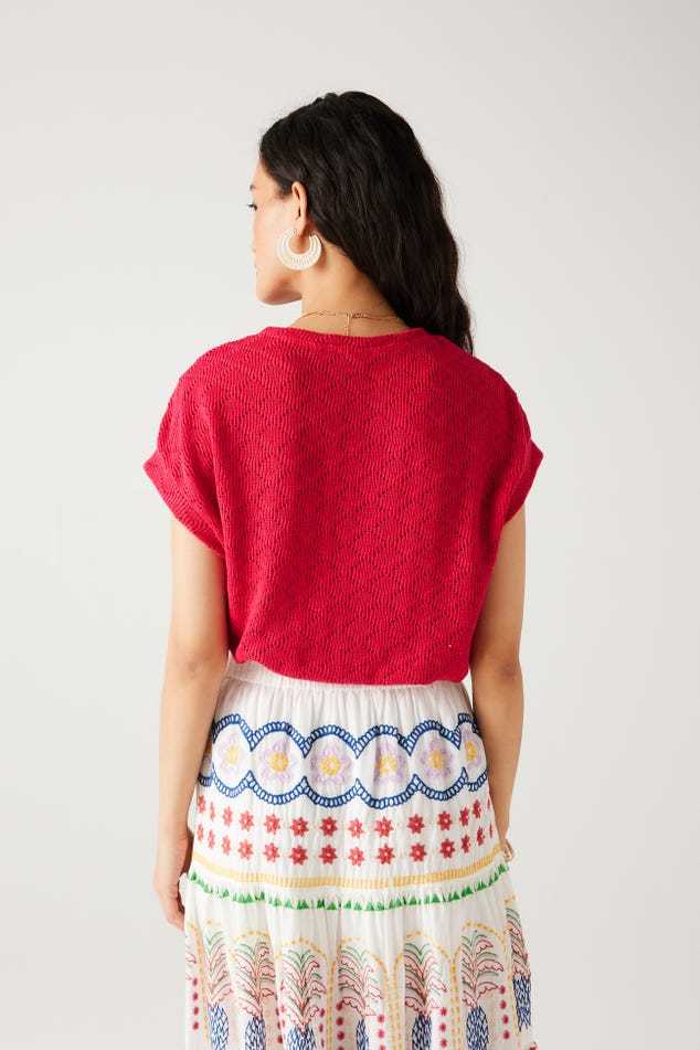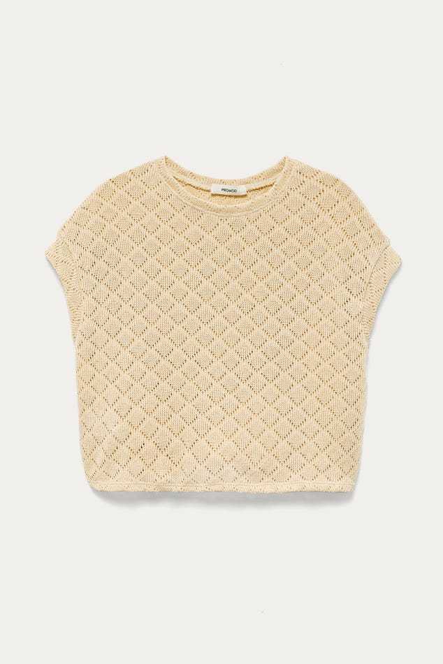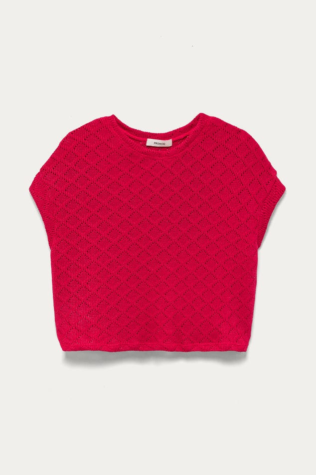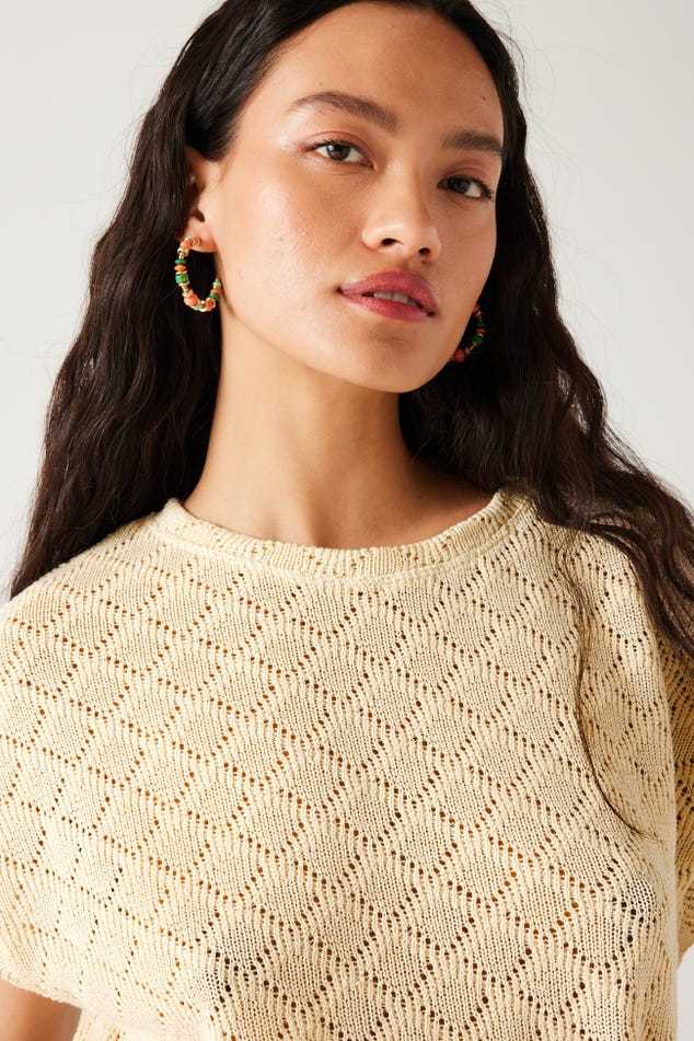 Les ajours discrets ont beaucoup de succès : démonstration cool et stylée avec ce top en maille fine qui s'amuse avec un motif losange répété. La coupe est courte et large. Maille fine et souple. Encolure arrondie. Emmanchures descendues. Manches très courtes, bords marqués. Base droite. Coutures ton sur ton.
