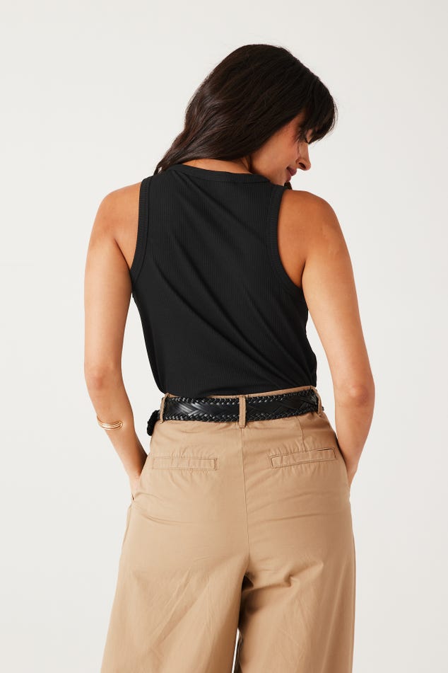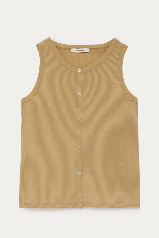 Allure sportswear le jour. Esprit cool les soirs d'été. Bon basique toute l'année. Ce débardeur côtelé aime varier les styles en fonction des envies du moment ! A accessoiriser avec des bijoux. A porter en duo avec un short en jean, un pantalon large, une jupe fluide... Coupe droite. Encolure arrondie. Boutons en décoration. Emmanchures américaines. Bords côtelés surpiqués. Base droite.