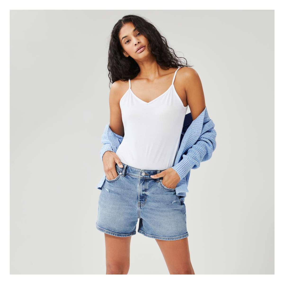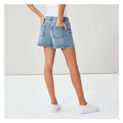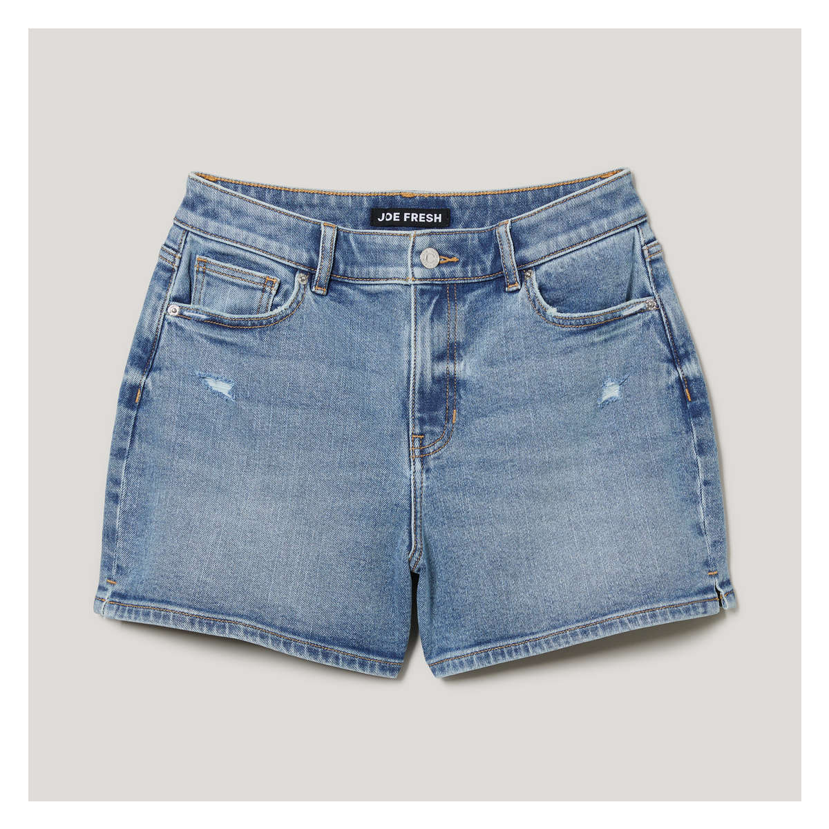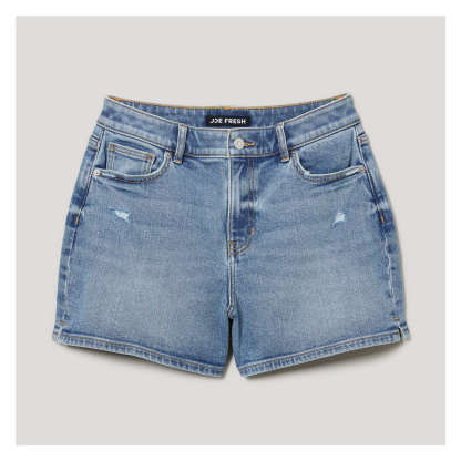 Make getting ready a breeze. With a high-rise fit, these women's denim shorts feature distressed details and a Brunswick wash for a classic look. Made with stretchy denim, they'll be comfy for all-day wear. The belt loops allow you to accessorize them with a belt to complete your look.