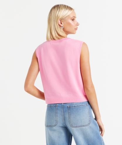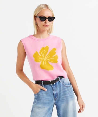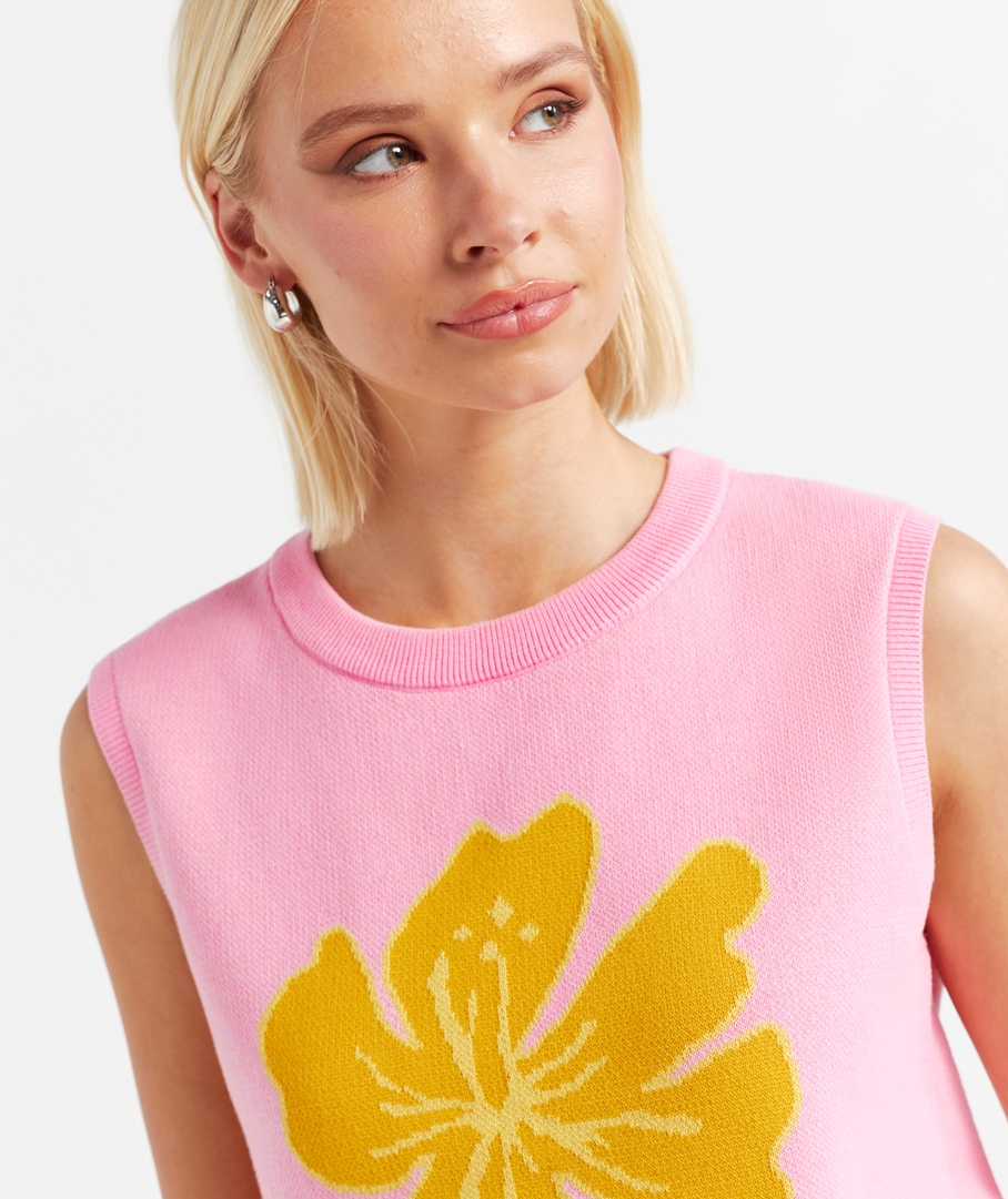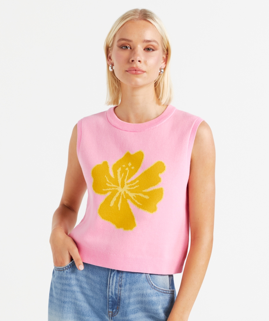 Be vacay ready with the Florence Hibiscus Jacquard Knit Vest! In a relaxed fit, with an eye-catching yellow hibiscus print in the centre on a pink base, and sleeveless. It's the perfect vest to pair with your fave shorts or jeans. Accessorise with sunglasses and statement earrings.