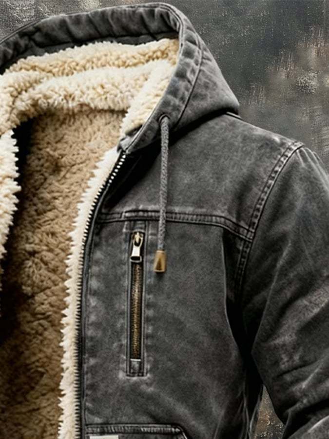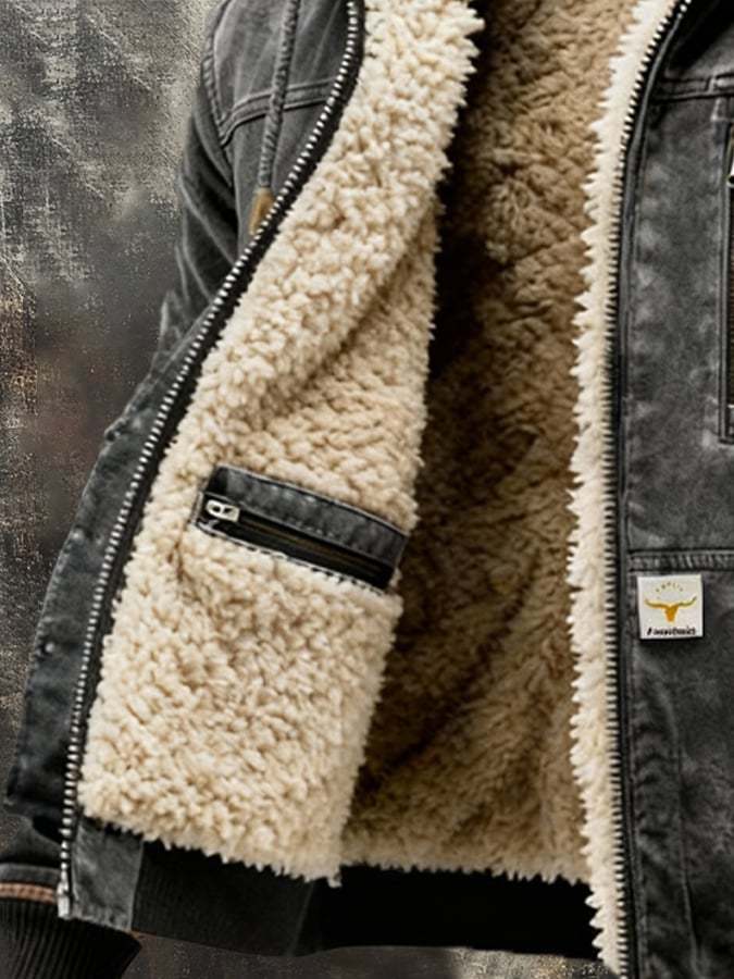 (Inner Pocket Design) Men's Retro Woven Pure Cotton Twill Multi-pocket Fleece-Lined Outdoor Jacket