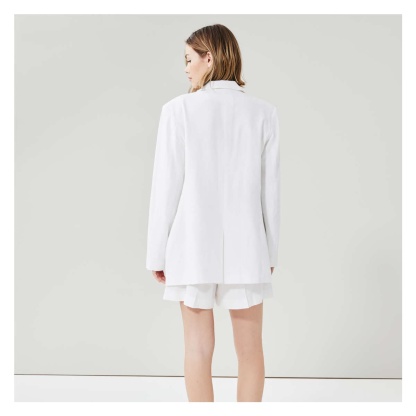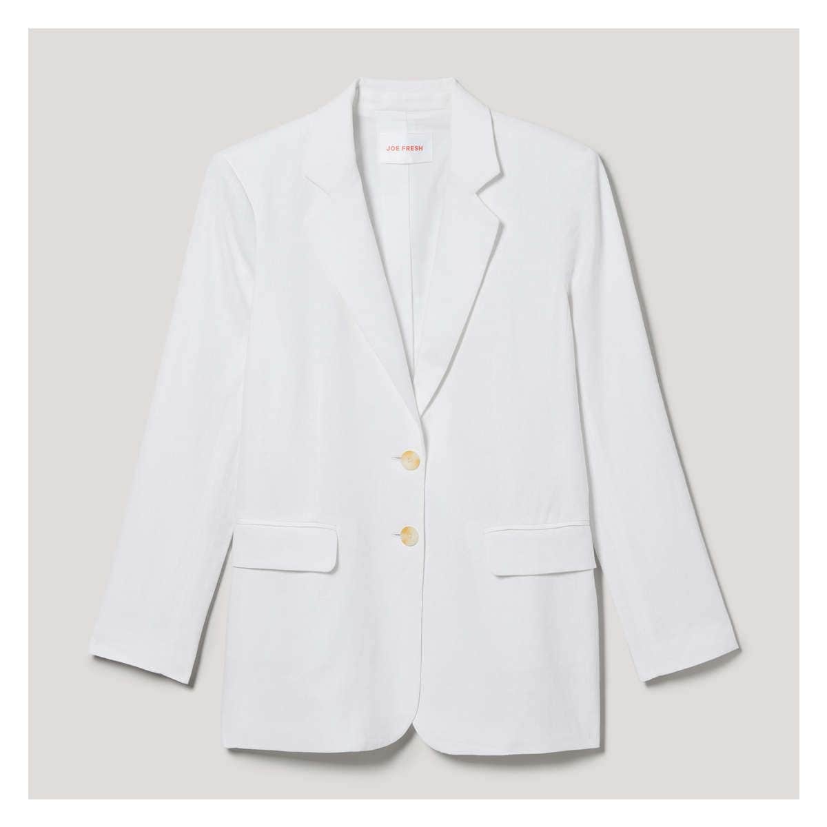 Linen-blend blazer with notch collar, long sleeves, two-button closure, and two flap pockets.