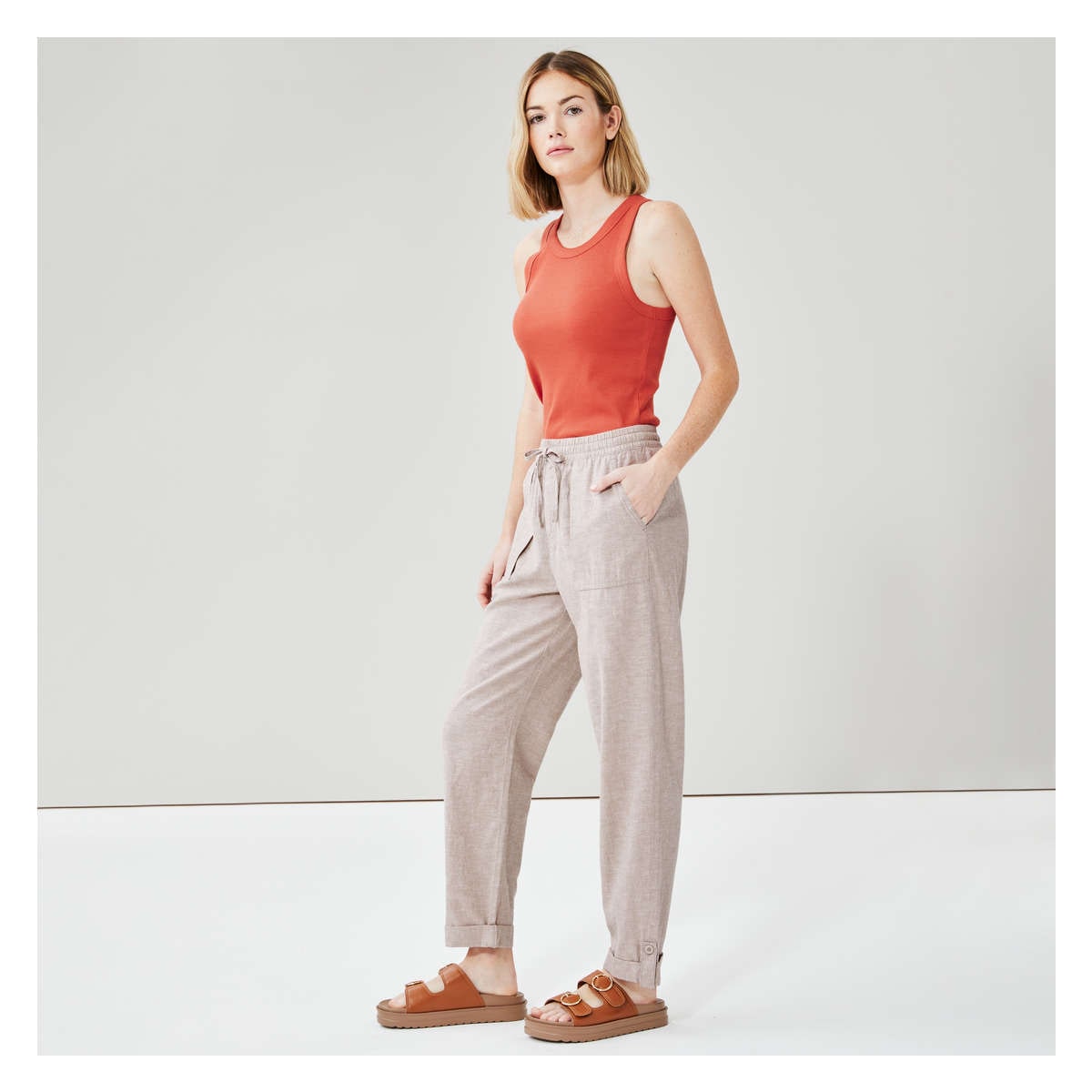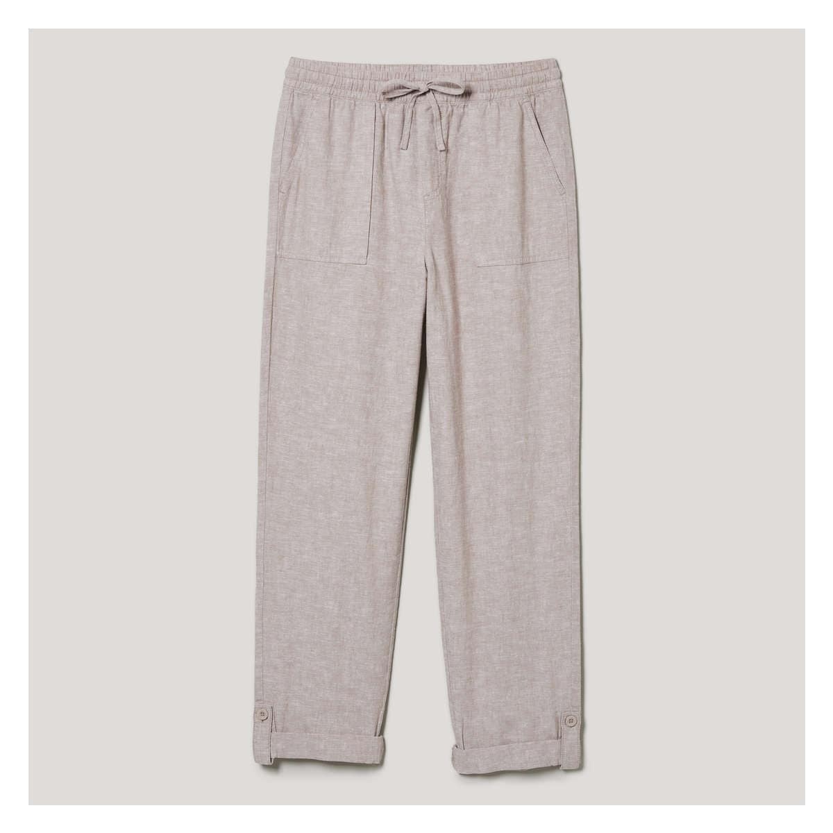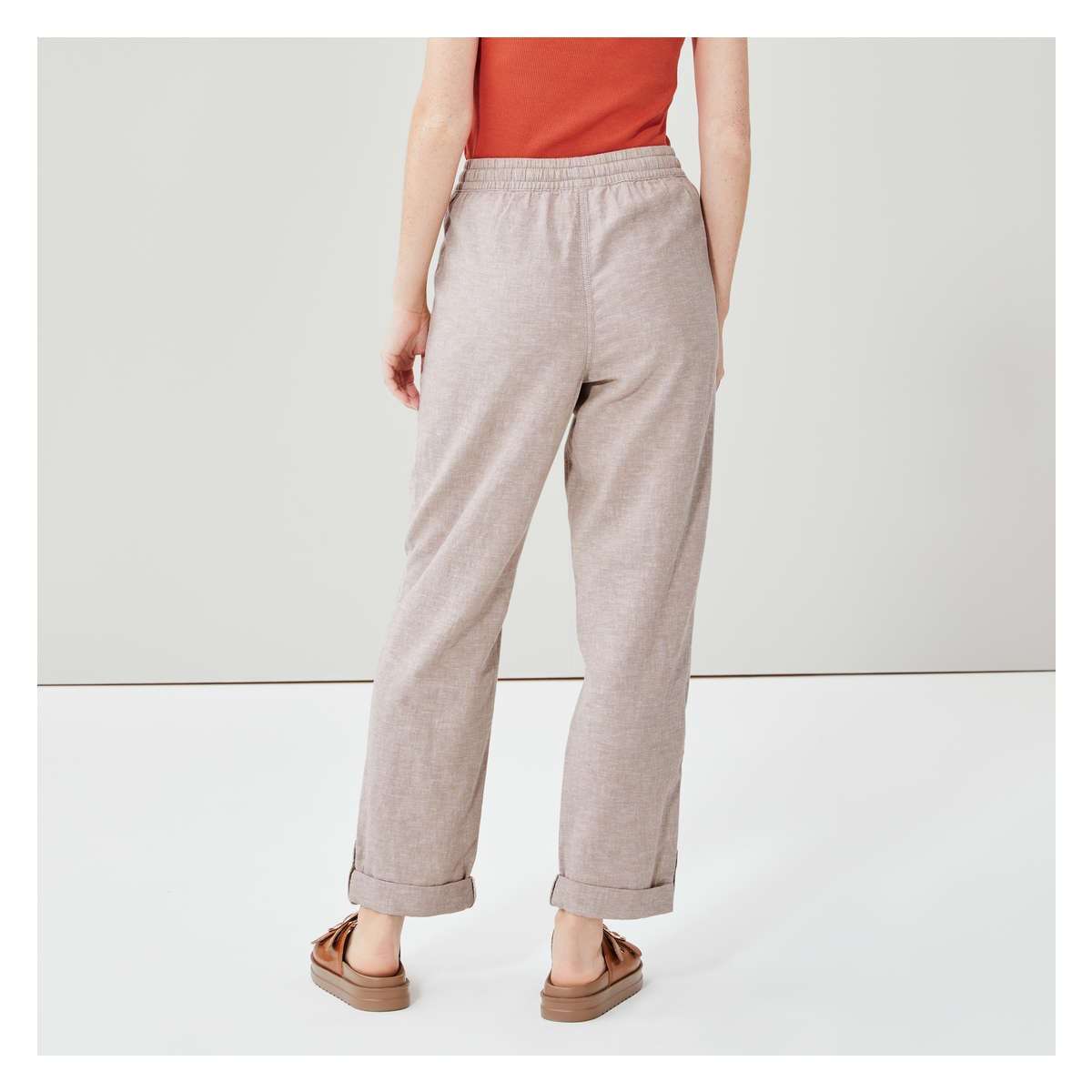 Pants with elastic waist, functional drawstring, two patch pockets, and rolled cuffs with button tabs.