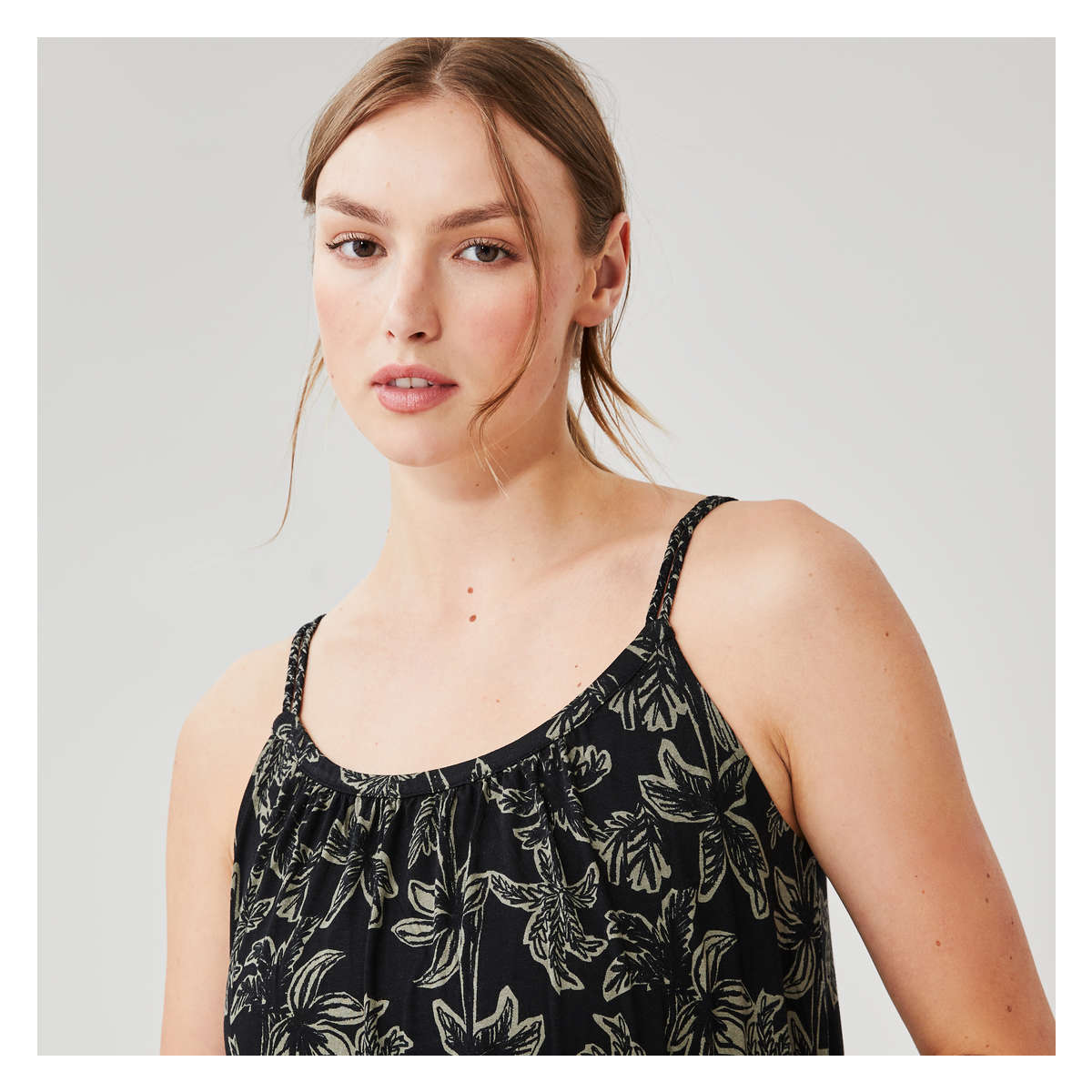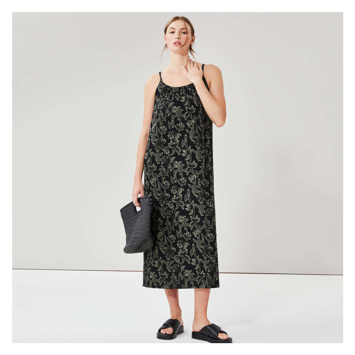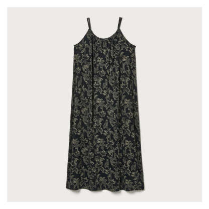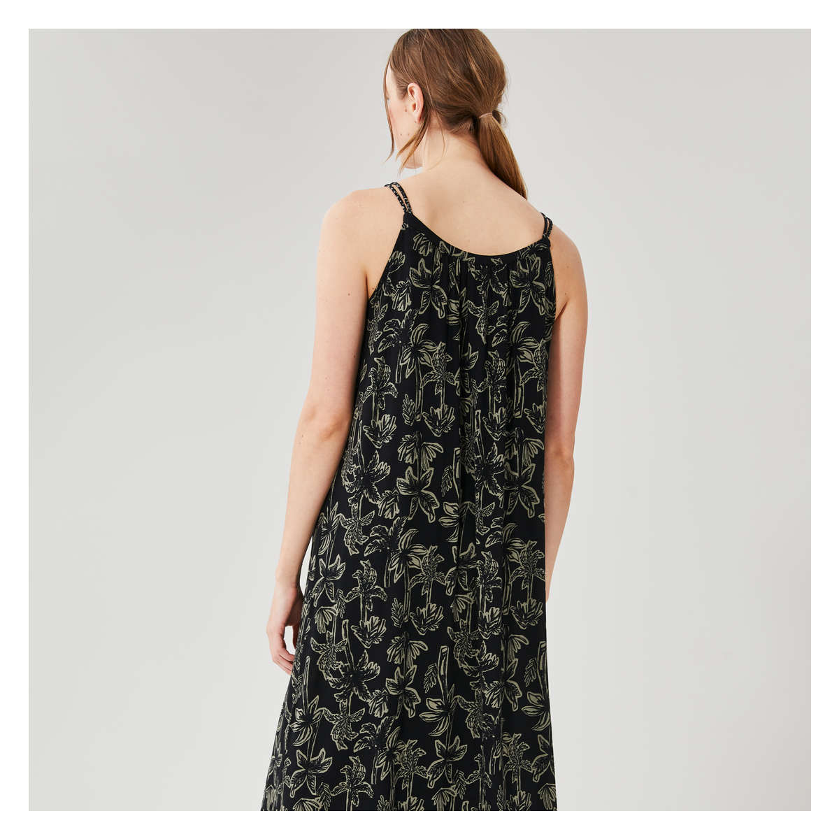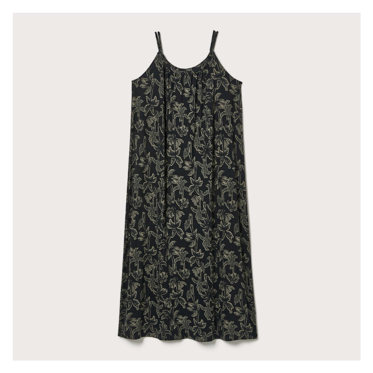 Maxi dress with scoop neck, double braided straps, all-over print, and relaxed fit.