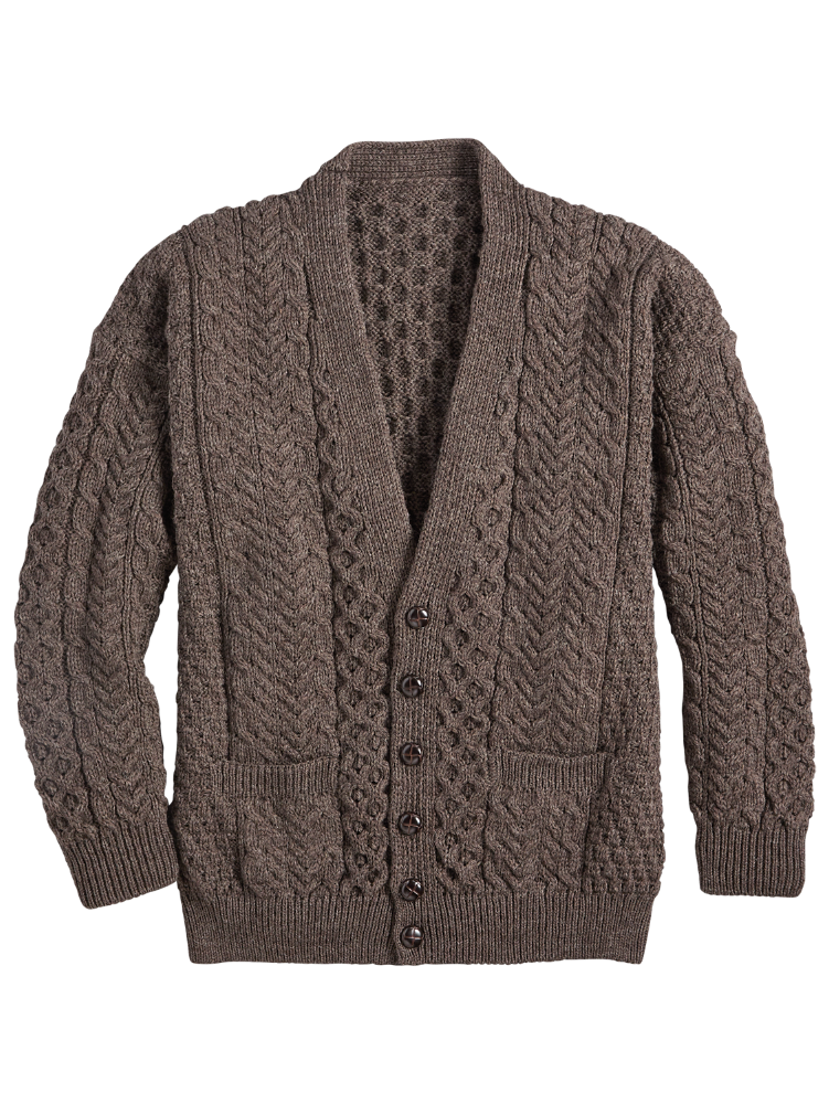 You'll stay warm and look great in this classic Irish cardigan. It's knit with premium wool with traditional stitching, including a classic cable stitch, representing a fisherman's rope that's thought to bestow good luck throughout life's journey. Details include a V-neck and two patch pockets.