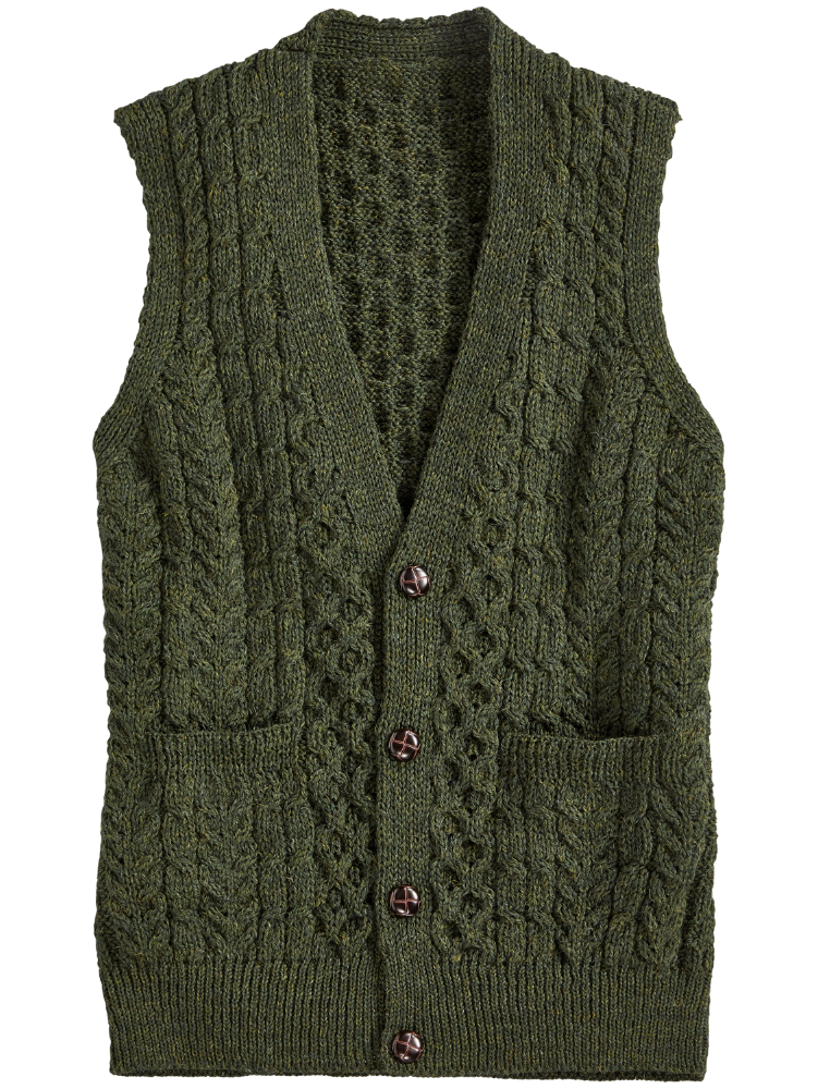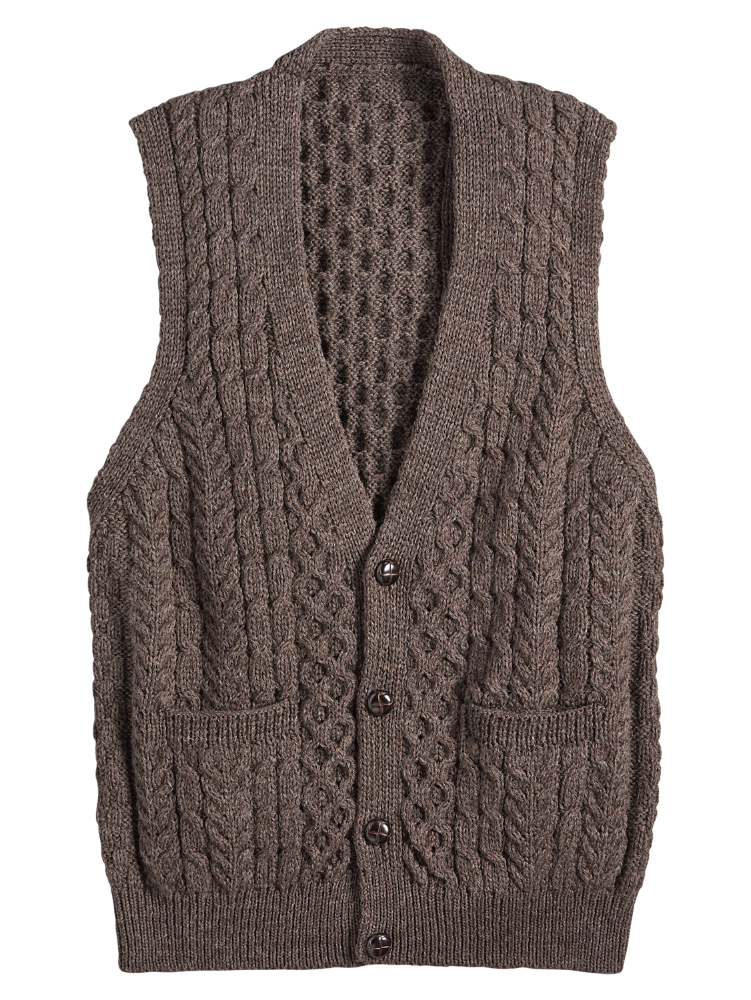 This classic Button Front Vest is expertly knit and hand finished in Ireland. Made from soft, insulating wool with traditional cable stitching.