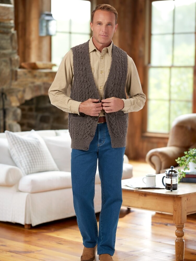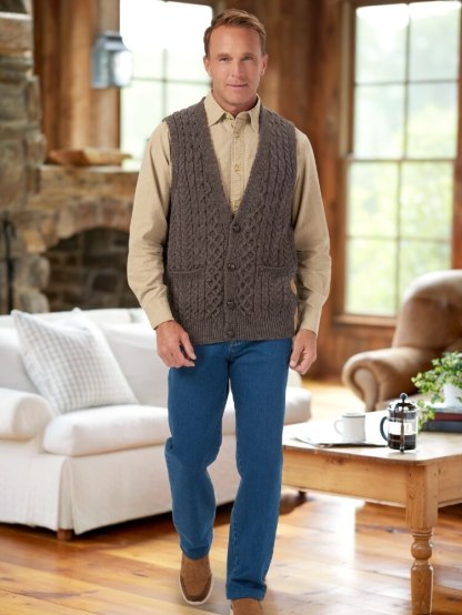 You'll stay warm and look great in this classic Irish sweater vest. It's knit with traditional stitching, including a classic cable stitch, representing a fisherman's rope that's thought to bestow good luck throughout life's journey. The pure wool is soft and insulating—and never itchy.