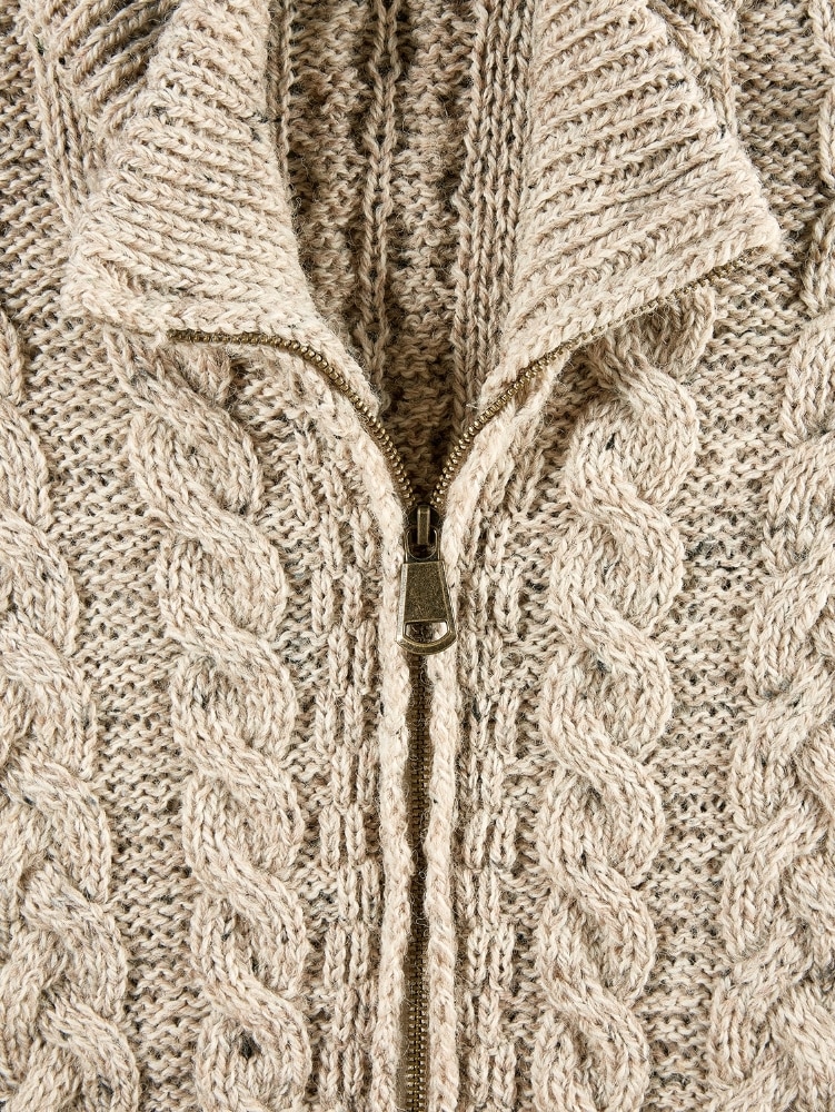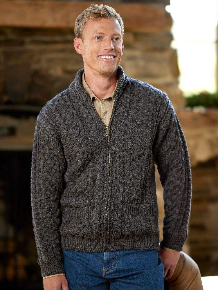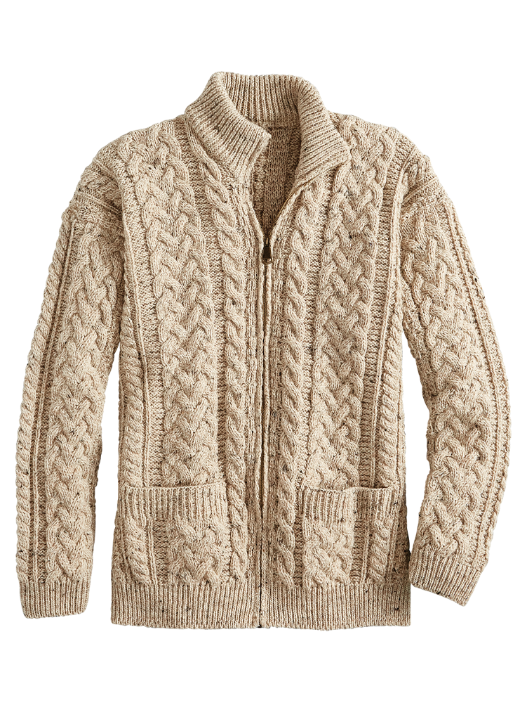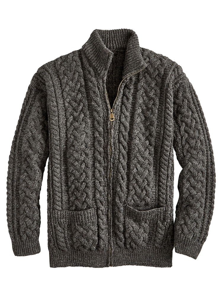 You'll stay warm and look great in this classic Irish sweater. It's knit in Ireland with traditional stitches, including a classic cable stitch, representing a fisherman's rope, signifying good luck and good fortune. The wool is soft and insulating—and never itchy. Details include a full-zip front, two patch pockets, and rib-knit cuffs and neckline.