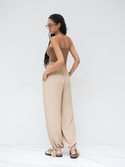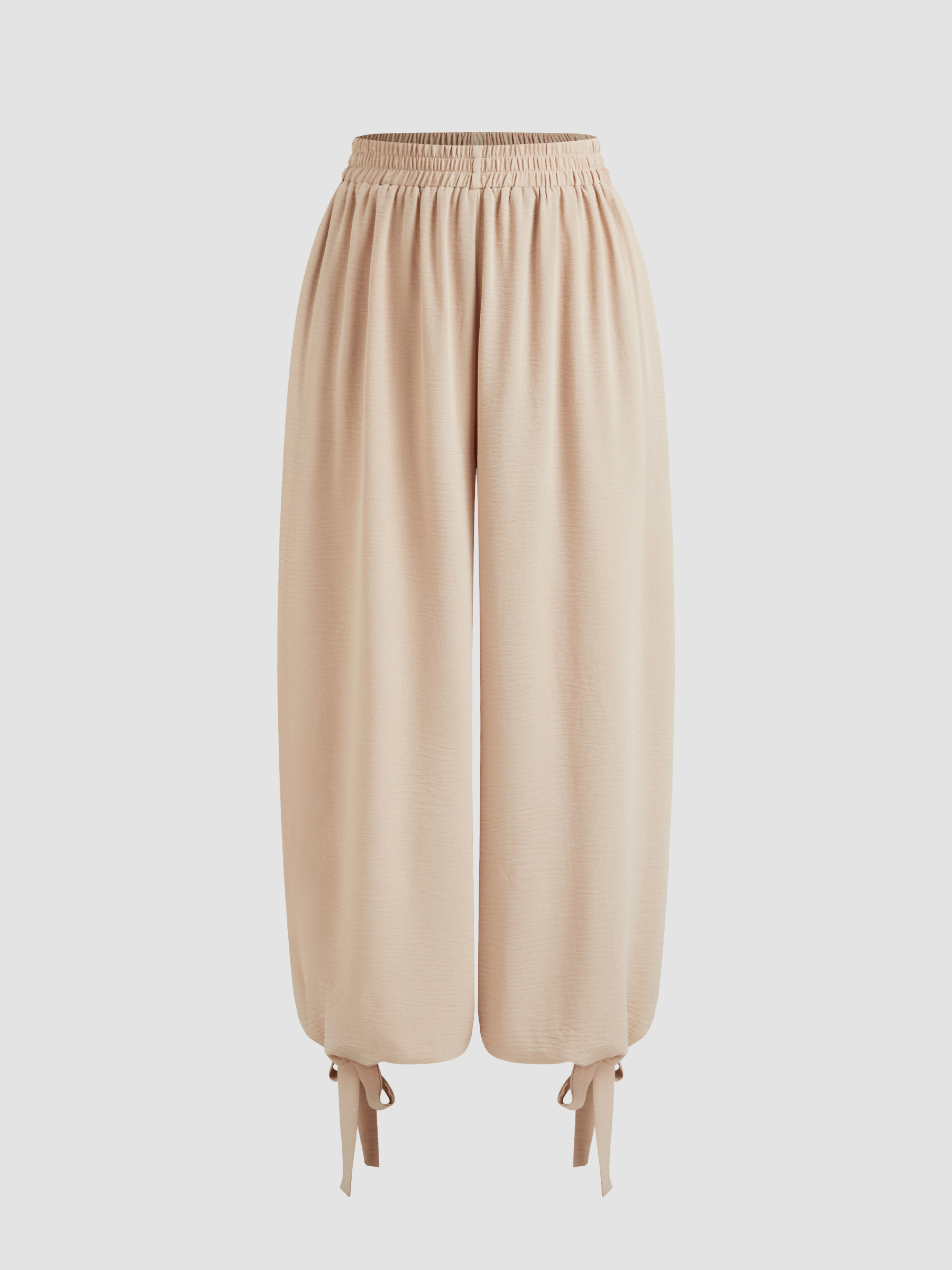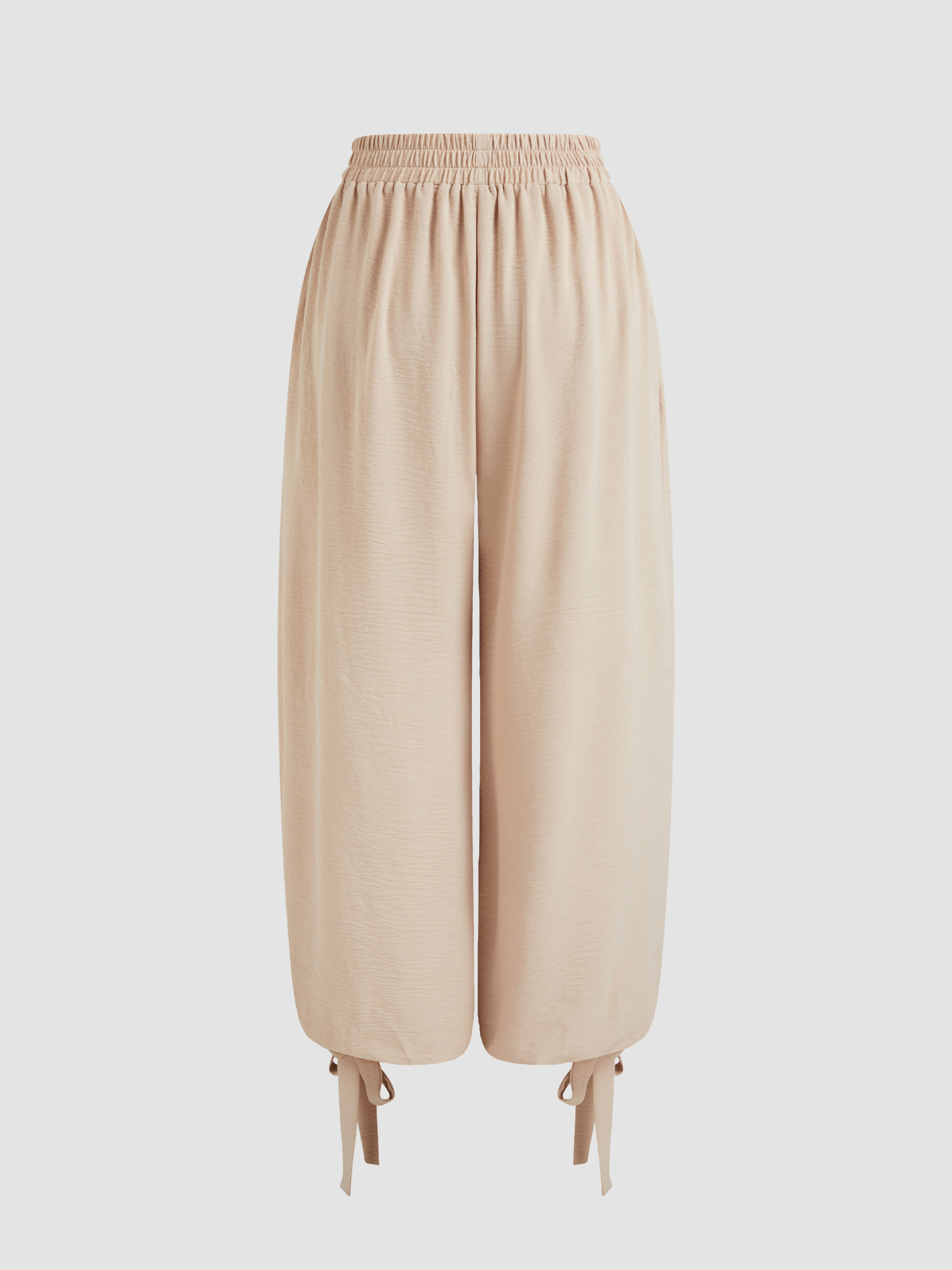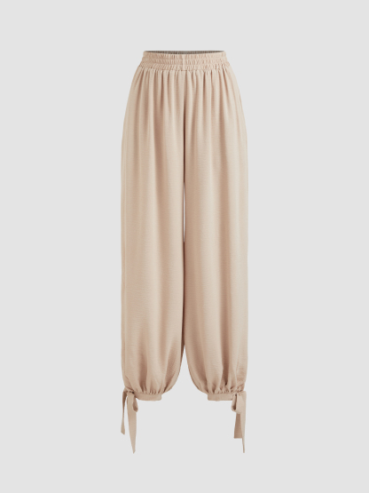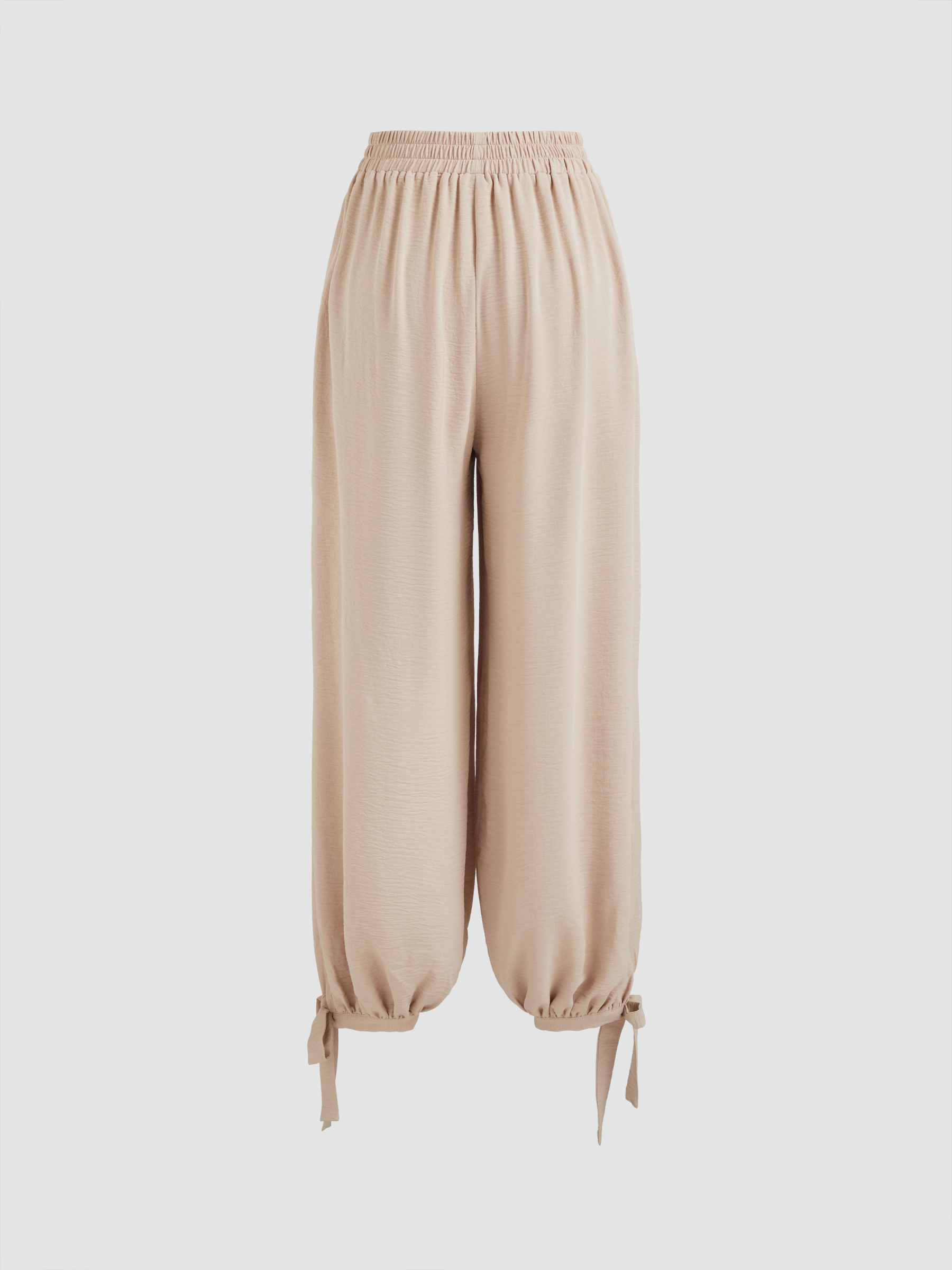 Composition: 100% Polyester Stretch: Slight Fit Type: Regular Fabric Thickness: Moderate Fabric Sheerness: Opaque Occasion: Vacation Pattern Type: Solid Waist Line: Mid Rise Lining: Unlined Pant Leg Style: Joggers Material: Woven Length: Long Pocket: Yes Clothing Detail: Elastic Waist, Knotted