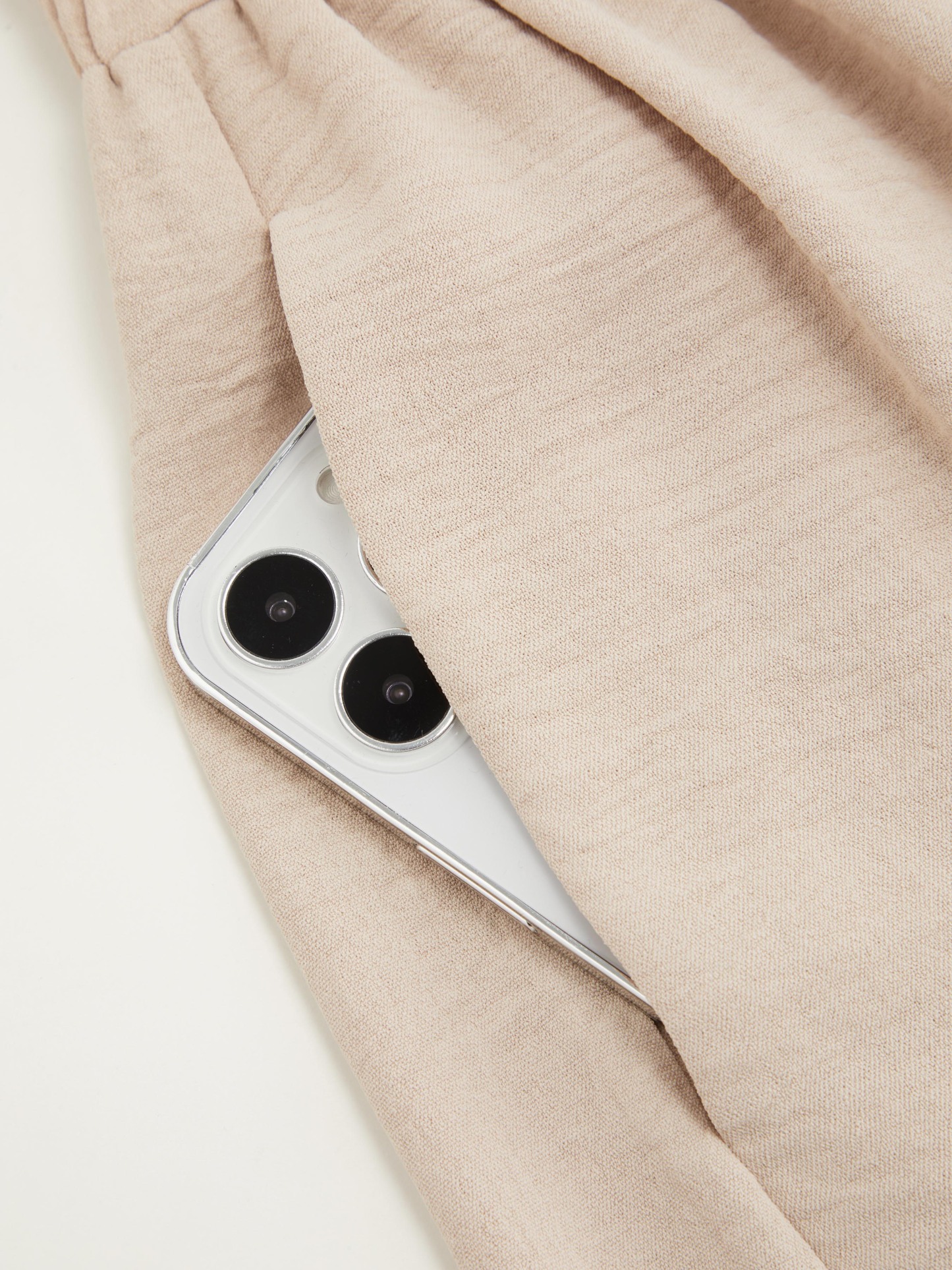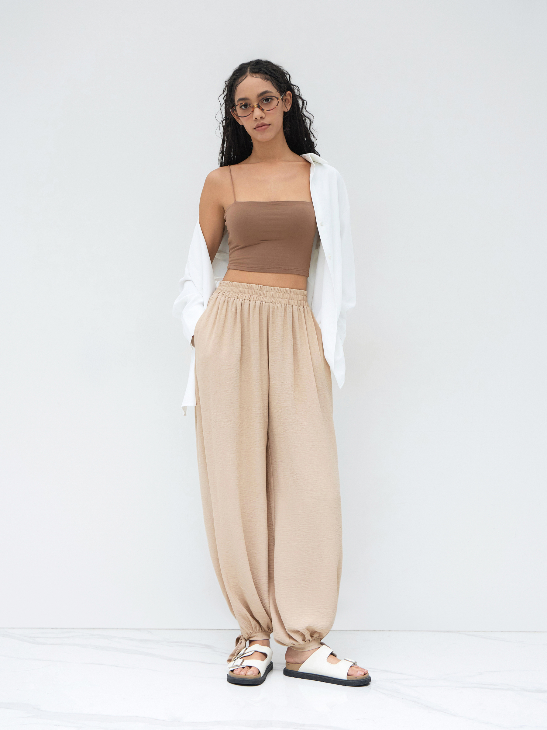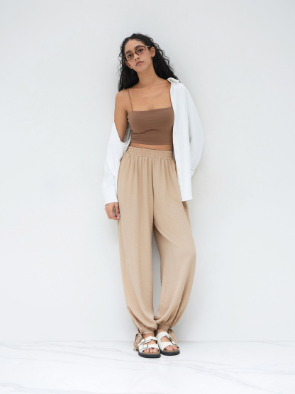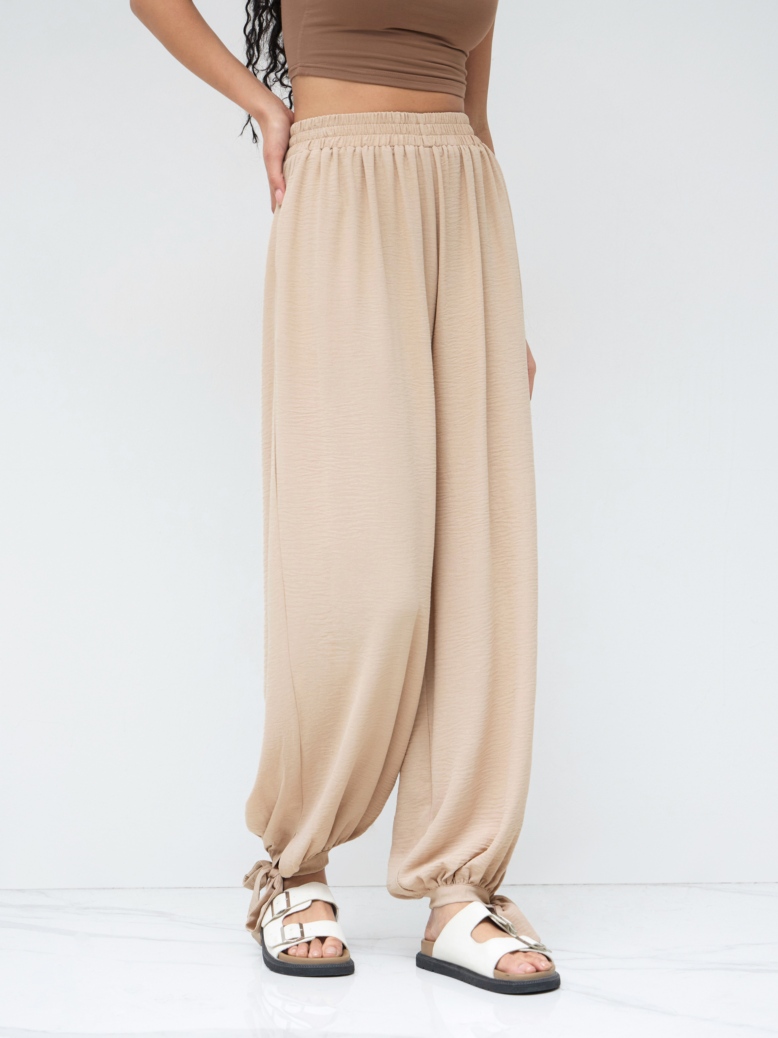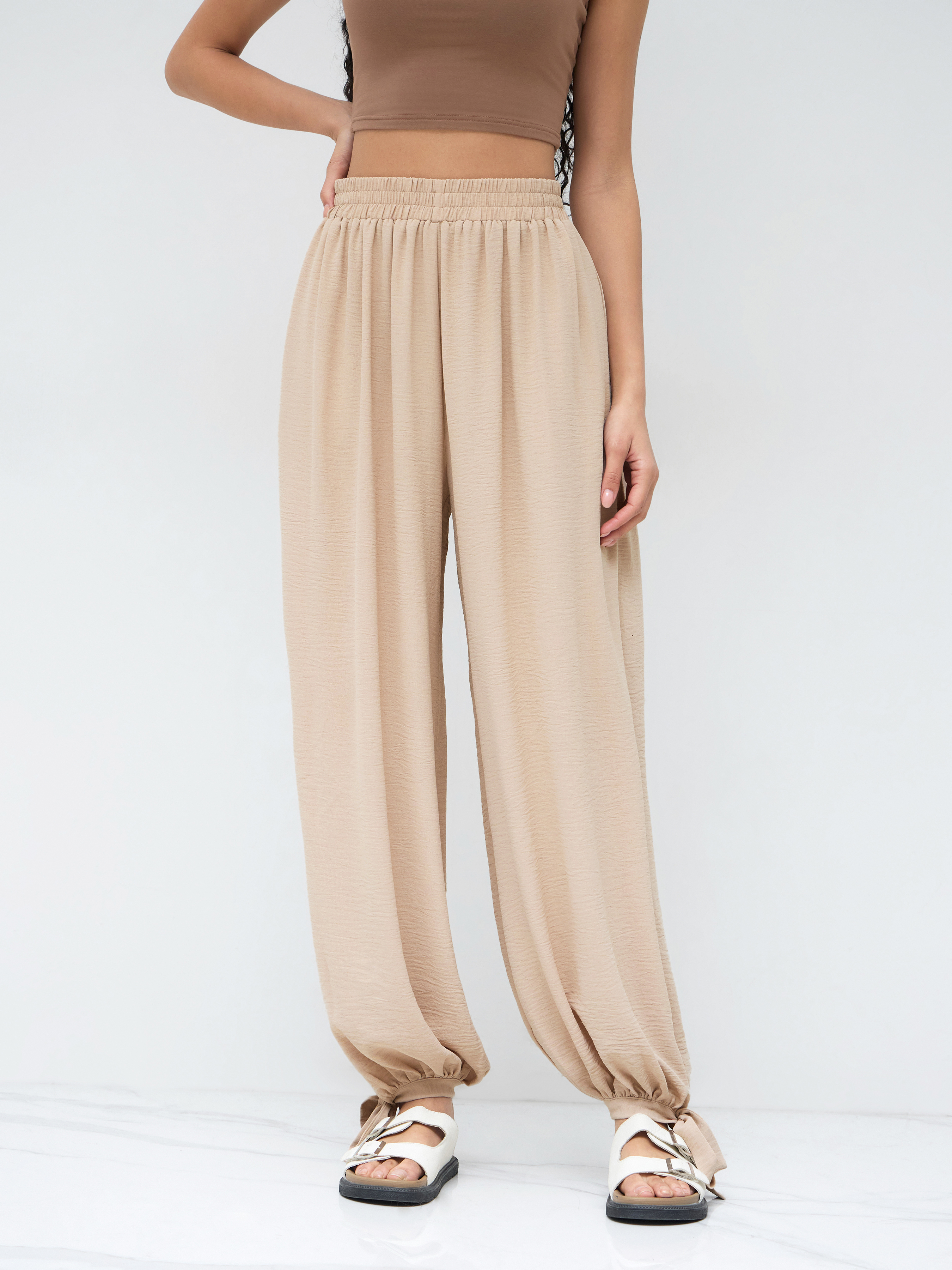 Composition: 100% Polyester Stretch: Slight Fit Type: Regular Fabric Thickness: Moderate Fabric Sheerness: Opaque Occasion: Vacation Pattern Type: Solid Waist Line: Mid Rise Lining: Unlined Pant Leg Style: Joggers Material: Woven Length: Long Pocket: Yes Clothing Detail: Elastic Waist, Knotted