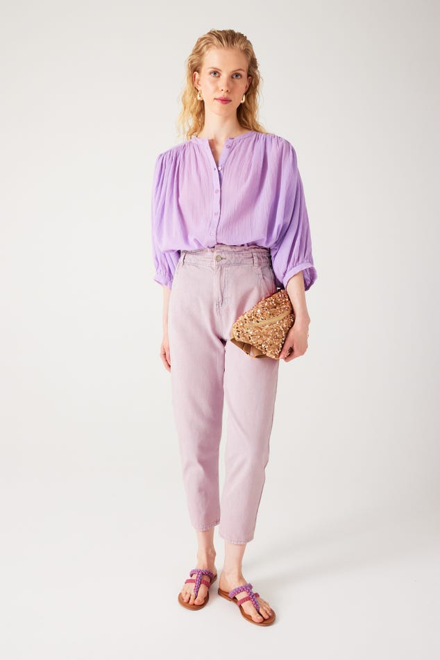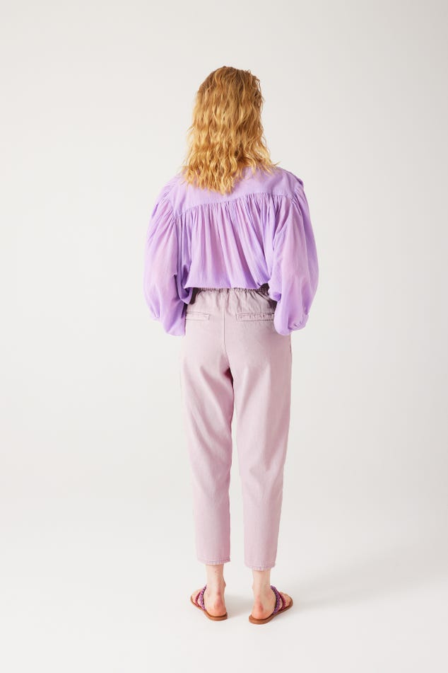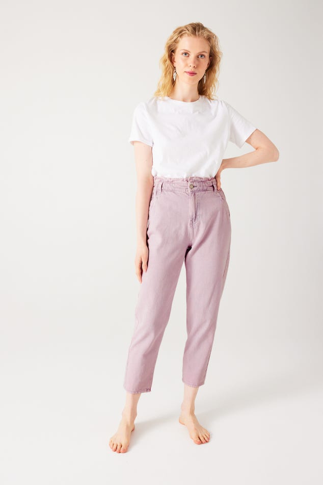 Le pantalon ballon est notre nouveau meilleur ami pour se composer une série de looks différents : en baskets, en talons, en sandales : voyez comme ça change tout ! Avec un sweat, un crop top ou une blouse : voyez comme c'est beau ! Taille haute élastiquée façon paper bag. Ouverture par bouton clou et zip. Passants. 2 poches devant, 2 fausses poches dos. Contient des fibres de coton recyclées.