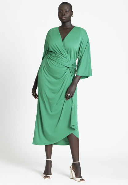 70% Modal, 30% PolyesterRelaxed bodice with close fit skirtUnlinedPull on with elastic at waistDolman sleeveHits at the ankleBody length on size 18 is 56" at the longestDraped frontStretch pique knitMachine wash cold gentle cycle with like colors. Only non-chlorine bleach when needed. Do not tumble dry. Lay flat to dry. Cool iron as needed.