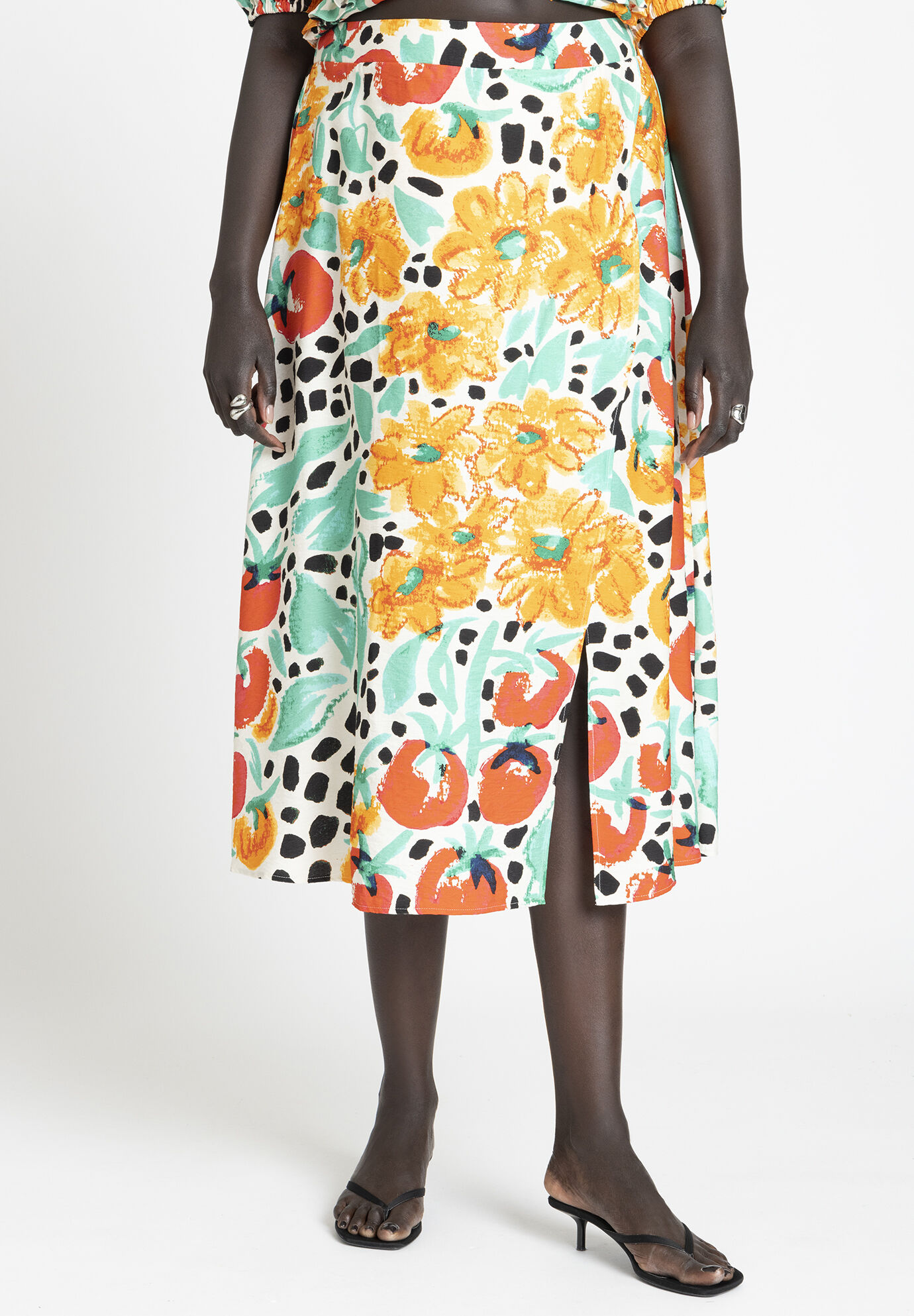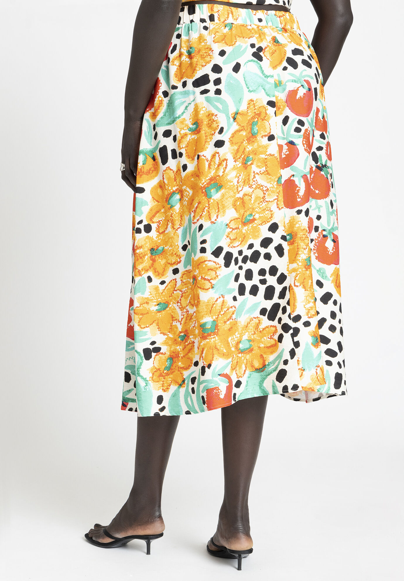70% Rayon, 30% NylonEasy fitPull onElastic at back waist onlyHits at the ankleSkirt length is 37"Slit at hemNon-stretch soft wovenFaux wrapMachine wash cold gentle cycle with like colors. Only non-chlorine bleach when needed. Tumble dry low. Cool iron as needed.