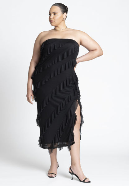 92% Polyamide, 8% SpandexClose fitFully linedStraplessMaxi length58"L from highest point of shoulder on size 18Slit at side seamHigh stretch meshMachine wash cold gentle cycle with like colors. Only non-chlorine bleach when needed. Do not tumble dry. Lay flat to dry. Cool iron as needed.