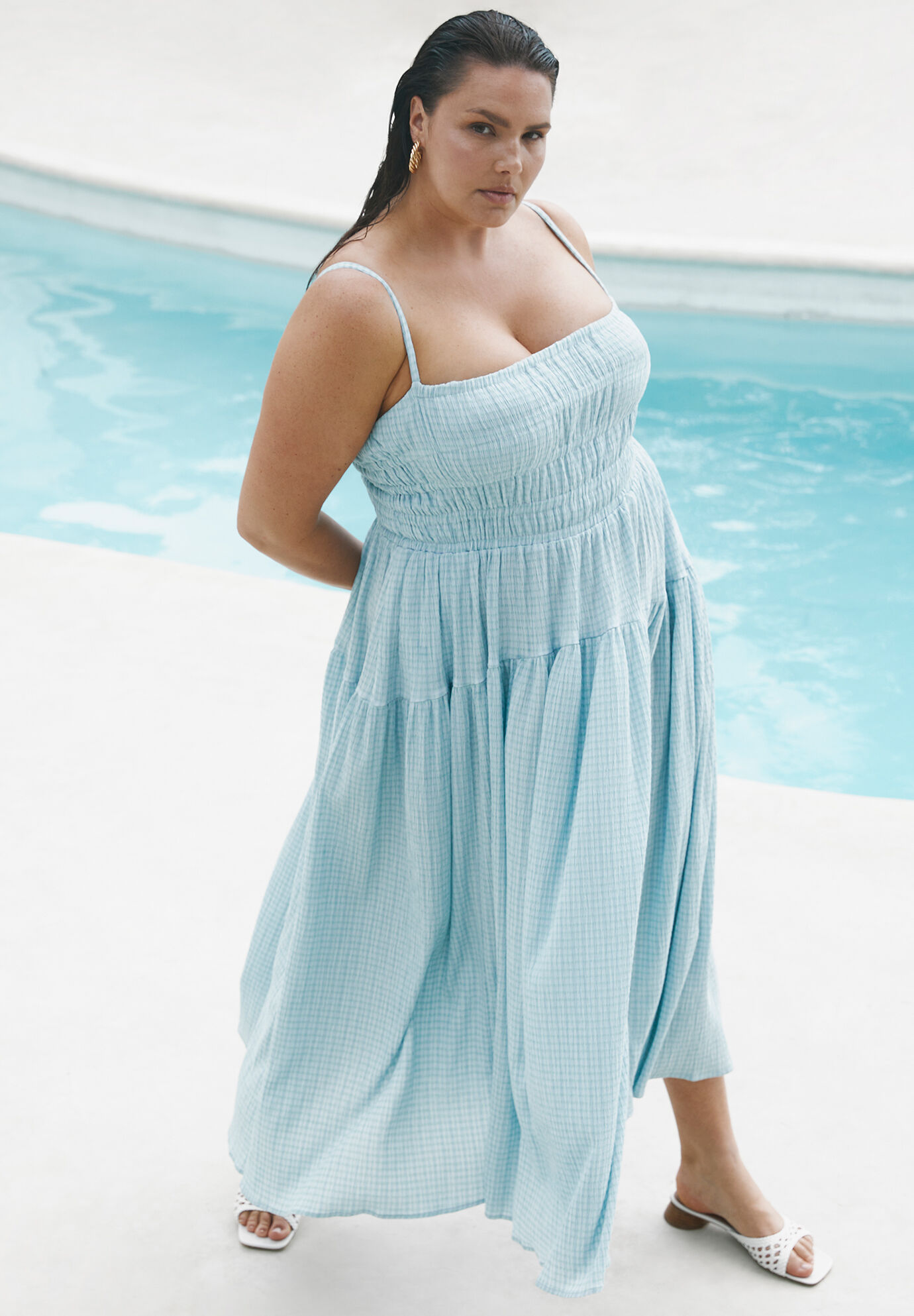 68% Polyester, 30% Cotton, 2% SpandexClose fit bodice with loose skirtBodice lined onlyPull OnMaxi lengthBody length on size 18 is 58"On-seam pocketsBottom skirt tier, Adjustable strapsNon stretch wovenEncased elastic tunnels on the bodiceMachine wash cold gentle cycle with like colors. Only non-chlorine bleach when needed. Tumble dry low. Cool iron as needed.