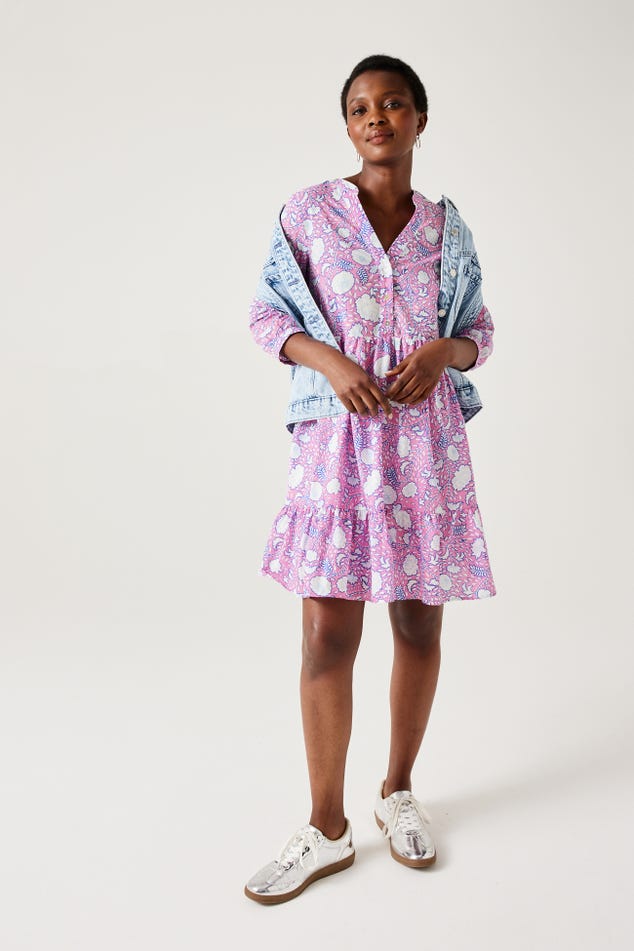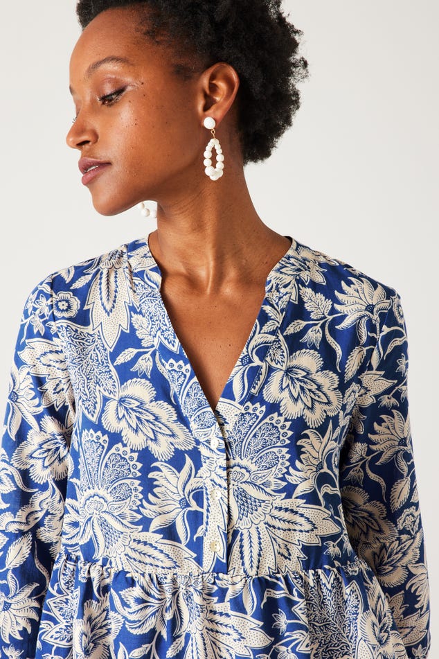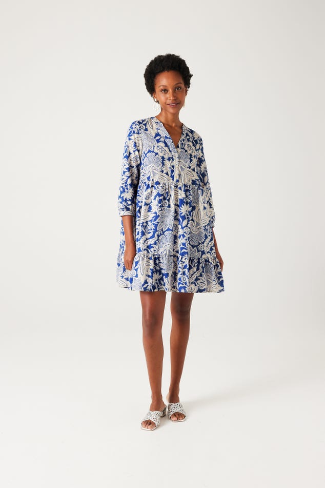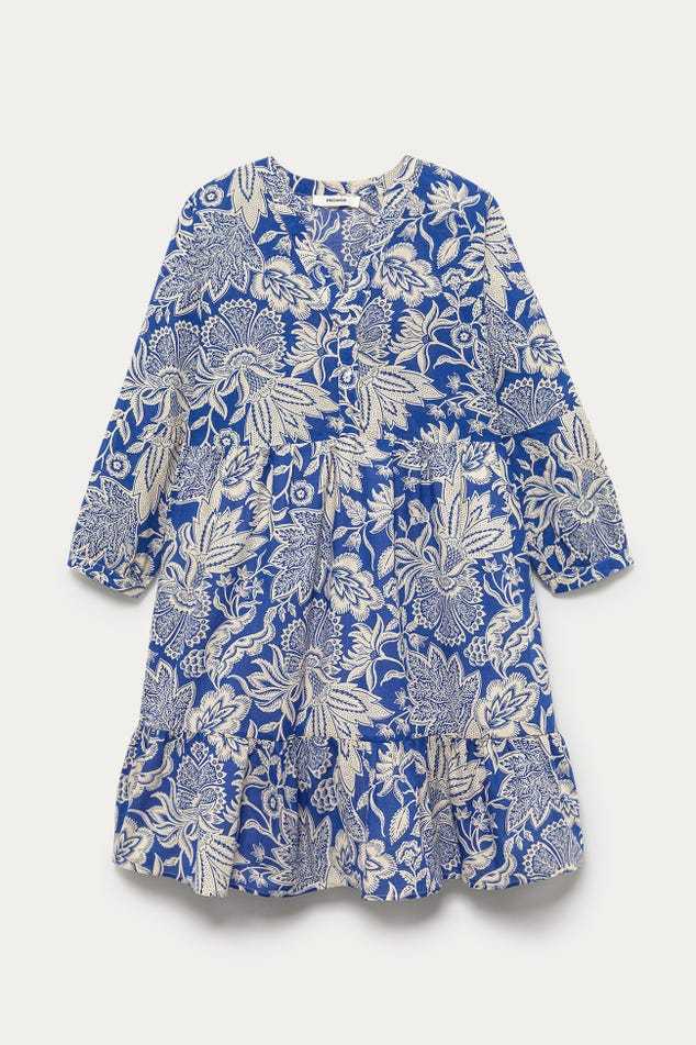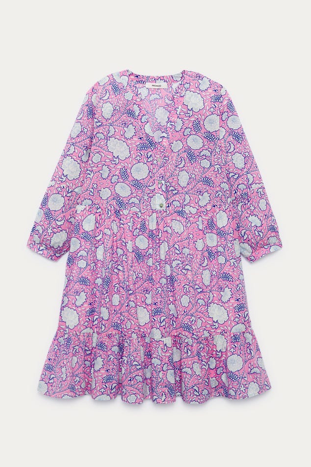 "Indiennes" - Ces imprimés floraux s'inspirent des motifs iconiques venus d'Inde et ont été revisités par les stylistes Promod. Ça donne à cette robe courte un charme particulier. Coupe évasée. Col tunisien boutonné. Manches 3/4 boutonnés. Doublure. Contient du coton issu de l'agriculture biologique, cultivé sans pesticides, ni engrais chimiques, ni OGM afin de préserver la biodiversité.