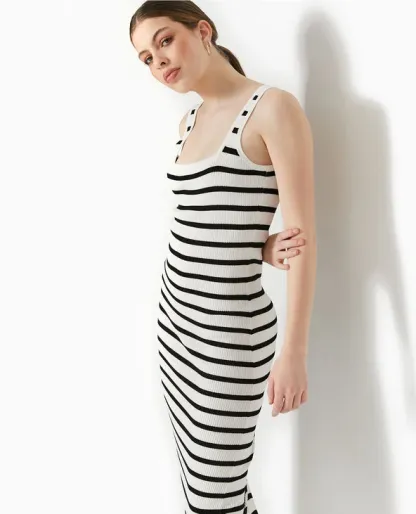 - Robe à bretelles longue et moulante en maille rayée blanc et noir.