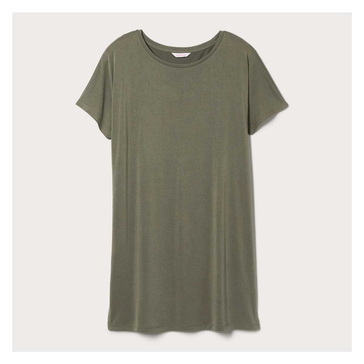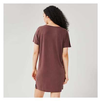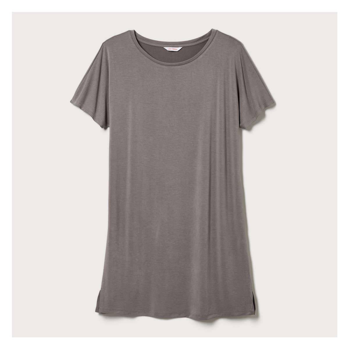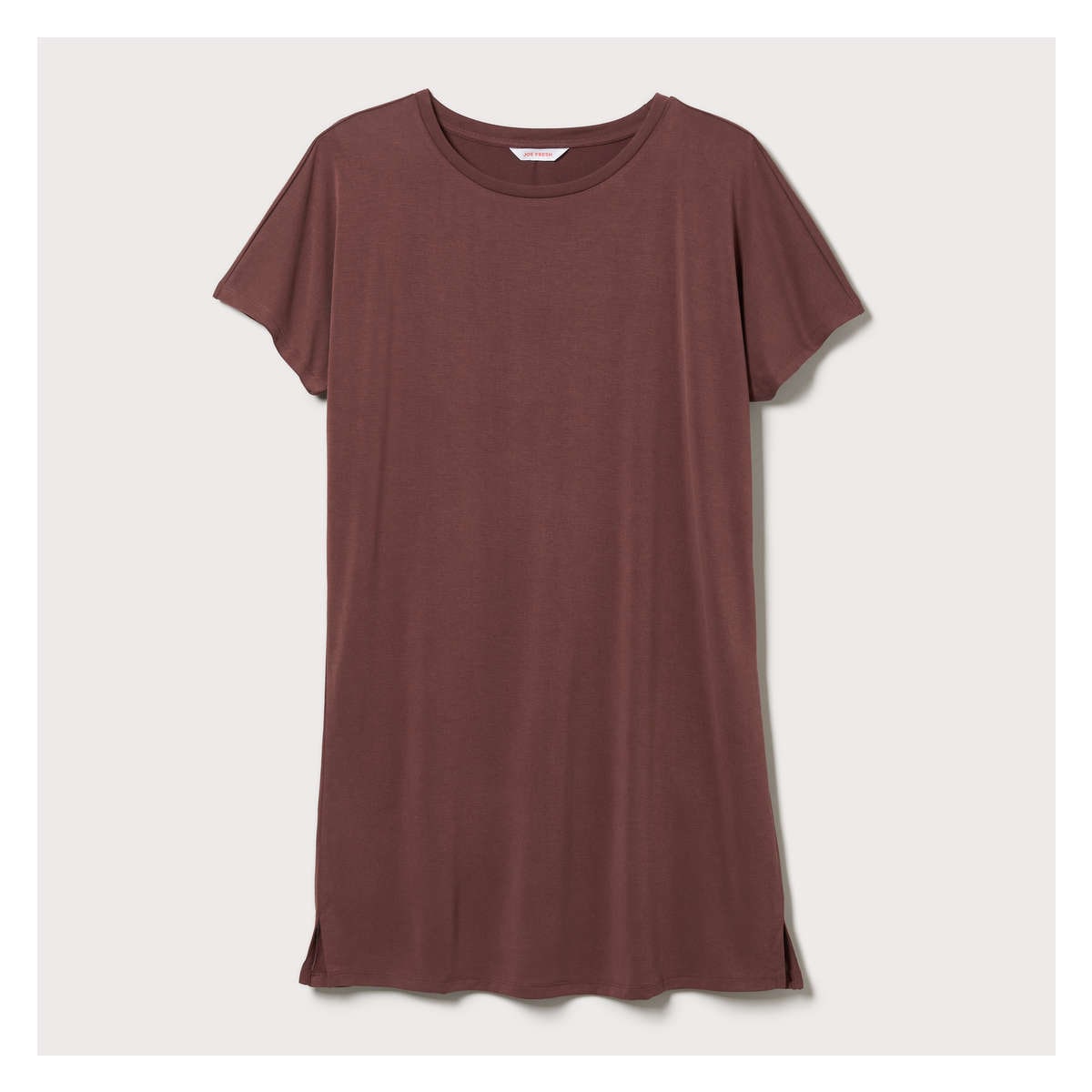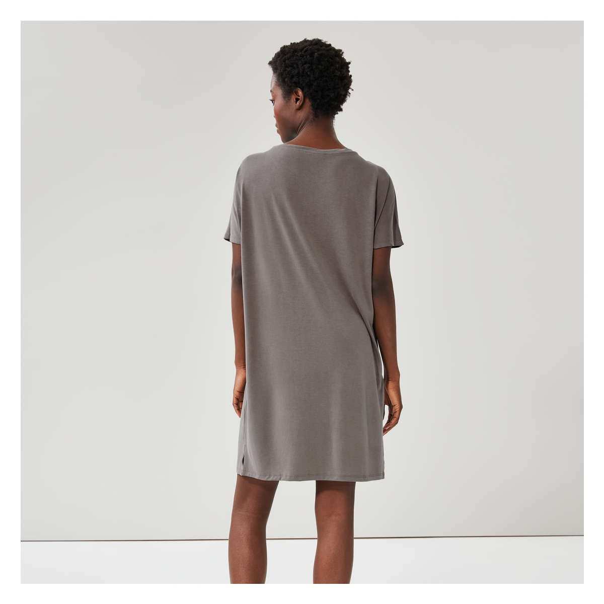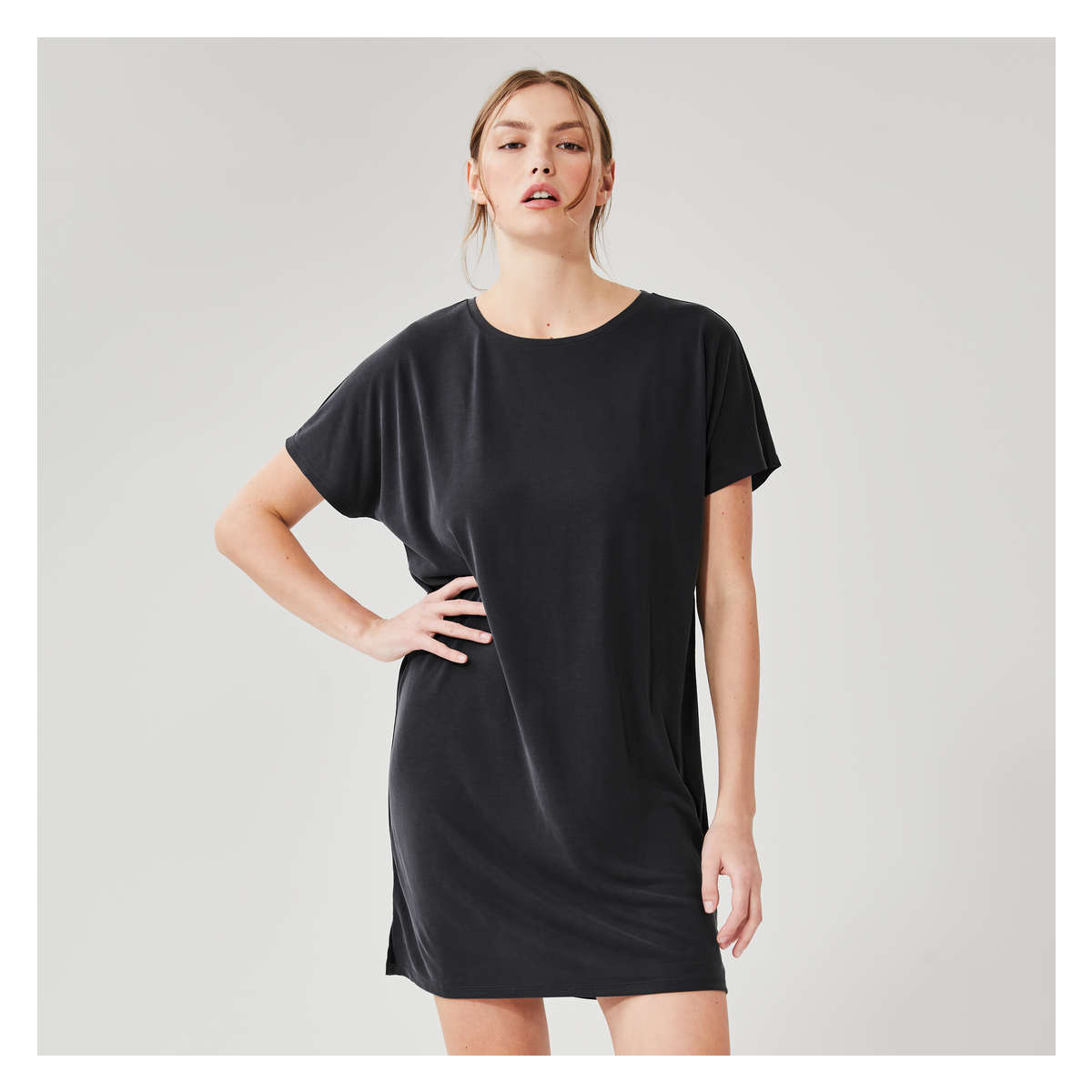 T-shirt dress with wide crew neck, dropped shoulders, side slits, and relaxed fit.