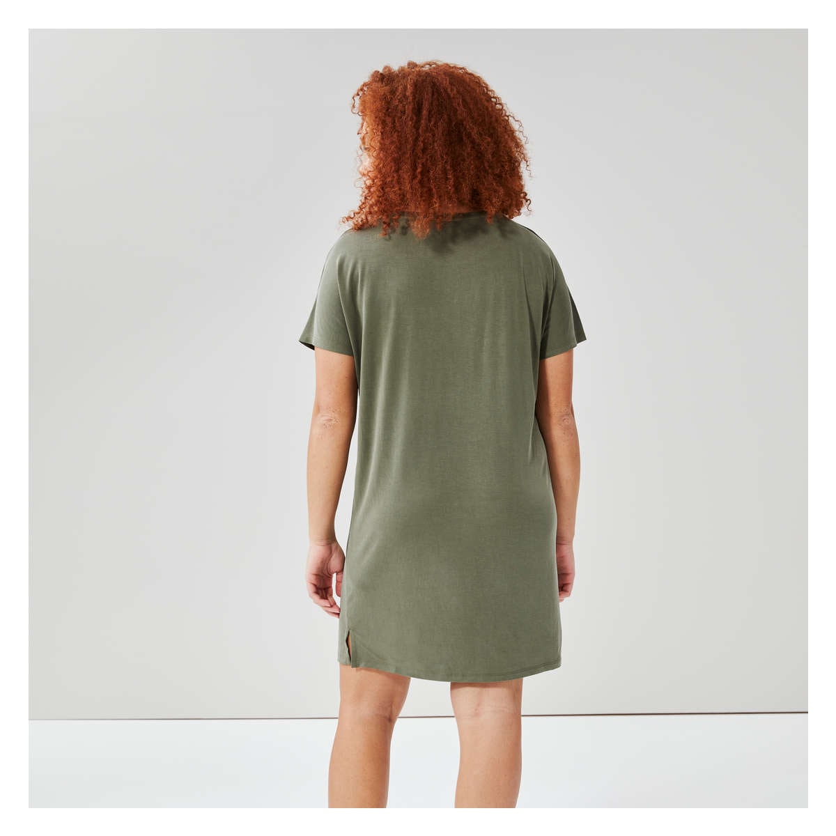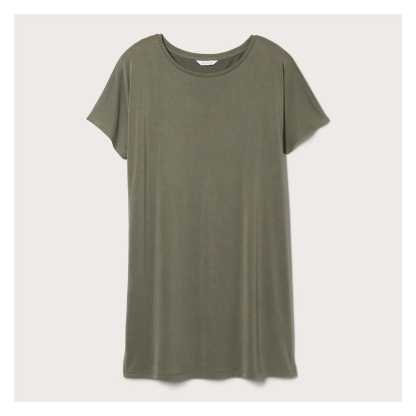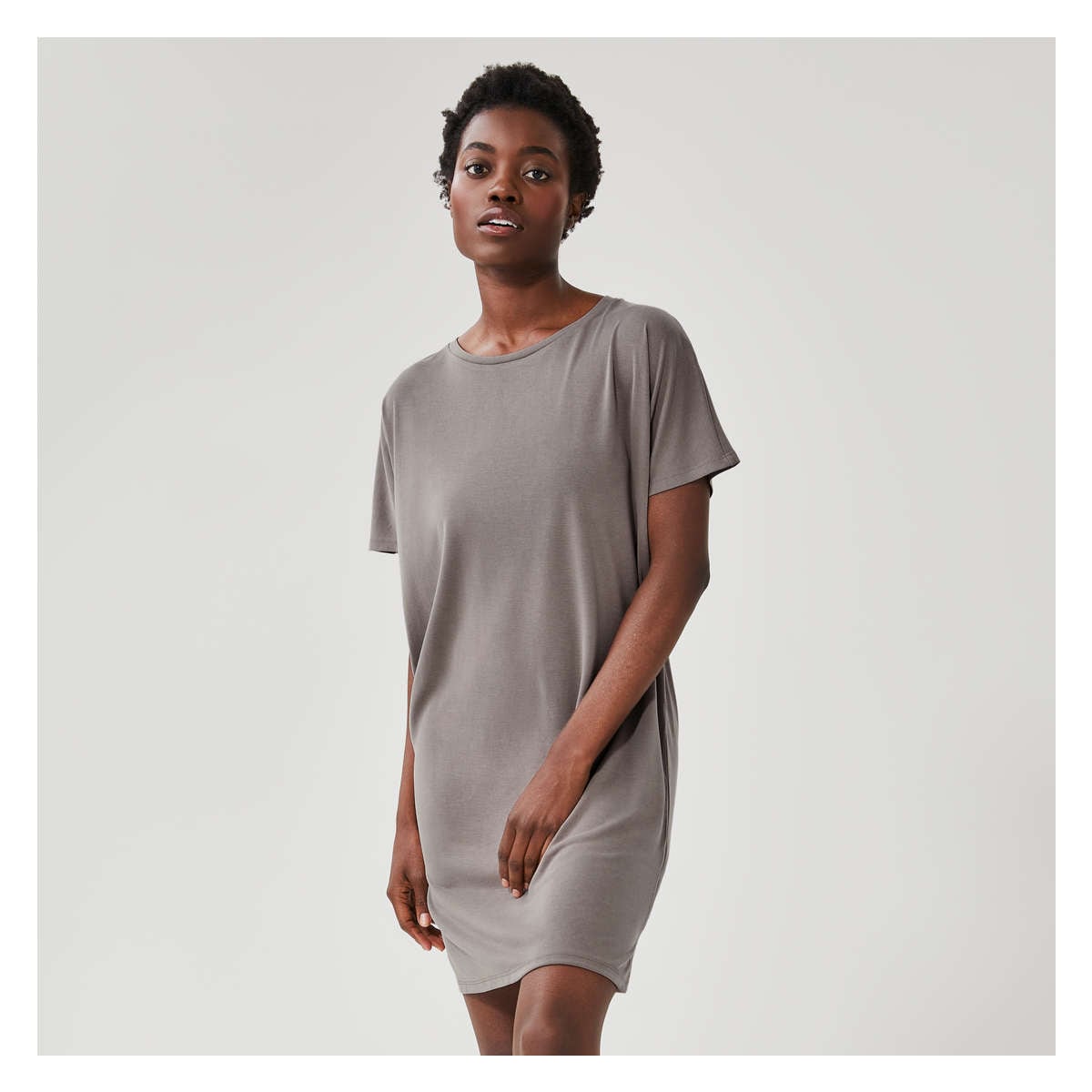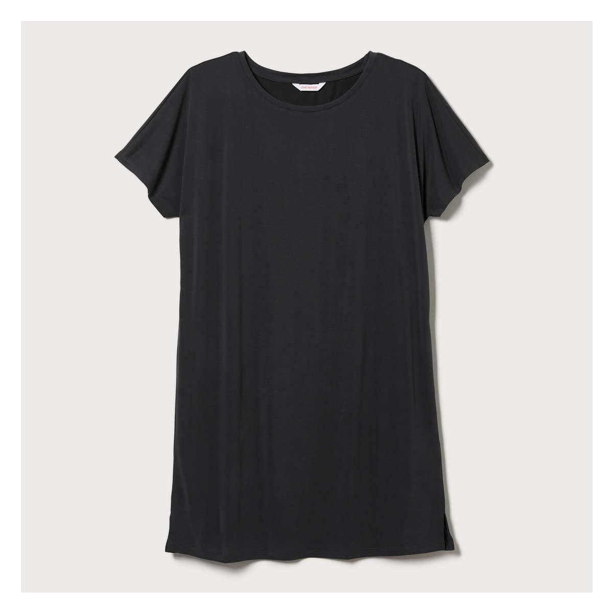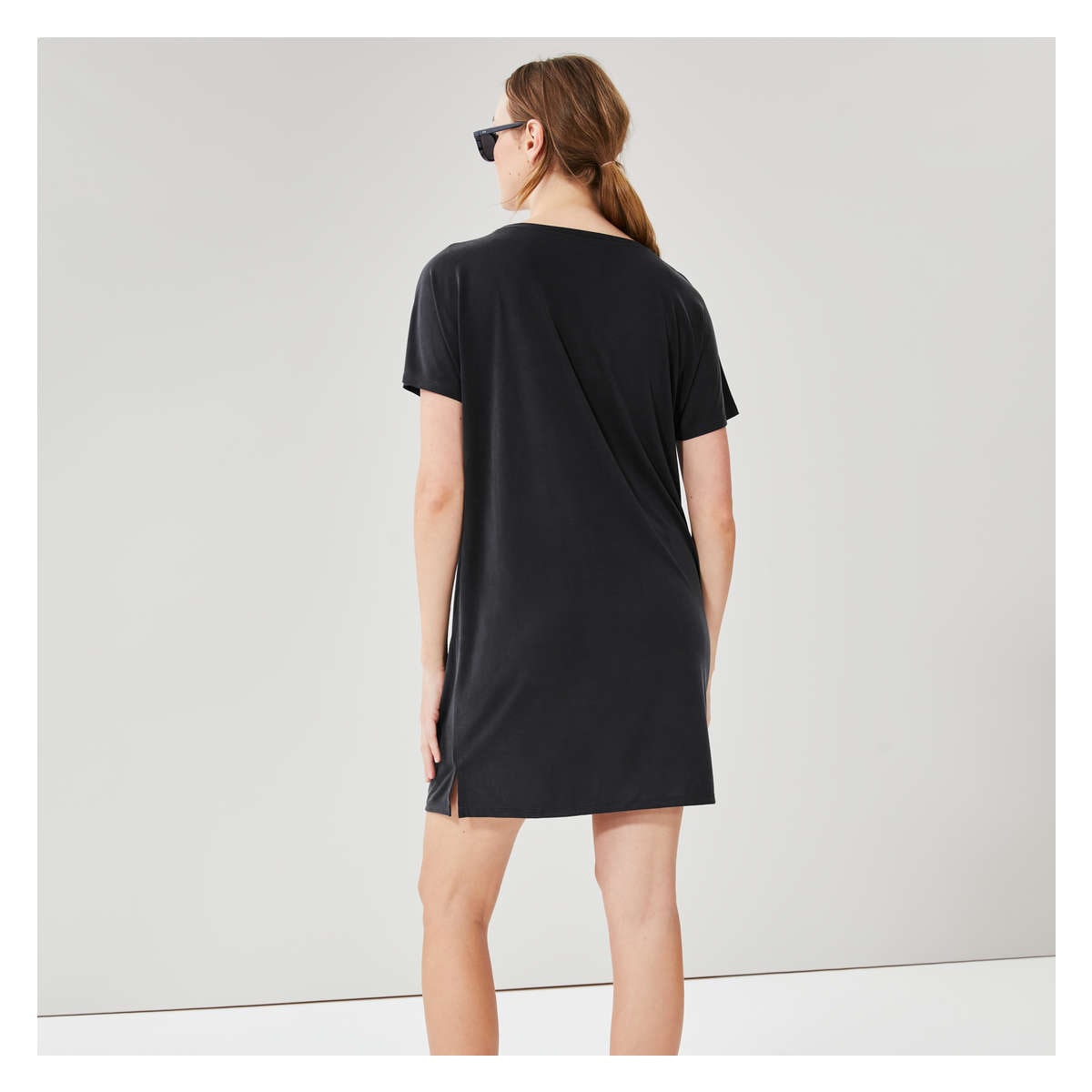T-shirt dress with wide crew neck, dropped shoulders, side slits, and relaxed fit.