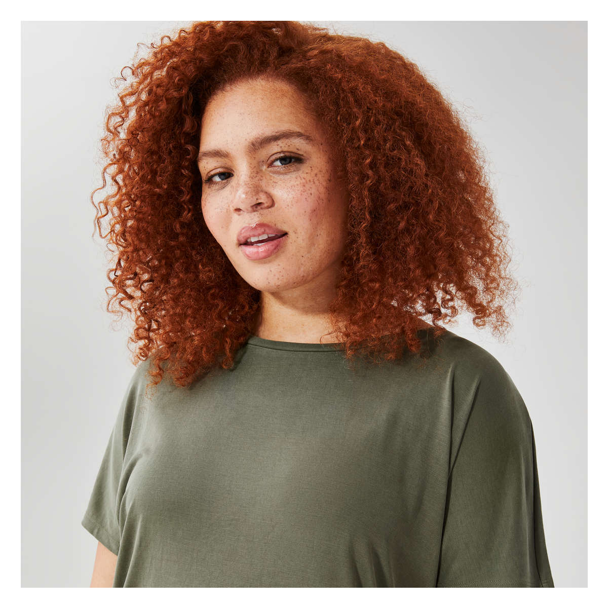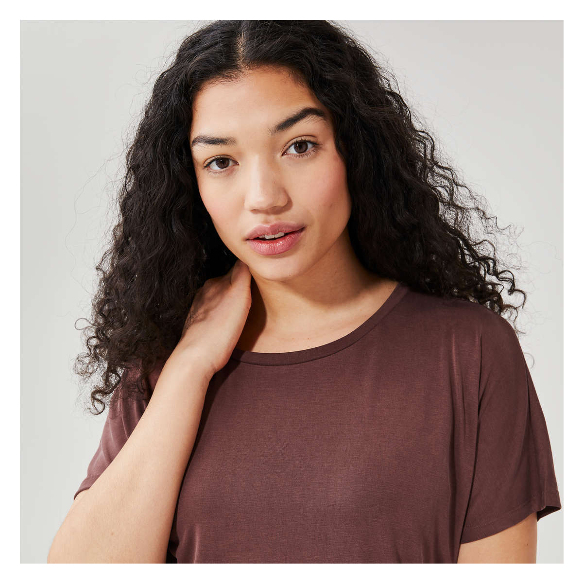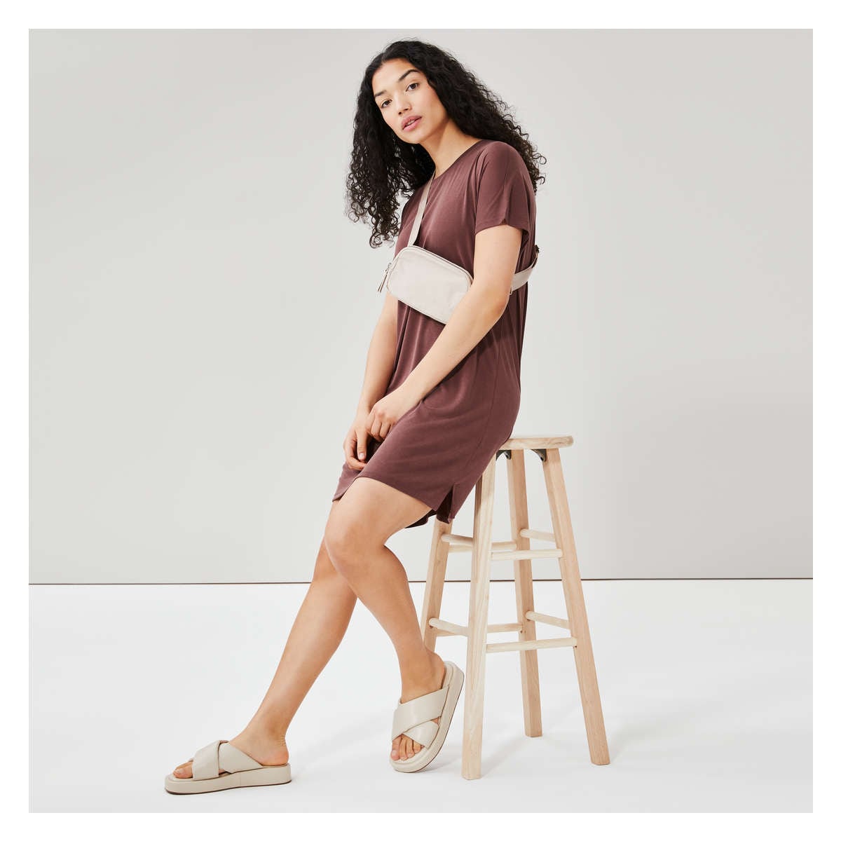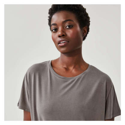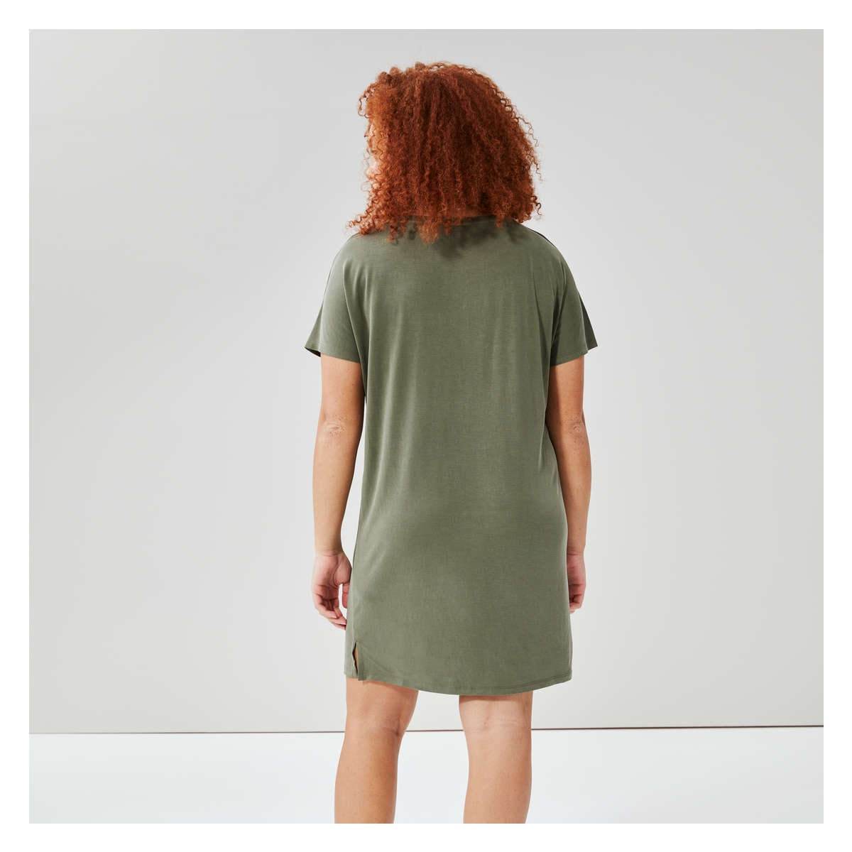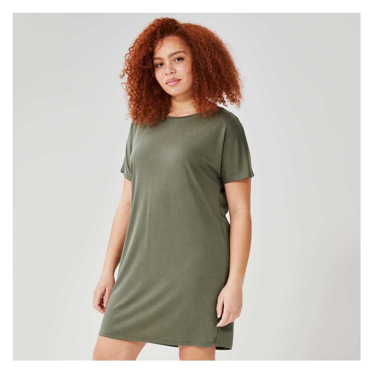 T-shirt dress with wide crew neck, dropped shoulders, side slits, and relaxed fit.